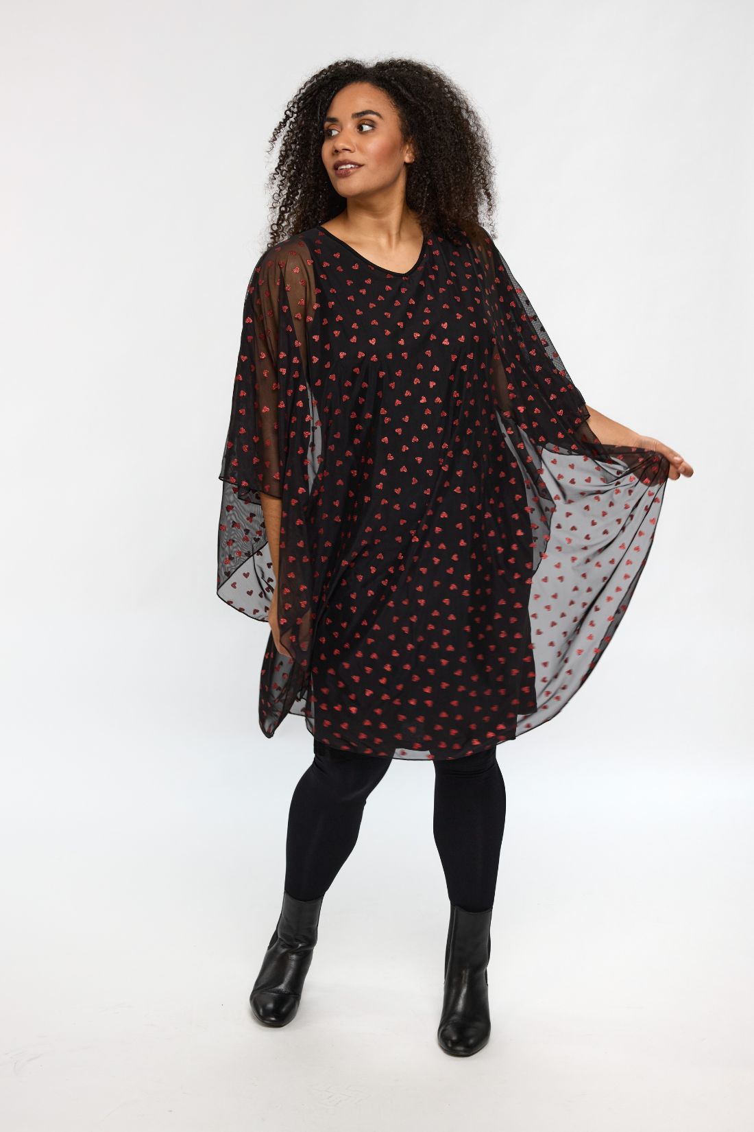 Smuk chiffonkjole fra Studio syet i det fineste sort chiffon med sølv eller rød hjerter.