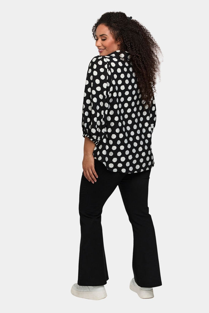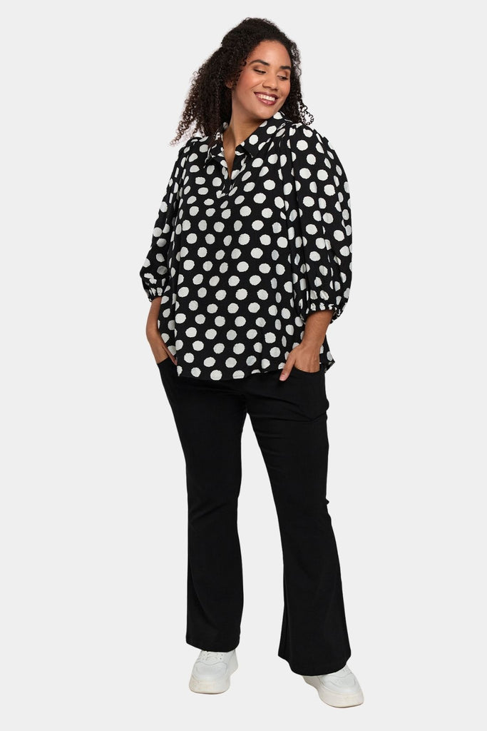 En stilren og komfortabel buks fra Studio, fremstillet i en lækker kvalitet med 75% viskose, 21% nylon og 4% elastan. Modellen har en normal pasform og en bred, behagelig pull-on linning, der sikrer en glat og ren silhuet under både toppe og bluser. Benene er let figursyede med markeret bootcut, som giver et feminint fald og flot balance i looket.