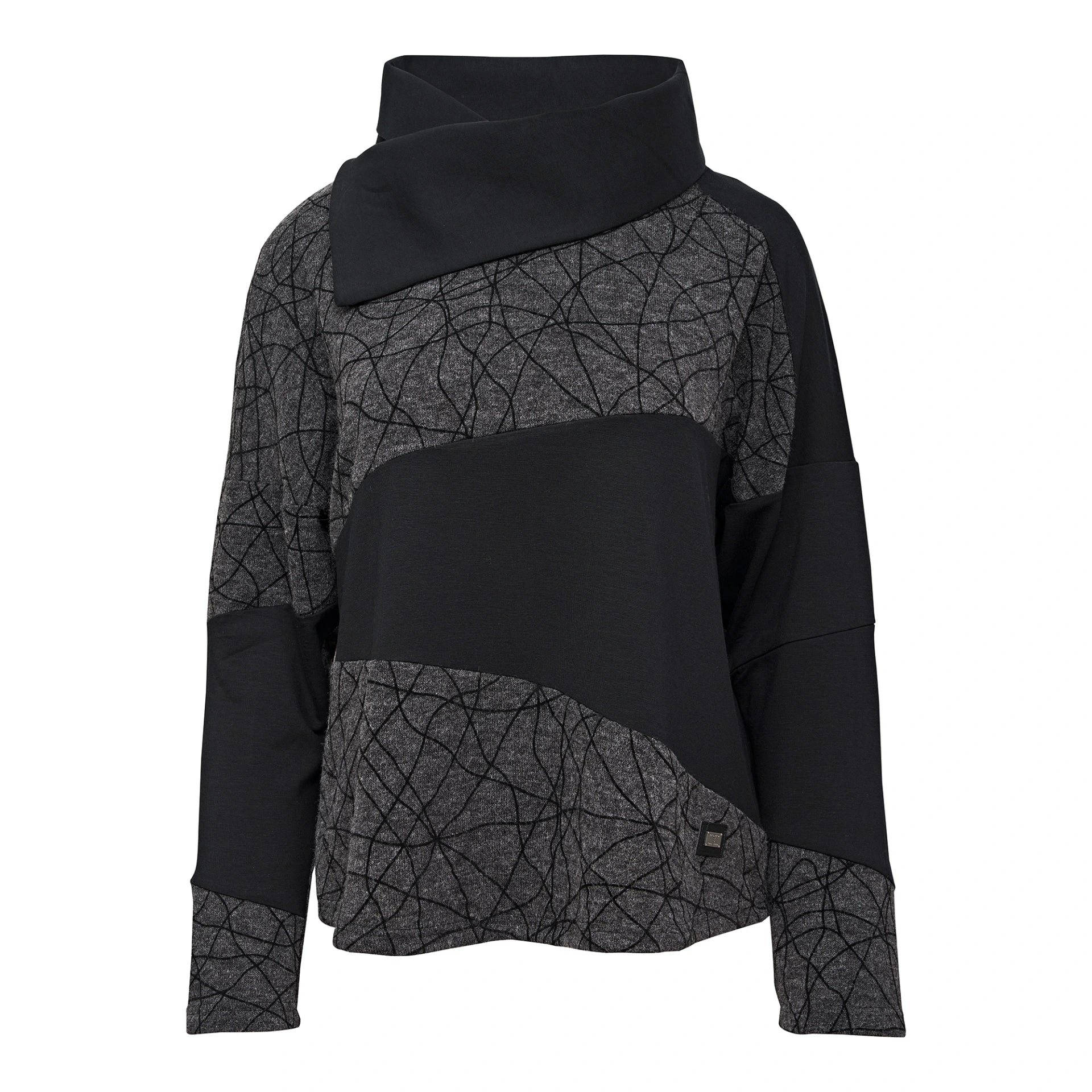 Smart og sporty bluse sammensat af to kvaliteter: bambusfleece og jacquardmønstret strik. Blusen er løstsiddende med lange ærmer og en unik krave. Der er mange overskæringer både foran og bagpå blusen.