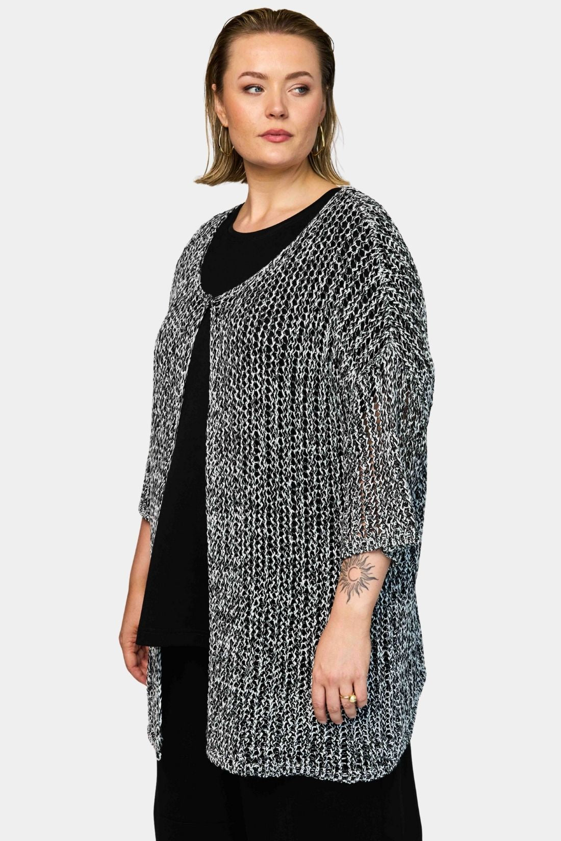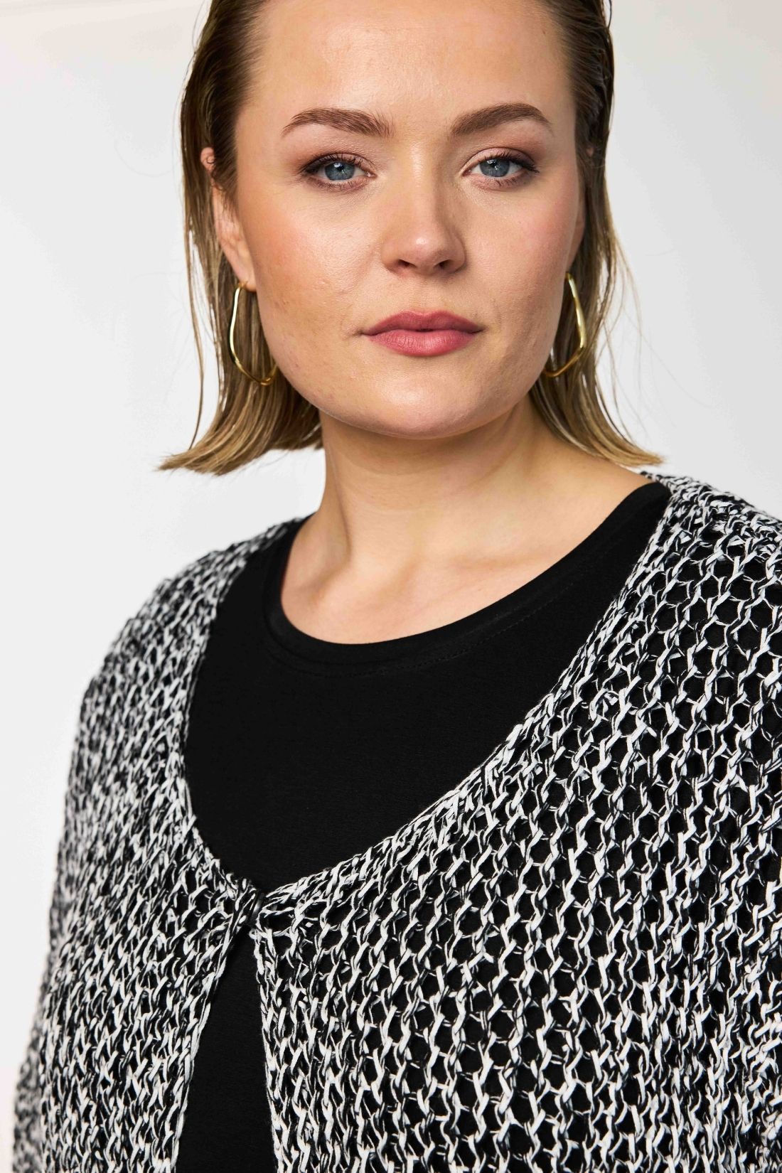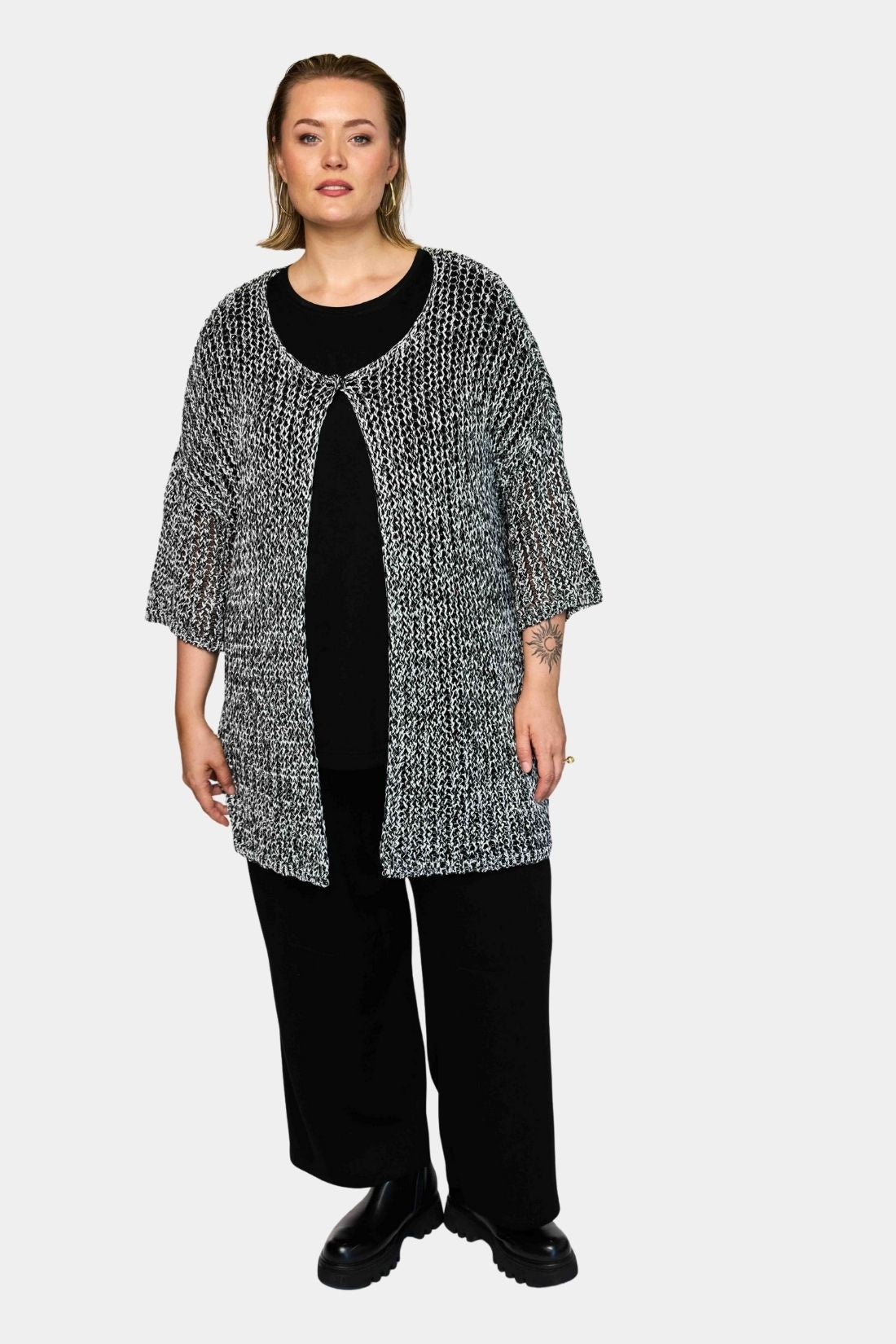 En lang åben cardigan fra Gozzip Black med et afslappet og afbalanceret udtryk der er nem at bruge i hverdagen. Den lige og rummelige silhuet falder blødt omkring kroppen, mens det grafiske strikmønster i sort og hvid giver et flot og markant look uden at virke tungt.