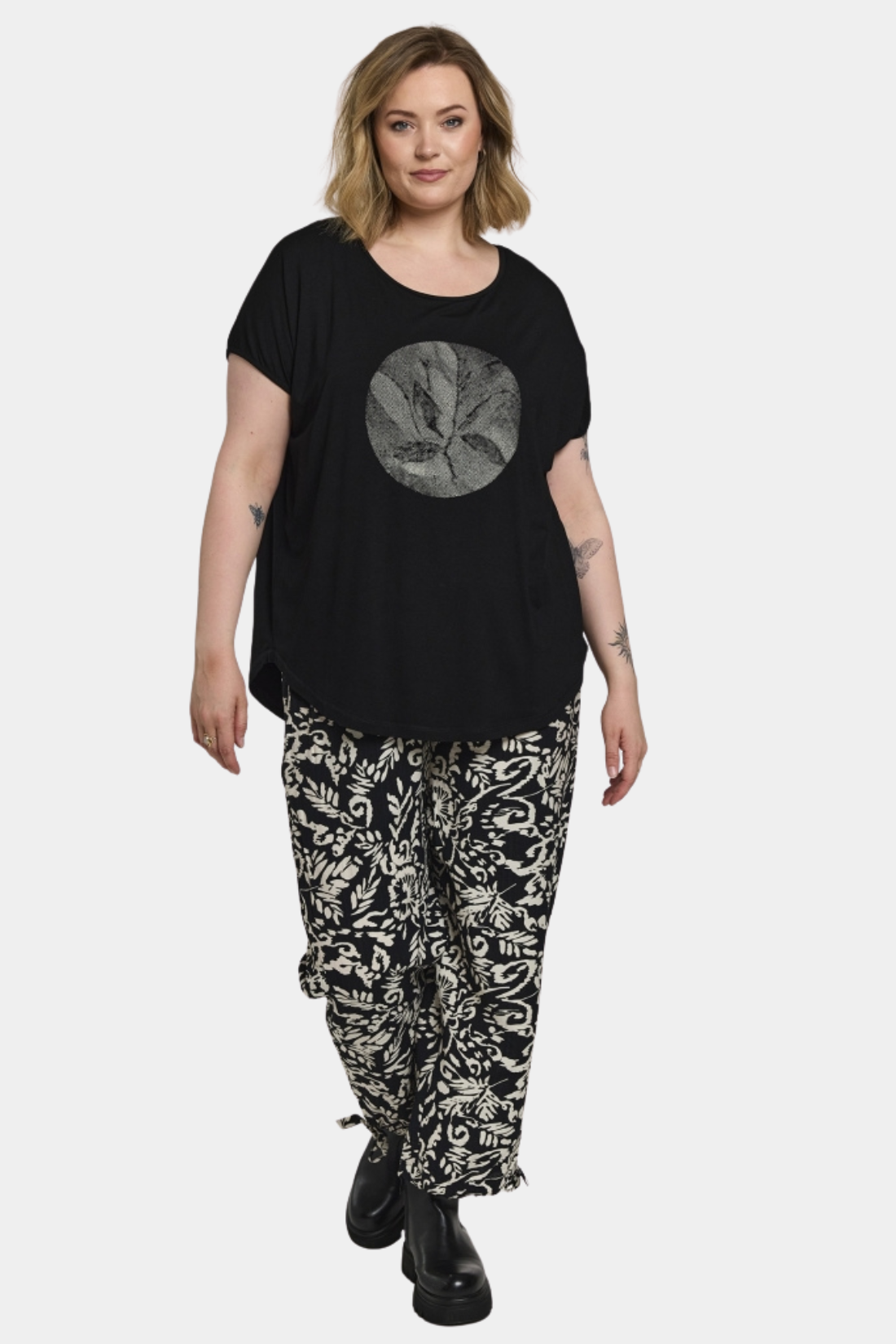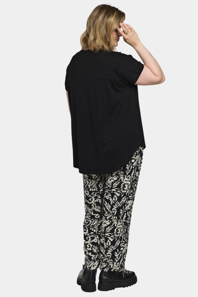 Lette og behagelige bukser fra Gozzip, designet i en blød viskose-/nylonblanding med et stilrent sort/hvidt grafisk print. Modellen har en afslappet, lige benform med god vidde og en komfortabel elastisk linning, der giver et fleksibelt og ubesværet fit. Bindebåndene ved benafslutningen tilfører et moderne twist og gør bukserne nemme at style – enten som statement-piece eller sammen med en matchende overdel.
