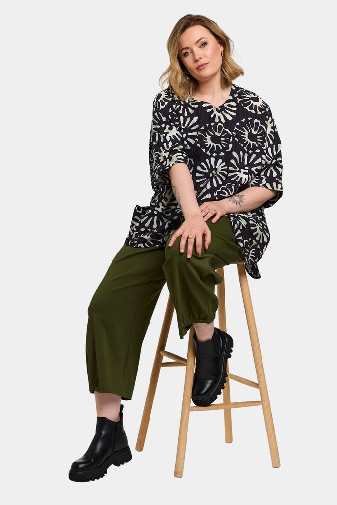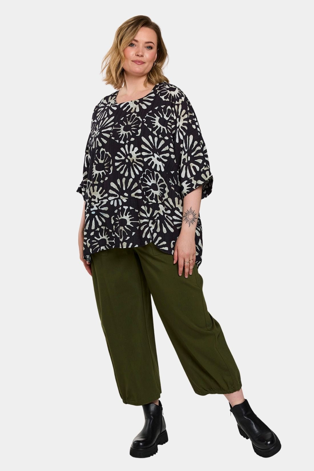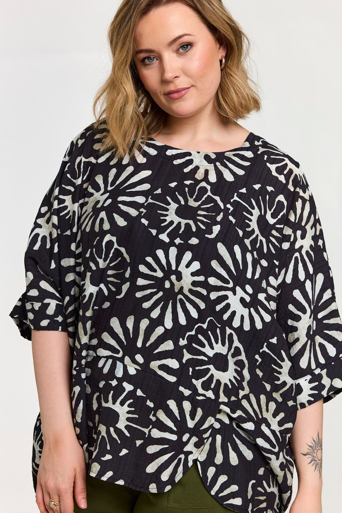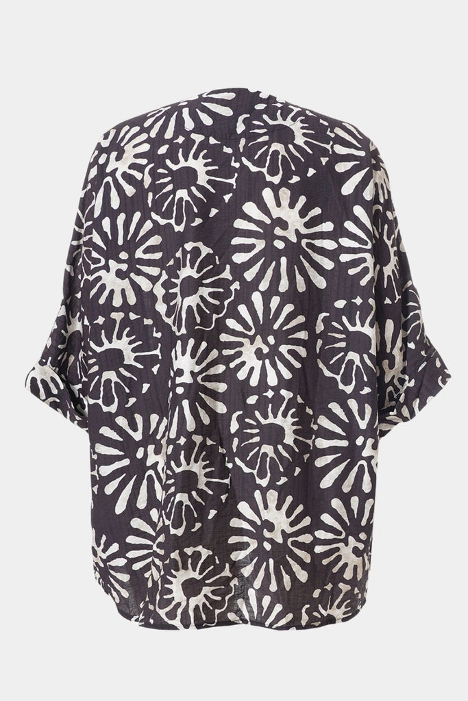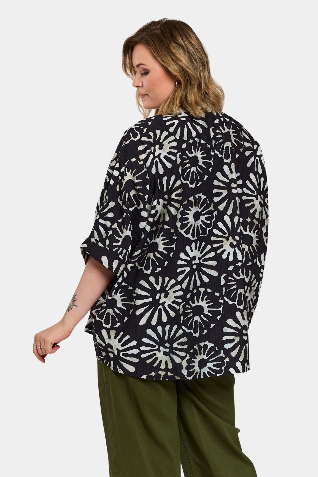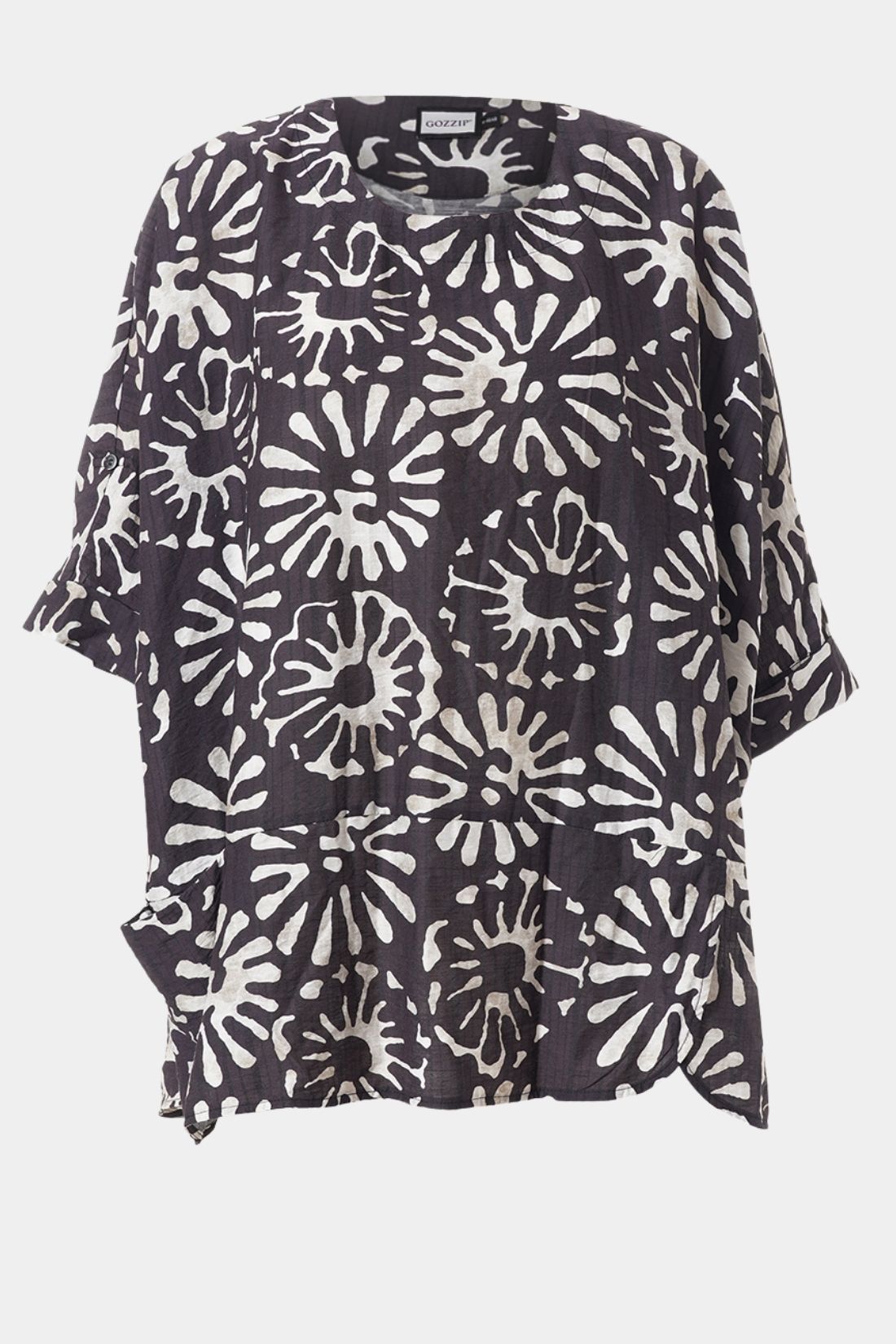 En let og rummelig oversize bluse fra Gozzip, fremstillet i en blød viskose-/nylonblanding med et moderne grafisk all-over print i sorte og lyse toner. Modellen har en bred og behagelig silhuet med 3/4-ærmer og rund halsudskæring, som falder naturligt om kroppen og giver fri bevægelighed. Den lette struktur i materialet understreger blusens afslappede og stilfulde udtryk.
