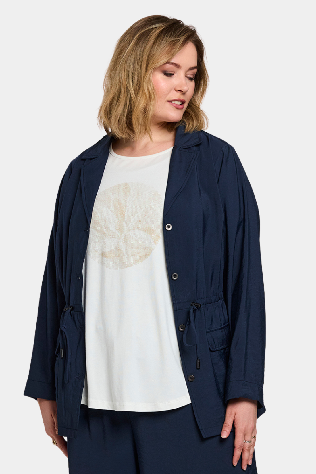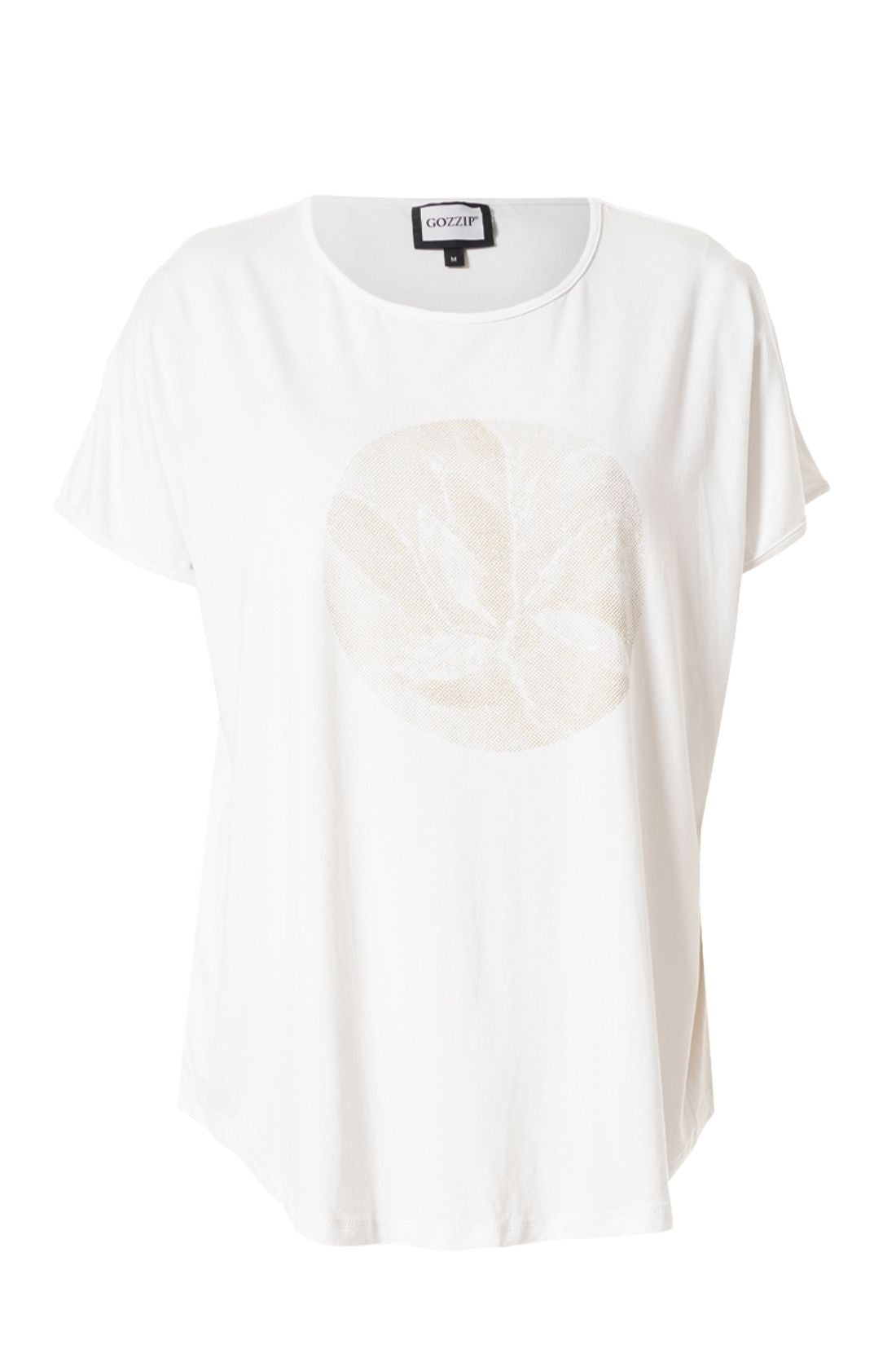 Gozzips populære Gitte T-shirt er designet i en blød og strækbar viskosekvalitet, som giver høj komfort og et flot, glat fald. Det markante cirkulære frontprint tilføjer et moderne og feminint udtryk, mens den afslappede pasform og runde hals gør T-shirten perfekt til både hverdagsbrug og lag-på-lag styling. Modellen har en diskret afrundet bund, der er kortere foran end bagtil, hvilket giver et let og flatterende fald.