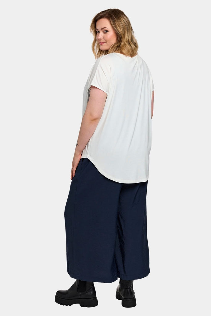 Den bløde og fleksible viskoseblanding giver en åndbar og strækbar T-shirt, der er behagelig at have på hele dagen – et perfekt basis-item med ekstra kant.