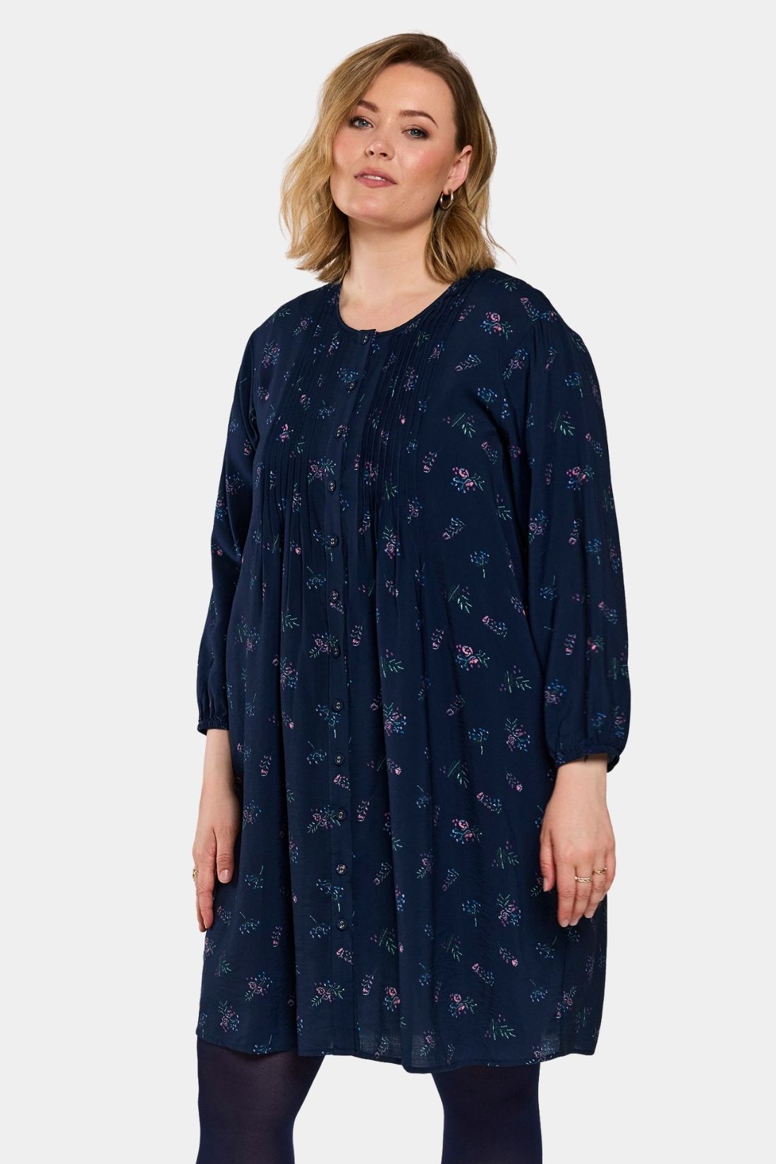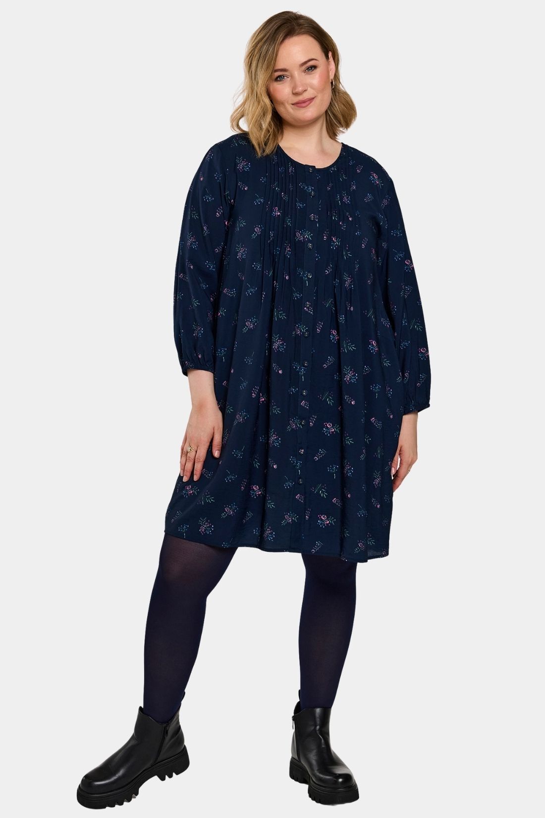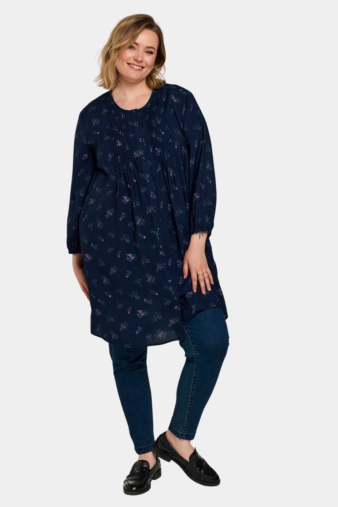 Johanne er en af Gozzips mest populære tunikaer – en let og feminin skjorte-tunika i en blød viskoseblanding med smukt navy print i lyse nuancer. Modellen har rund hals med gennemgående knaplukning samt 3/4-ærmer med elastisk afslutning, som giver et afslappet og let udtryk. De mange læg over brystet og i ryggen skaber smuk volumen og et behageligt fald, mens den lige, løse pasform og afrundede kant gør tunikaen ekstra flatterende.