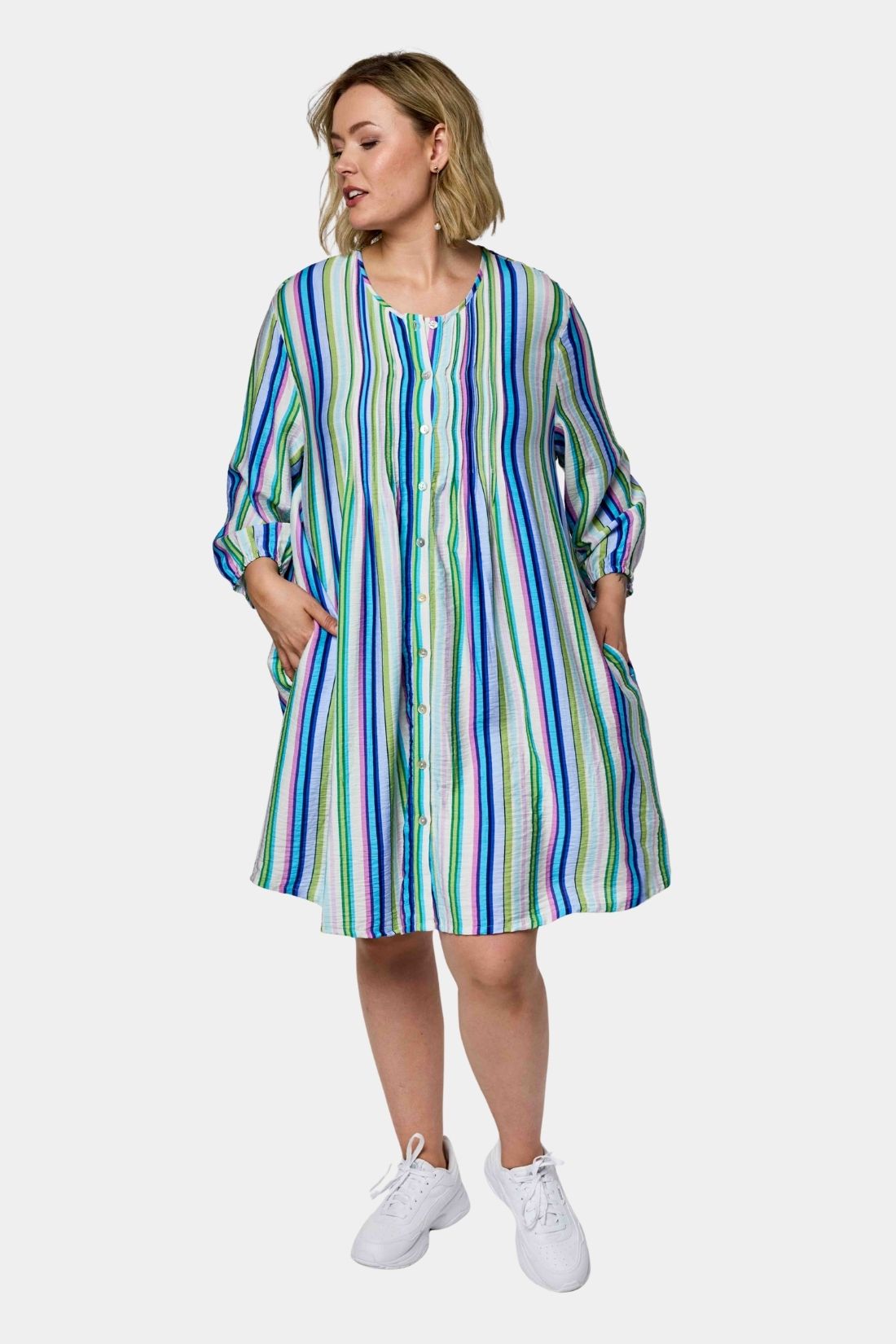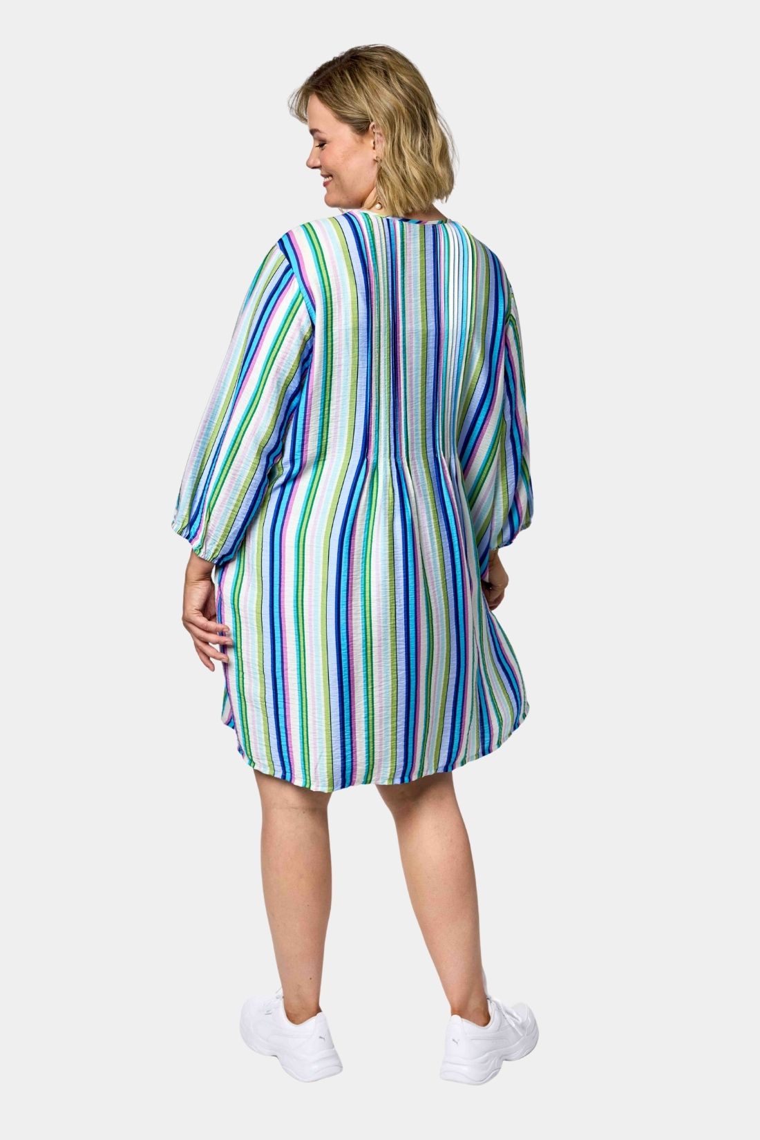 Johanne tunika fra Gozzip er en af de mest populære modeller og det forstår man godt. Den er syet i en blød viskoseblanding med et smukt blå stribet print, som giver et feminint og levende udtryk. Brug den med leggings til hverdag eller style den med smalle bukser for et mere velklædt look.