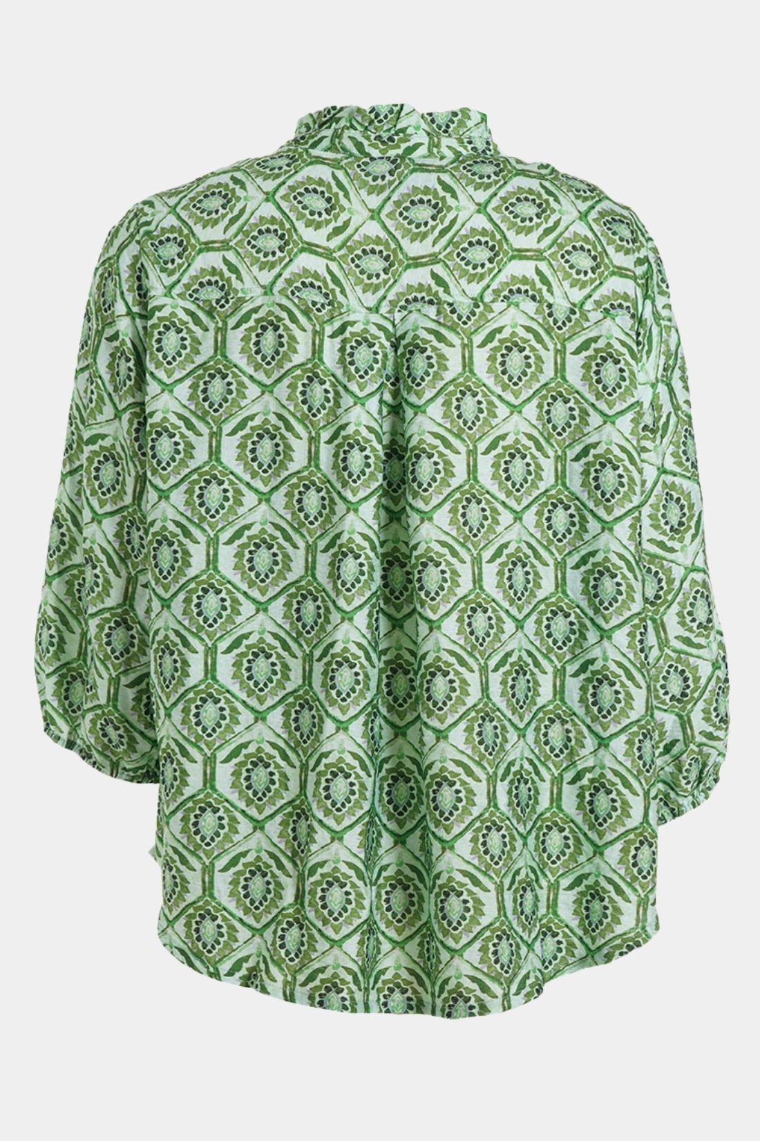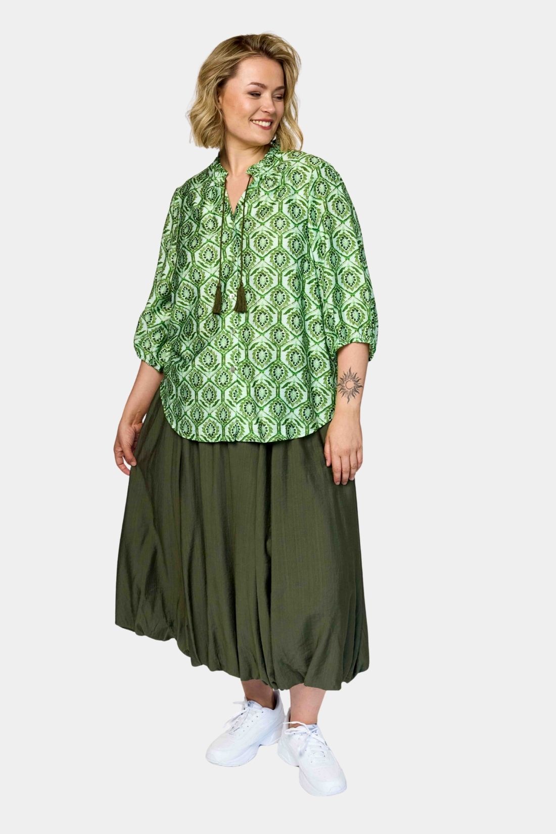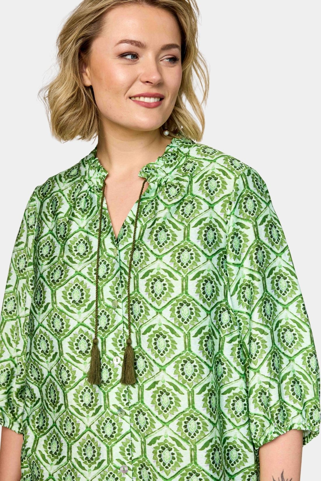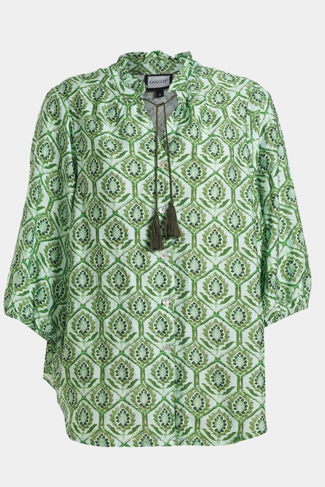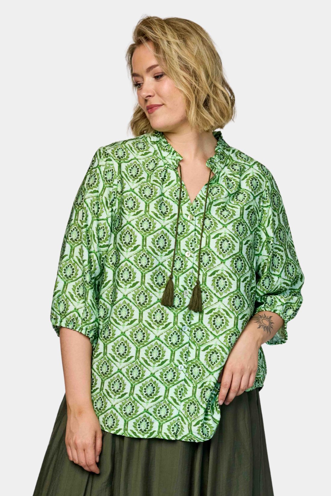 En feminin og let bluse fra Gozzip i en blød viskoseblanding med et smukt grafisk mønster i friske grønne nuancer. Det dekorative print giver blusen et levende og elegant udtryk, mens den løse silhuet sikrer høj komfort og et flot fald.