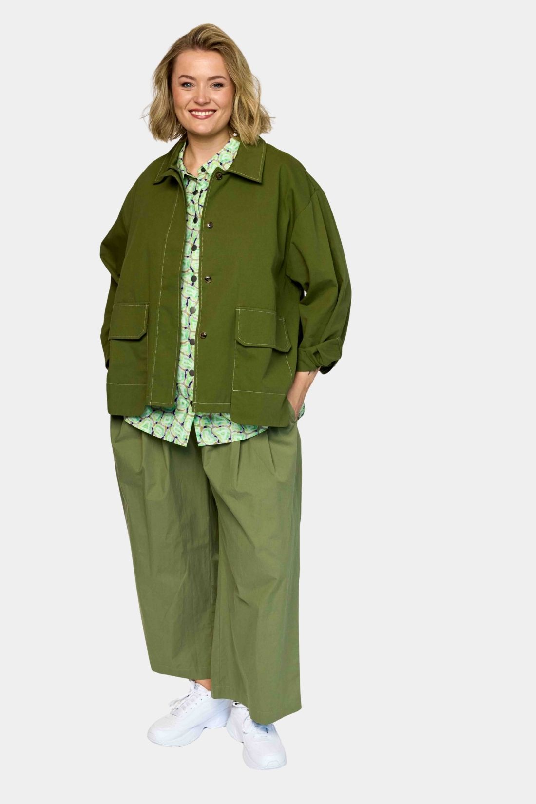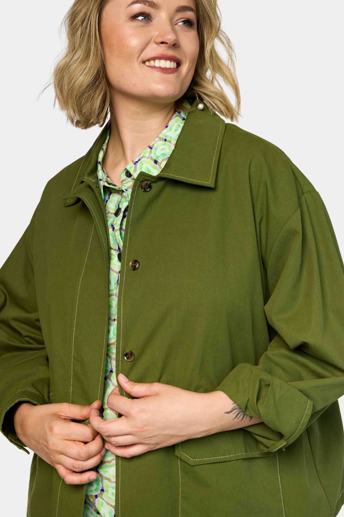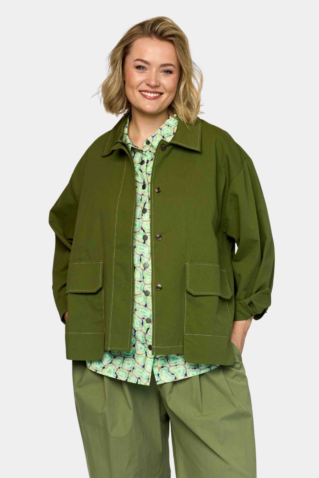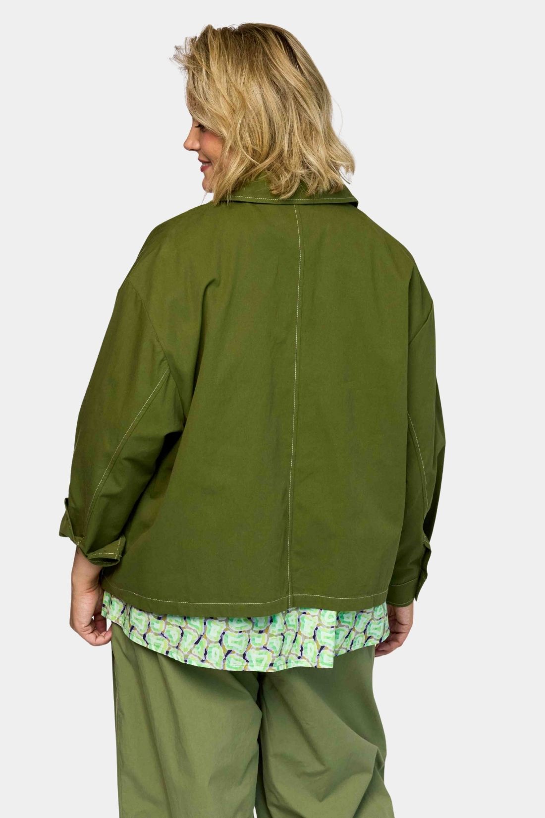 Jakken er designet i en smuk olivengrøn nuance med synlige kontrastsyninger, som tilfører et diskret, grafisk element og fremhæver det praktiske og rå udtryk.