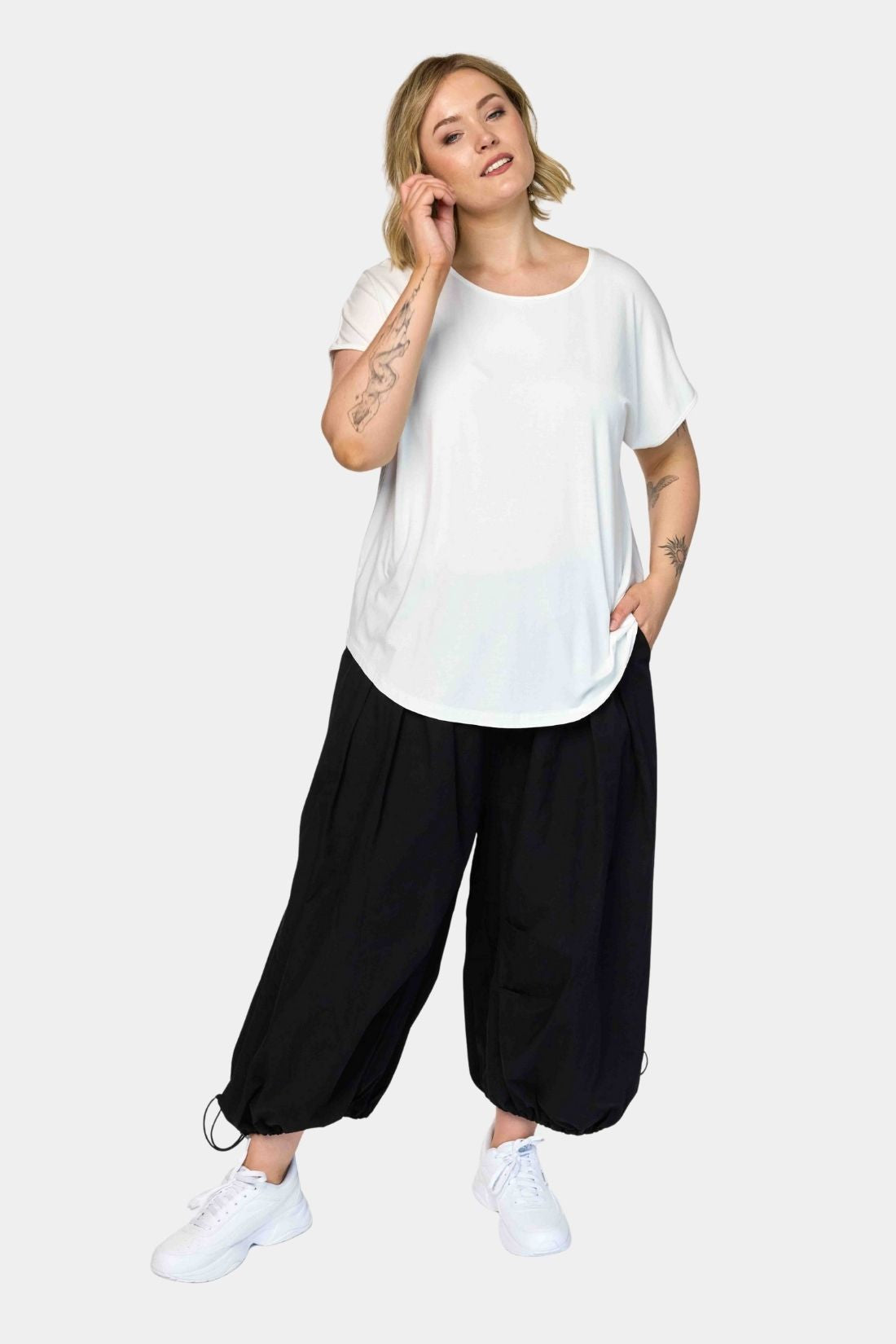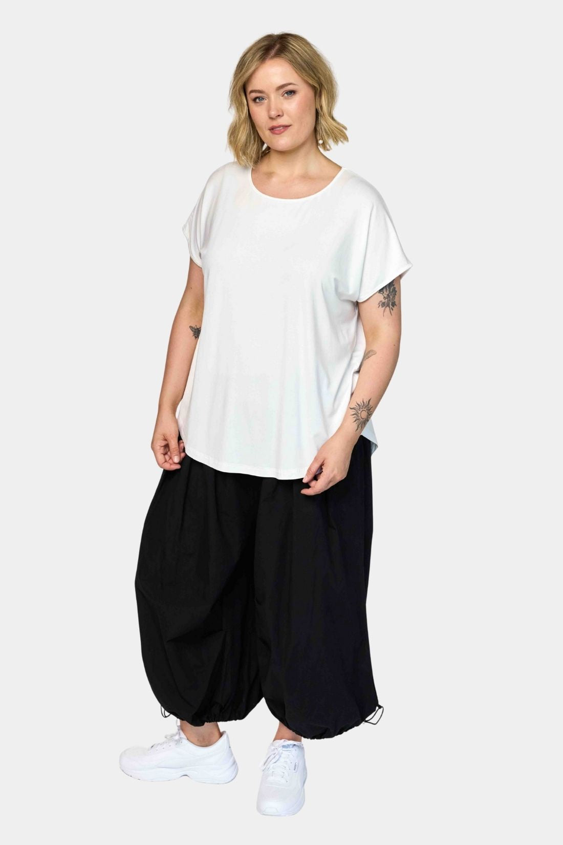 En moderne ballonbuks fra Gozzip i ren bomuld med fokus på volumen og komfort. Den afrundede silhuet giver et afslappet og nutidigt udtryk, mens den elastiske talje gør buksen behagelig og nem at bruge i hverdagen. En stilren model der fungerer perfekt med både enkle toppe og mere voluminøse overdele.
