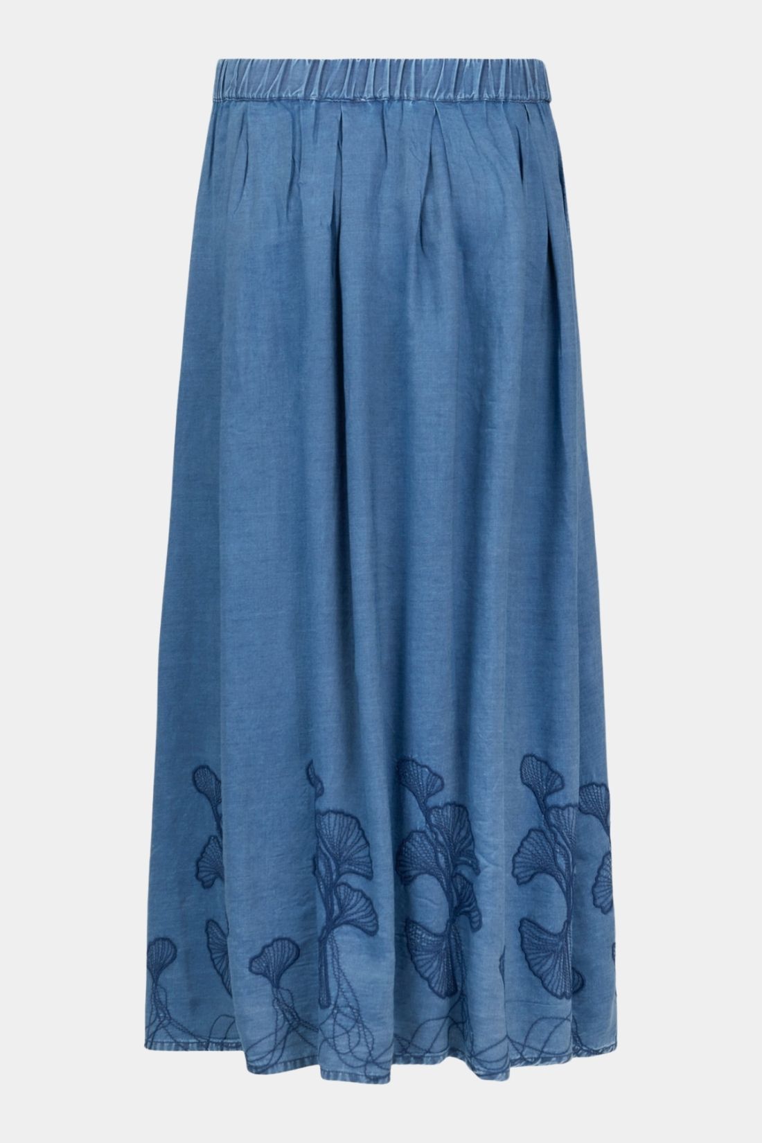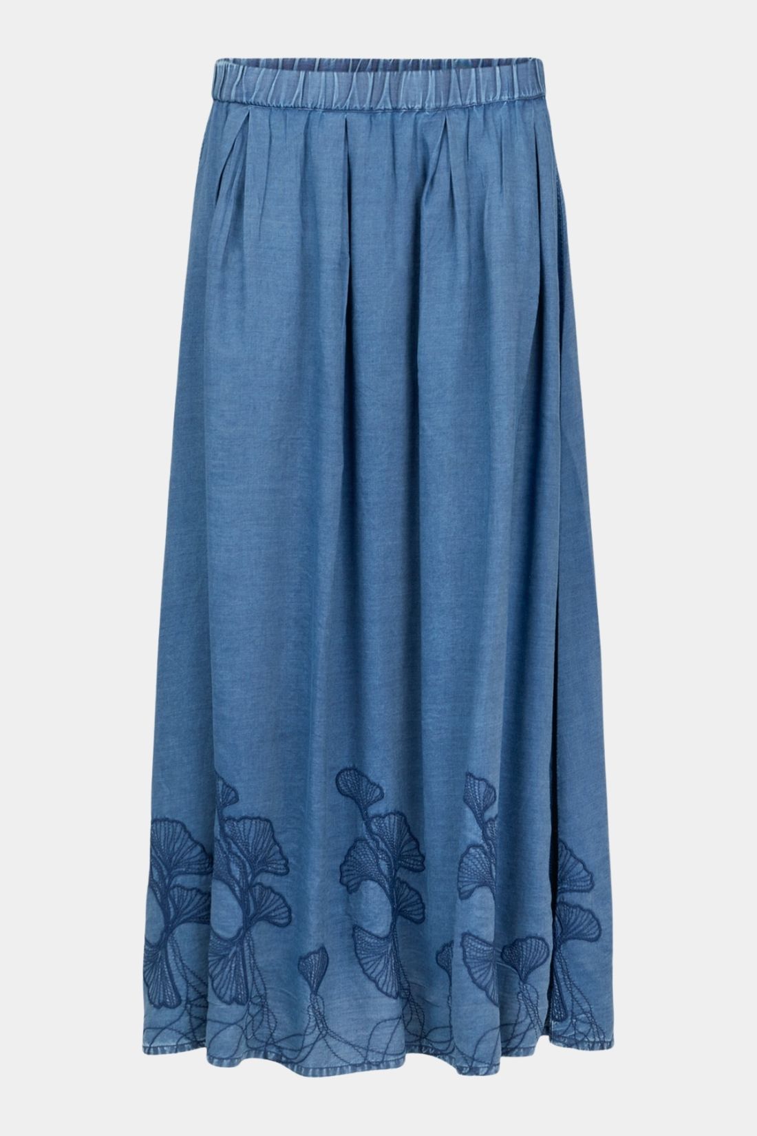 Smuk lang nederdel fra Noen syet i det fineste blå tencel med smukke broderidetaljer der giver et feminint og eksklusivt udtryk. Den bløde kvalitet falder flot og gør nederdelen behagelig at have på hele dagen, samtidig med at A faconen giver en let og elegant silhuet.