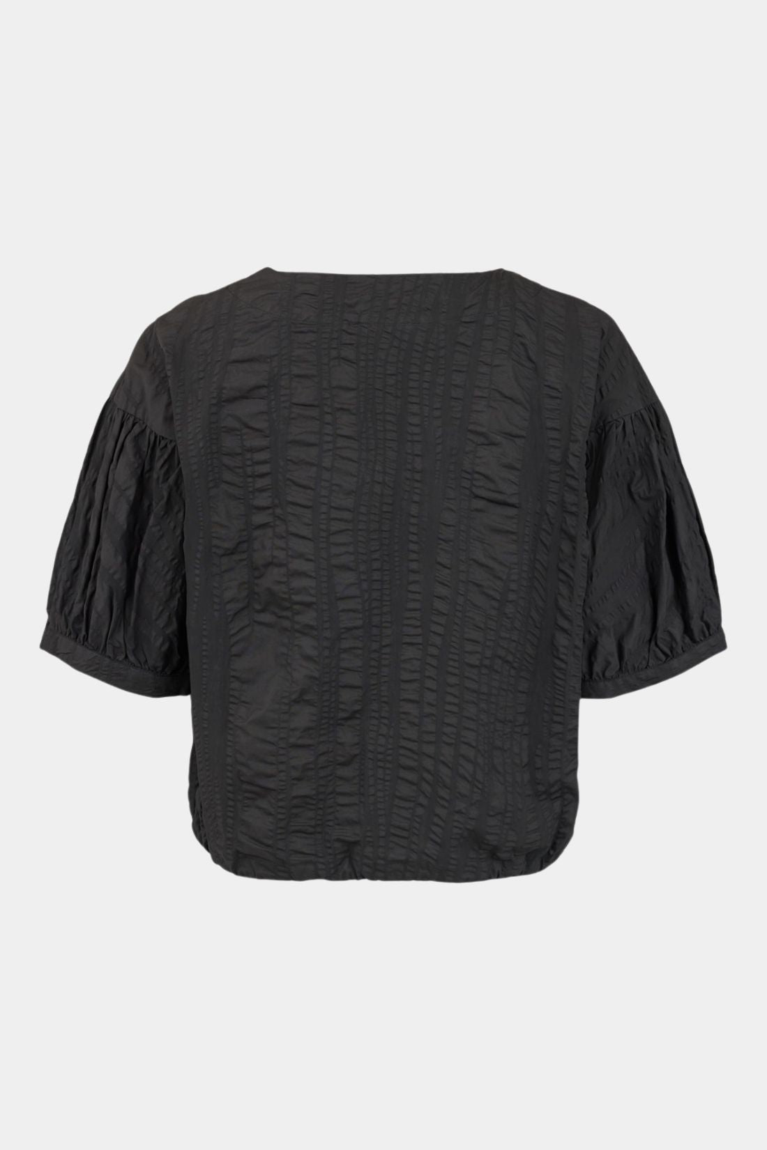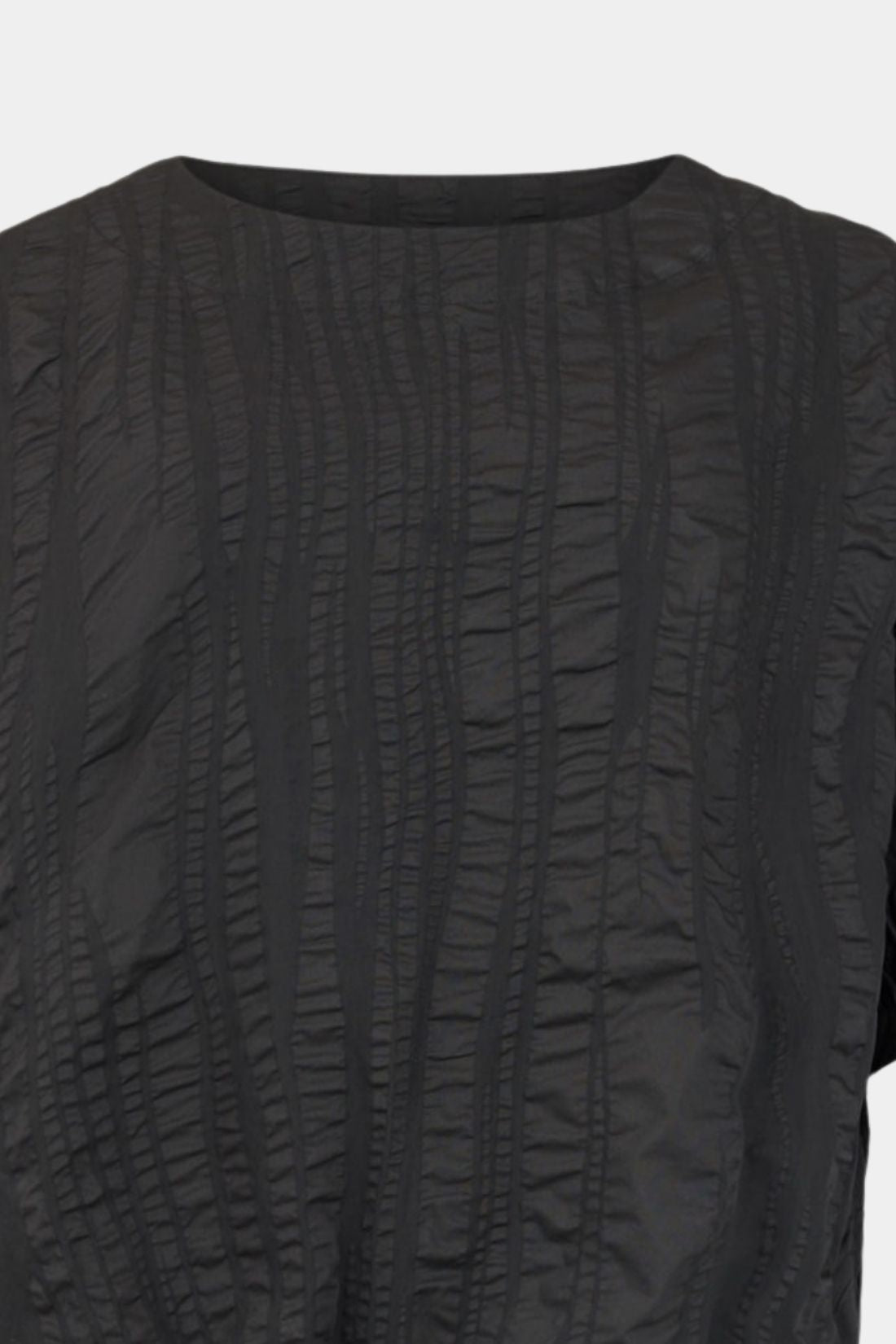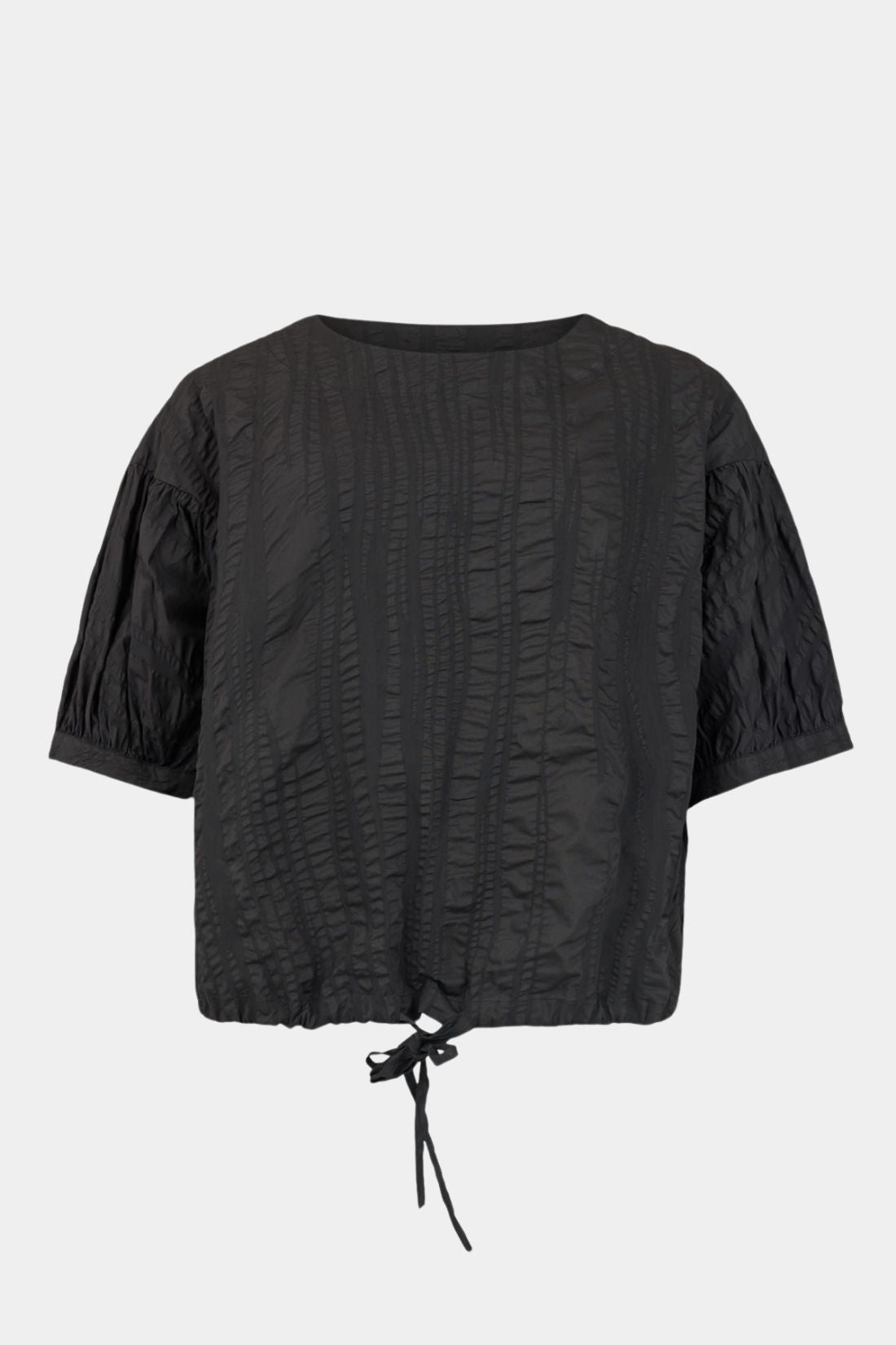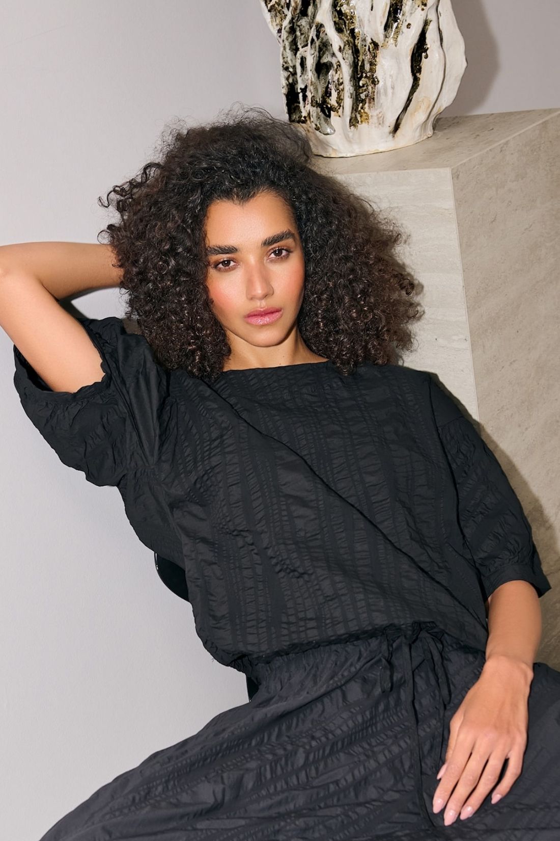 Utrolig fin bluse fra Noen med smukke detaljer og et eksklusivt udtryk. Den lette bomuld med bæk og bølge vævning har en diskret glans, og den løse facon med bindebånd i taljen gør blusen nem at tilpasse og behagelig at have på. Perfekt både til hverdag og til et elegant sæt sammen med nederdelen i samme stof.