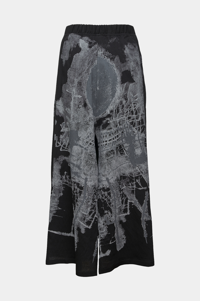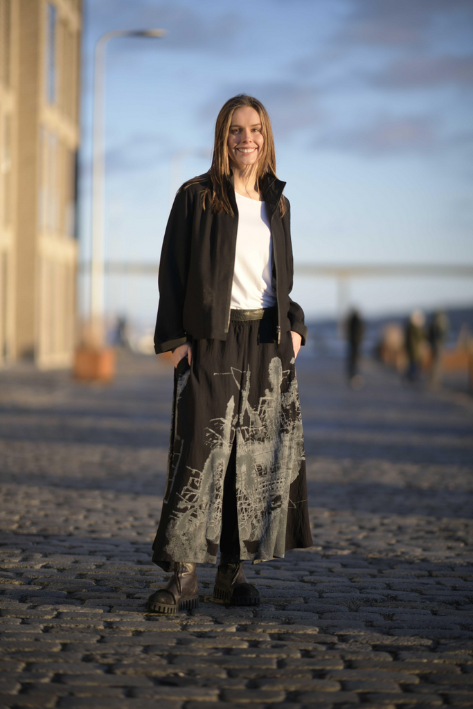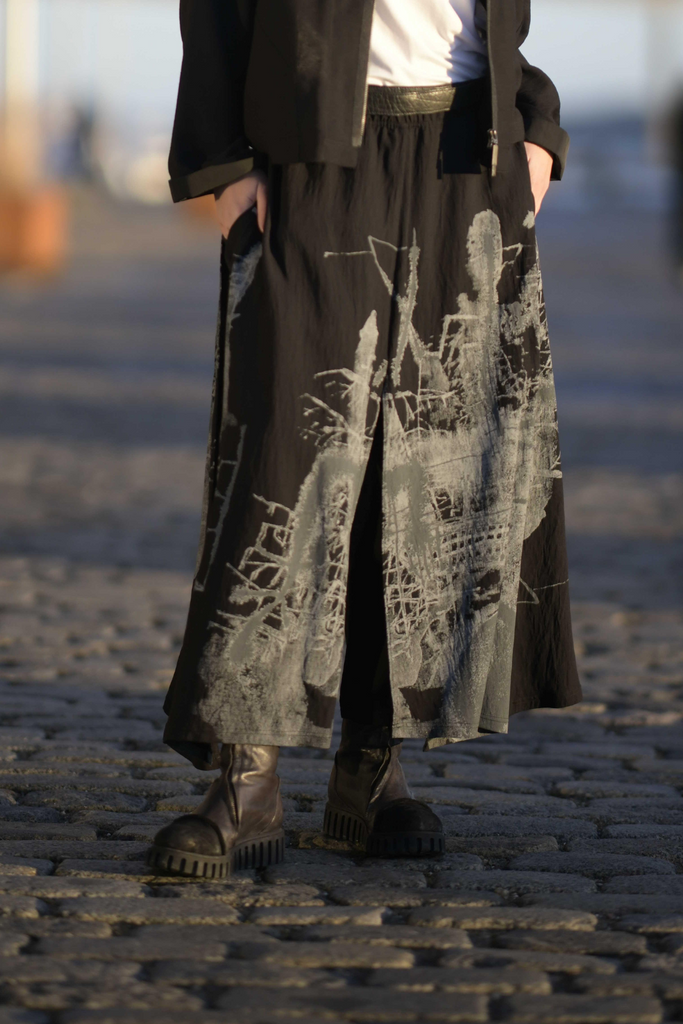 Den elastiske talje sikrer en behagelig og fleksibel pasform. Ved første øjekast ligner det en nederdel med lange slidser, men indenunder gemmer sig smalle, ensfarvede bukser i 7/8-længde.