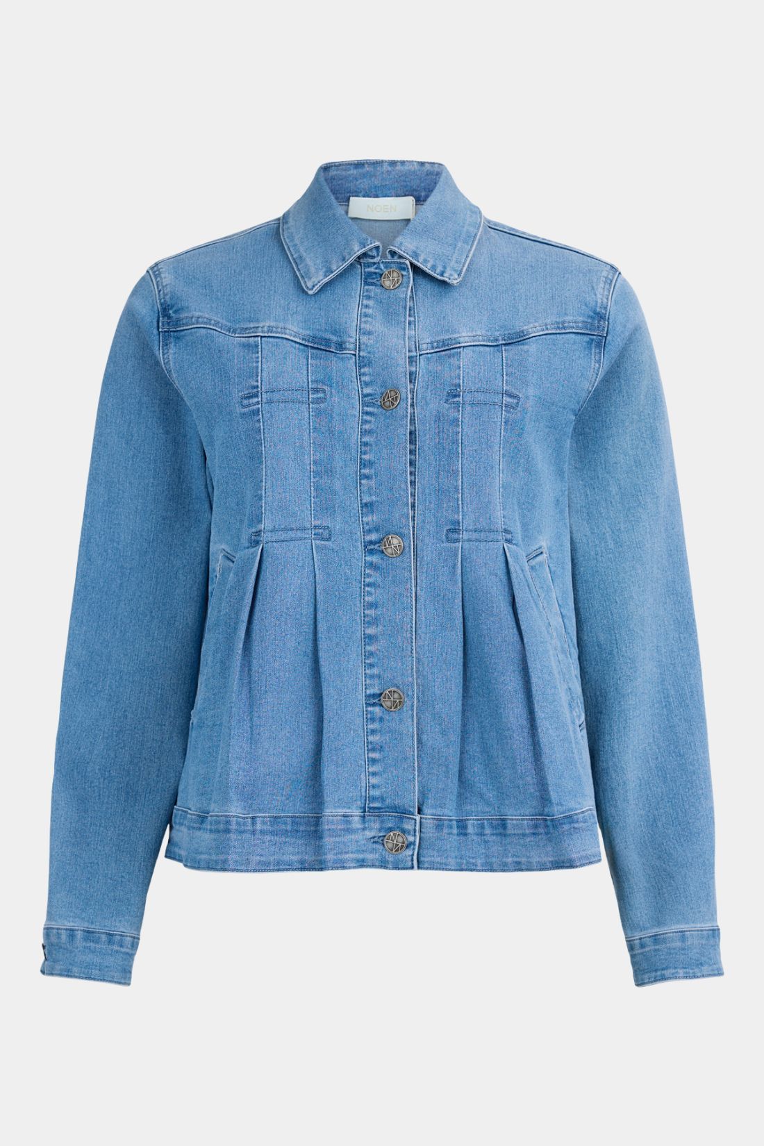 Denimjakke fra Noen i en flot, klassisk vask med et feminint twist. Modellen har en flatterende pasform med fine lægdetaljer, der giver ekstra vidde og et blødere udtryk end den traditionelle denimjakke.