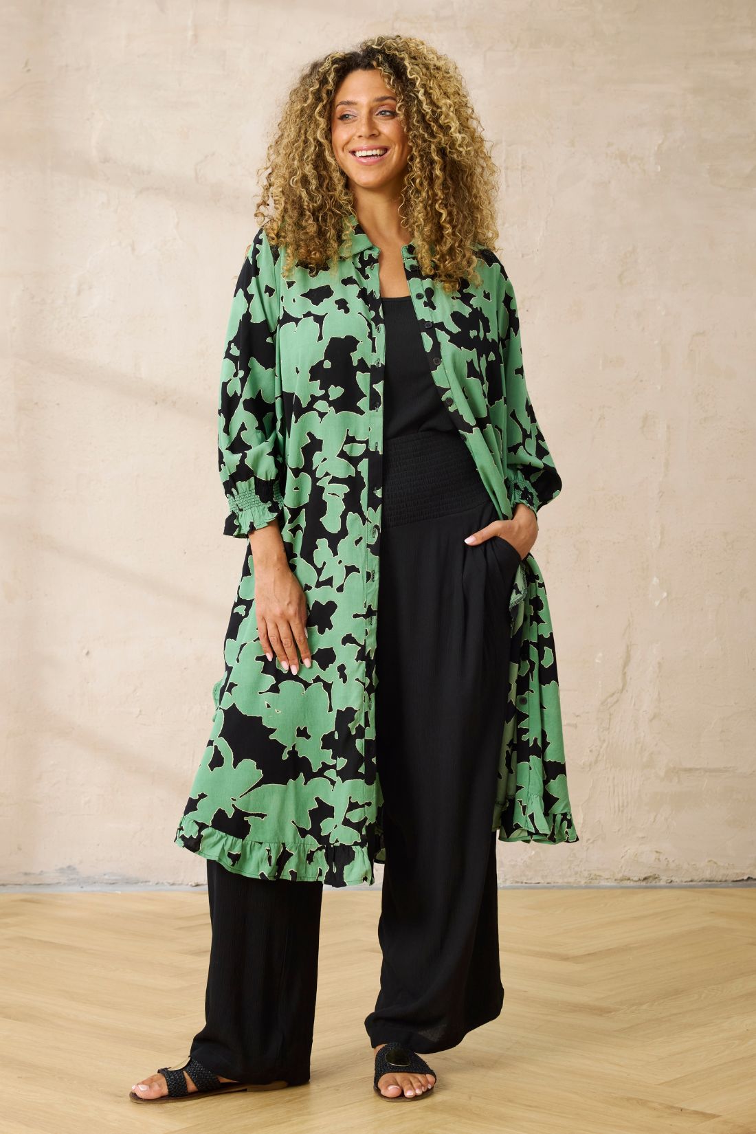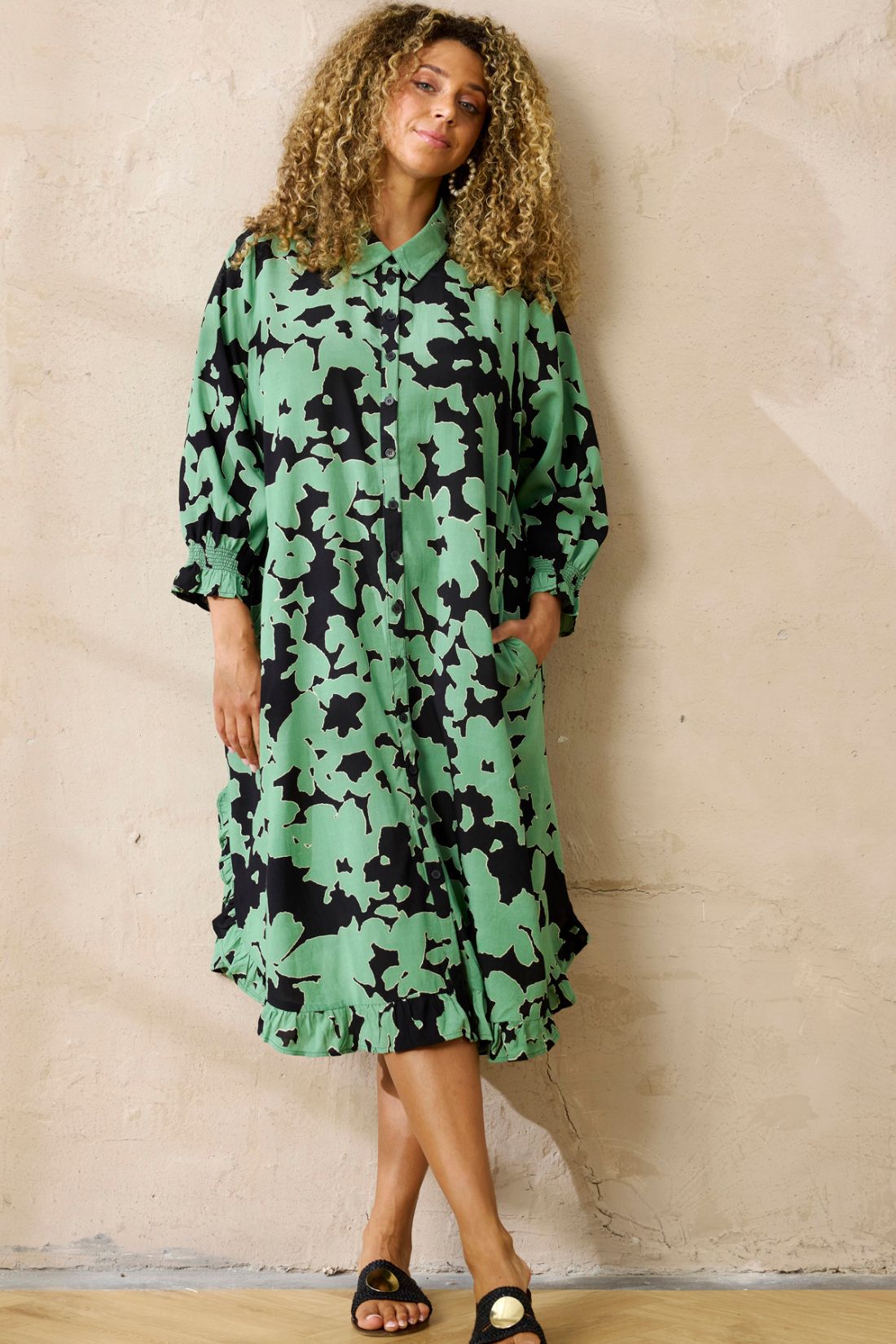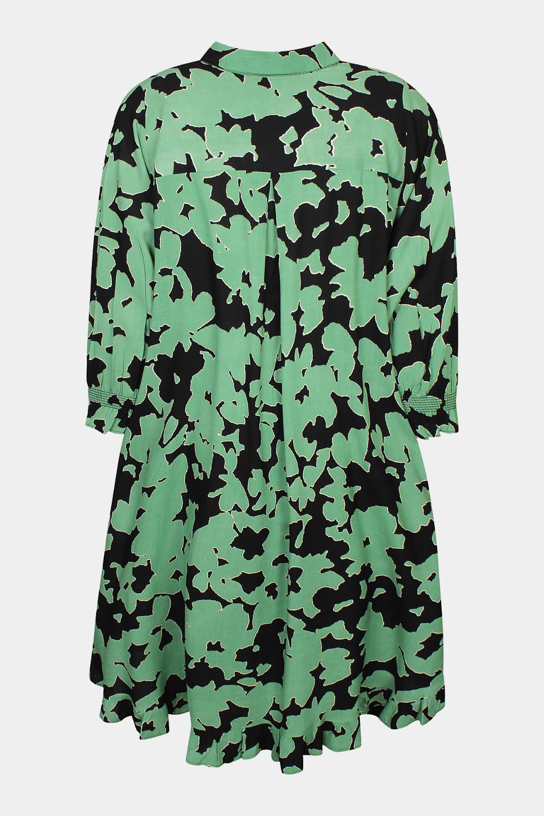 Den klassiske skjortekrave og gennemgående knaplukning giver kjolen et afslappet, men samtidig elegant look. Nederst afsluttes kjolen med en lille flæsekant, som tilfører et feminint og let udtryk. Modellen har en løs og komfortabel pasform, der gør den ideel til både hverdag og pænere brug.
