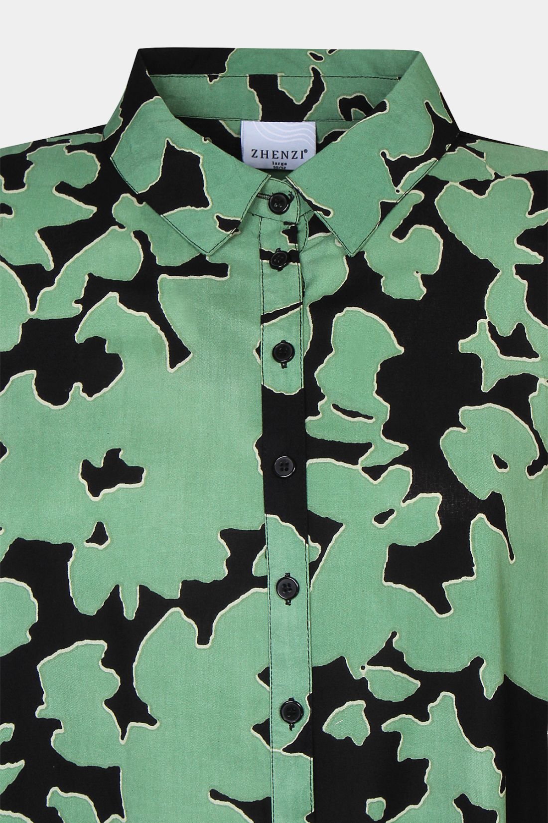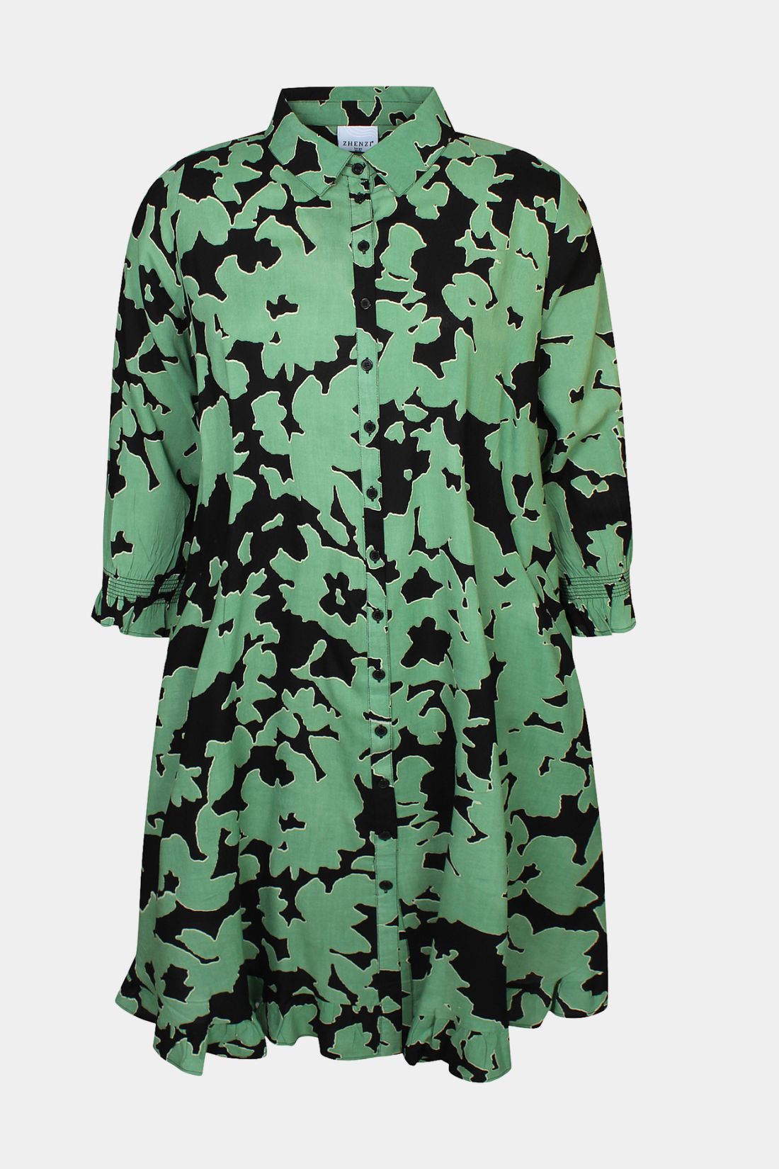 Skjortekjole fra Zhenzi i en blød og let viskosekvalitet, der falder flot og føles behagelig mod huden. Kjolen har et moderne og iøjnefaldende mønster, som giver et friskt og stilfuldt udtryk.