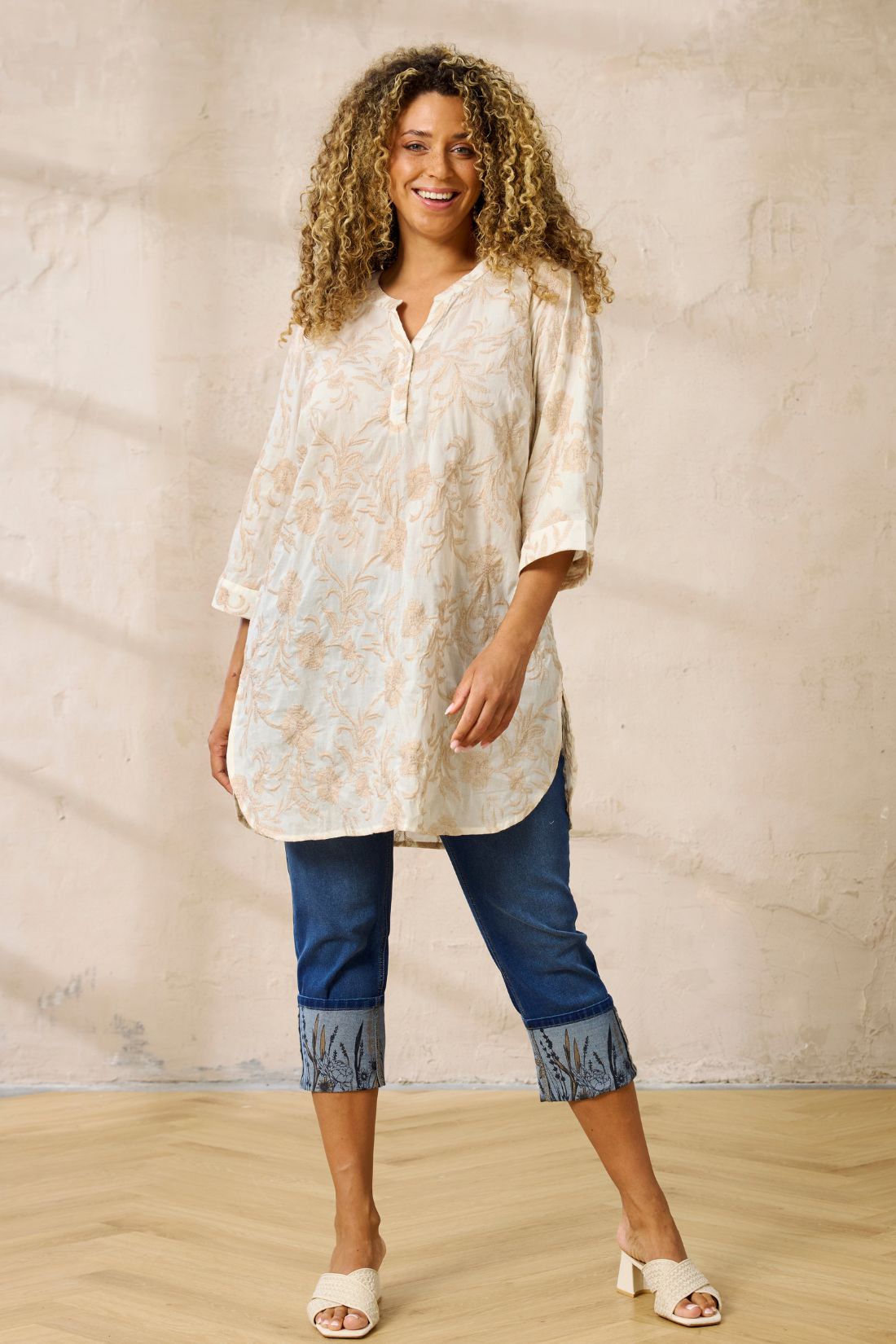 Tunika fra Zhenzi i en smuk og let kvalitet med elegant broderi, der giver et feminint og eksklusivt udtryk. Den lyse nuance kombineret med det fine mønster gør tunikaen både stilfuld og nem at kombinere med jeans, bukser eller leggings.