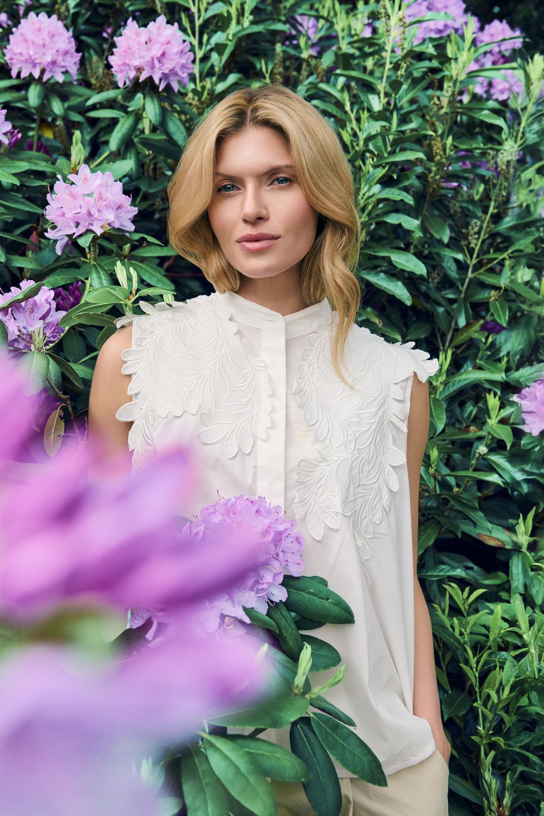 Ærmeløs skjorte fra Noen i en skøn bomuldsblanding med et smukt og feminint udtryk. Modellen har en elegant, høj krave og skjult knaplukning, mens de dekorative broderede bladdetaljer over skuldre og ryg giver et eksklusivt og iøjnefaldende look.