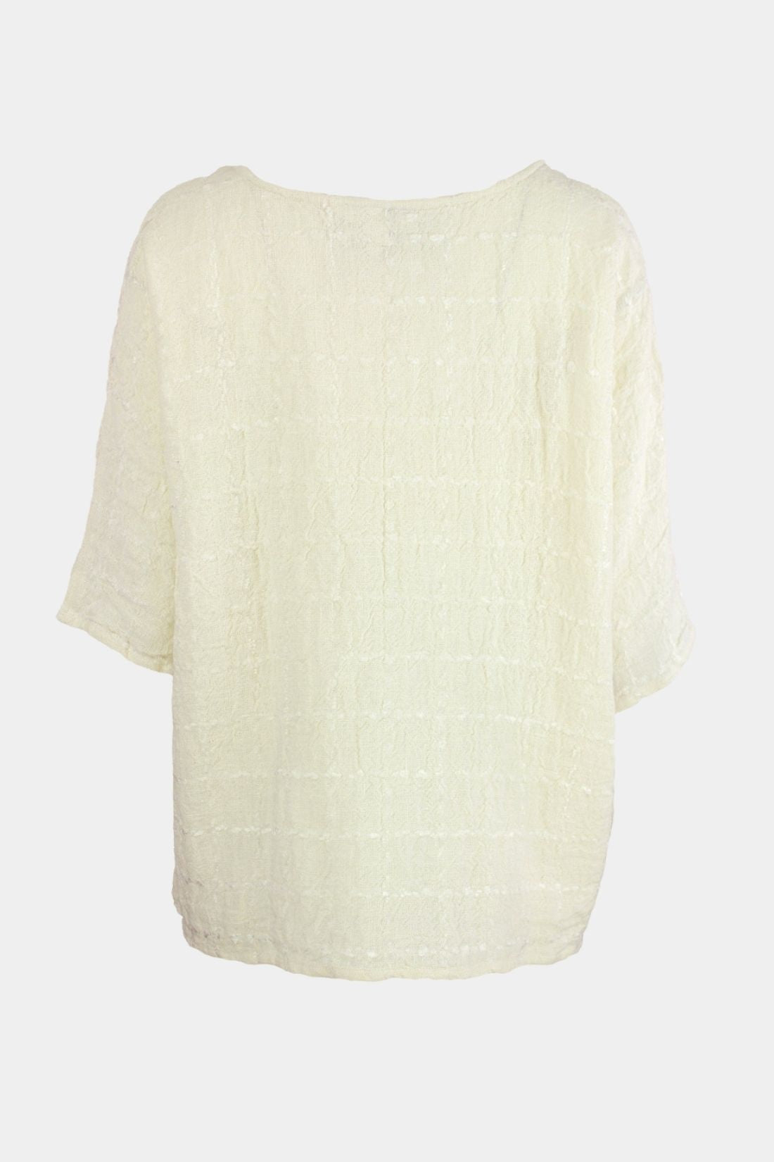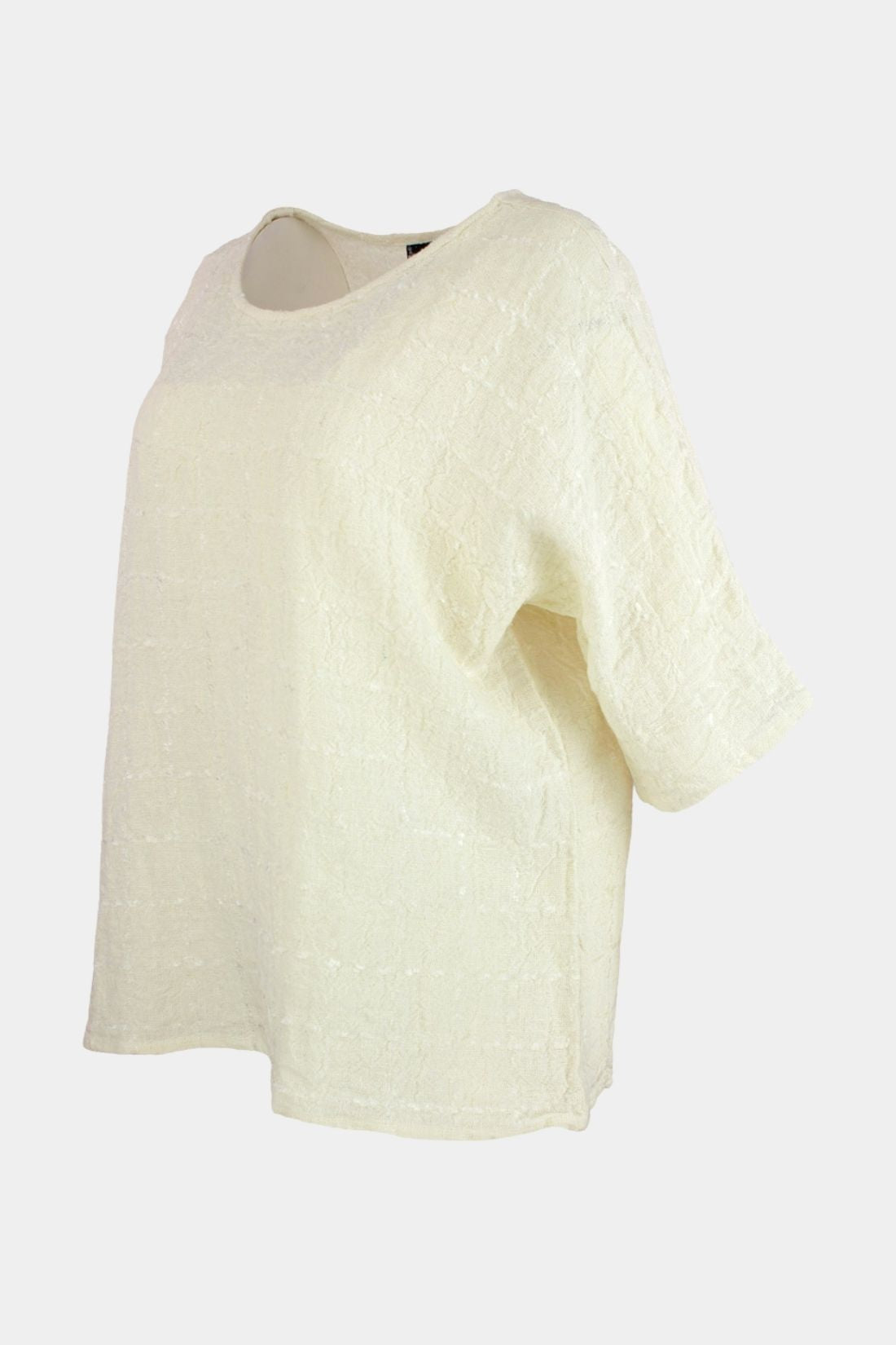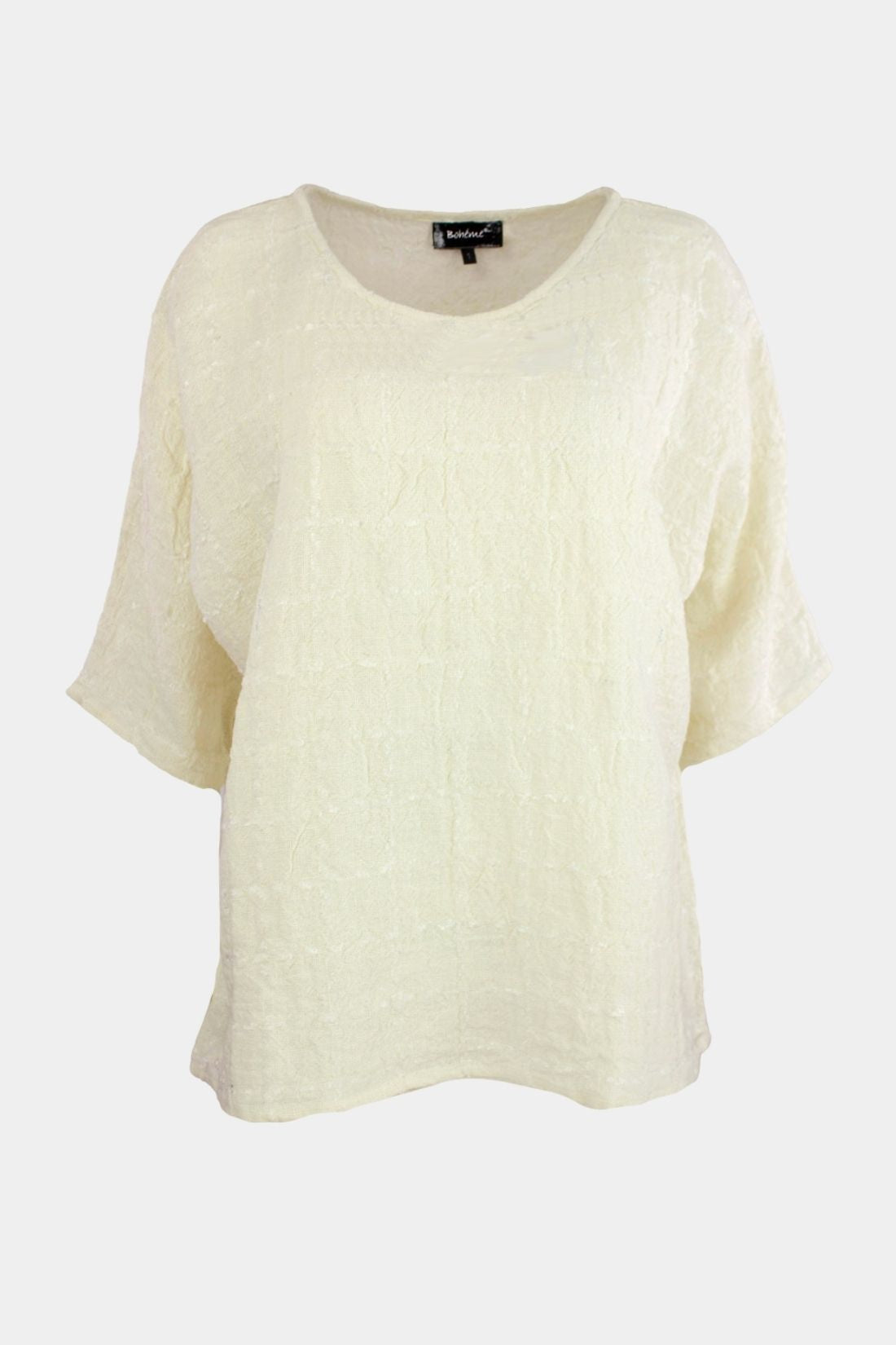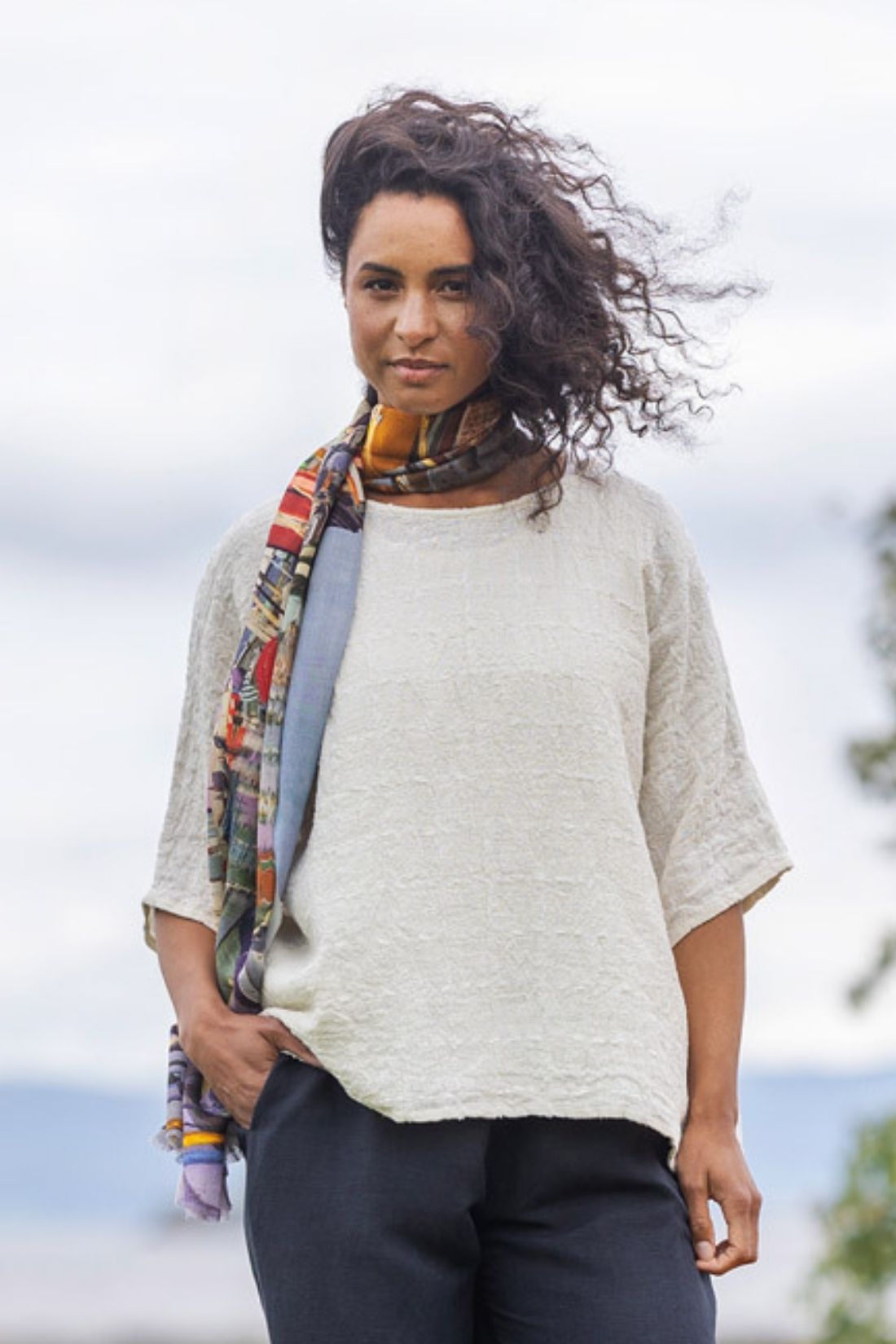 Smuk og enkel bluse fra Boheme i offwhite hør med fin jaquard vævning der giver et elegant og levende udtryk. Den lette oversize facon falder smukt omkring kroppen og gør blusen både behagelig og nem at style til hverdagen.