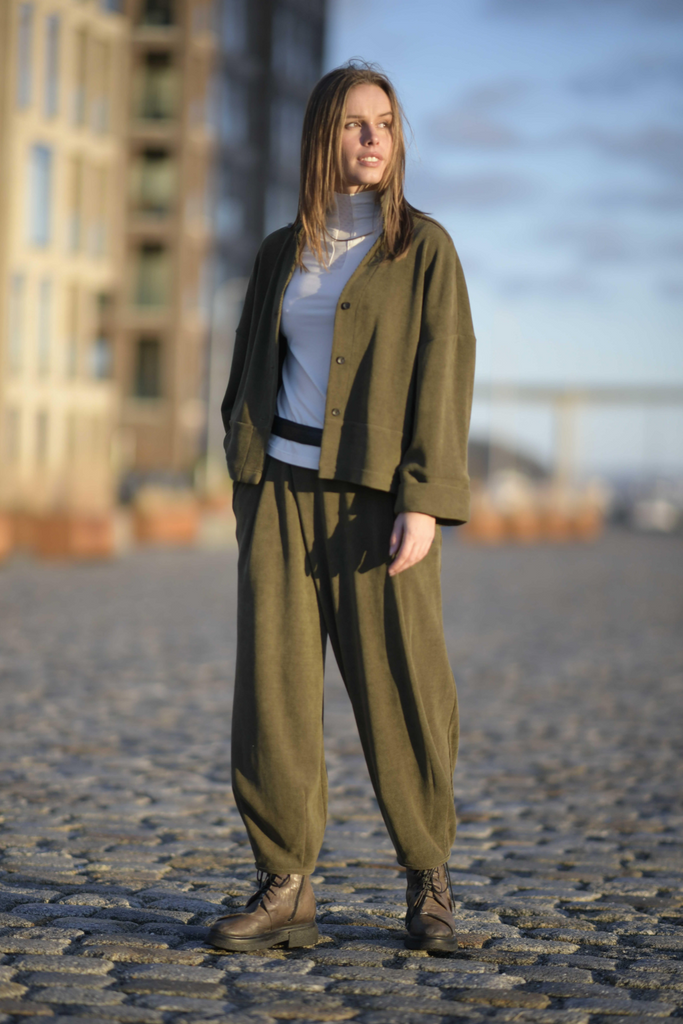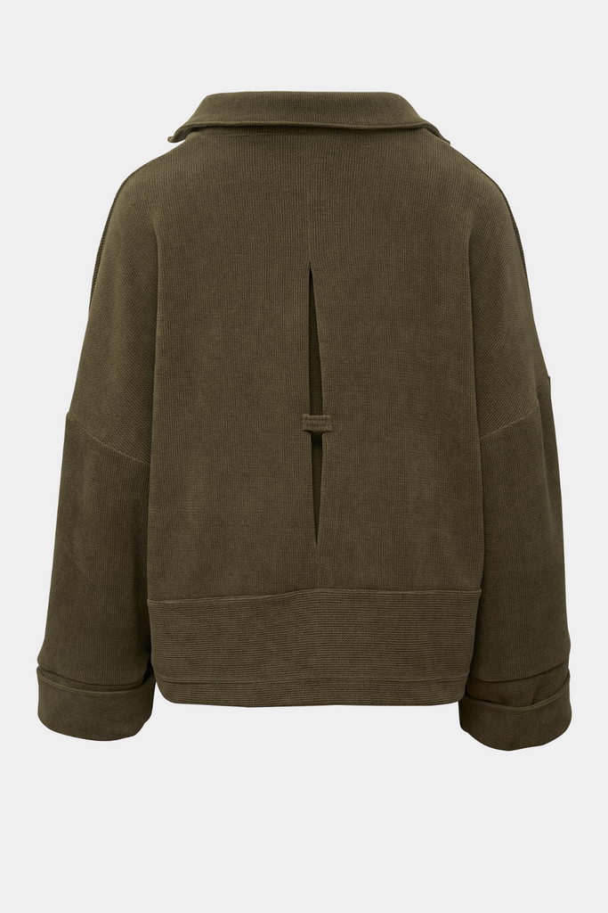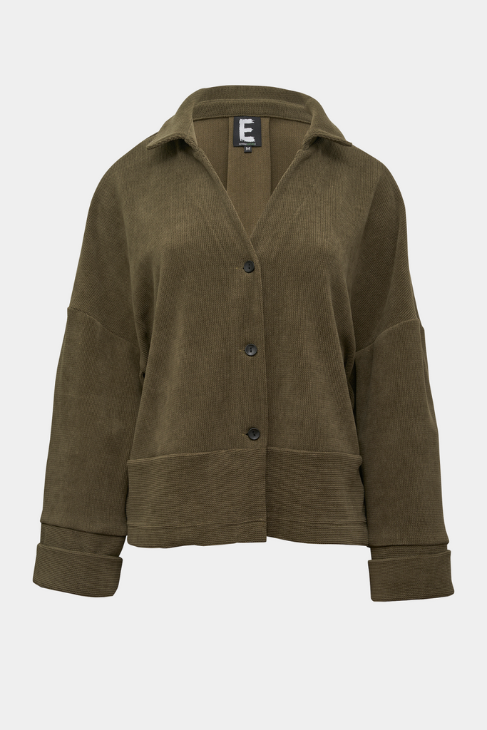 Den har lange ærmer med en bred manchet, som tilfører et moderne twist. Jakken lukkes med knapper foran. Kraven kan styles oprejst for et mere afslappet look eller lægges ned for et klassisk blazer-inspireret udtryk.