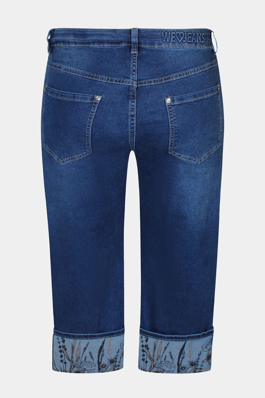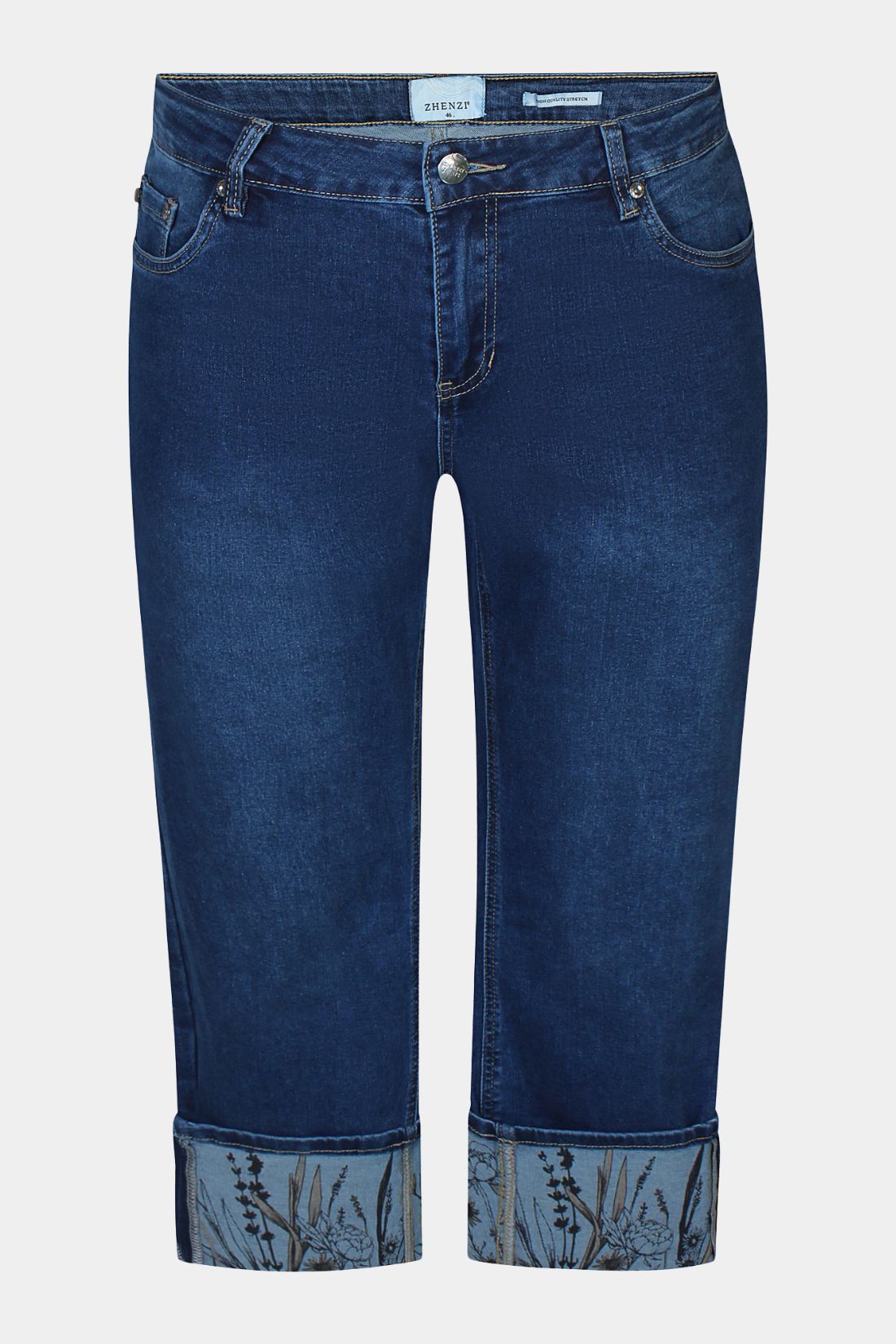 Jeans fra Zhenzi i en flot blå vask, der kombinerer komfort og stil. Modellen kan bruges både som lange bukser og som capri ved at bukke dem op, hvor det fine print på indersiden giver et dekorativt og personligt udtryk.