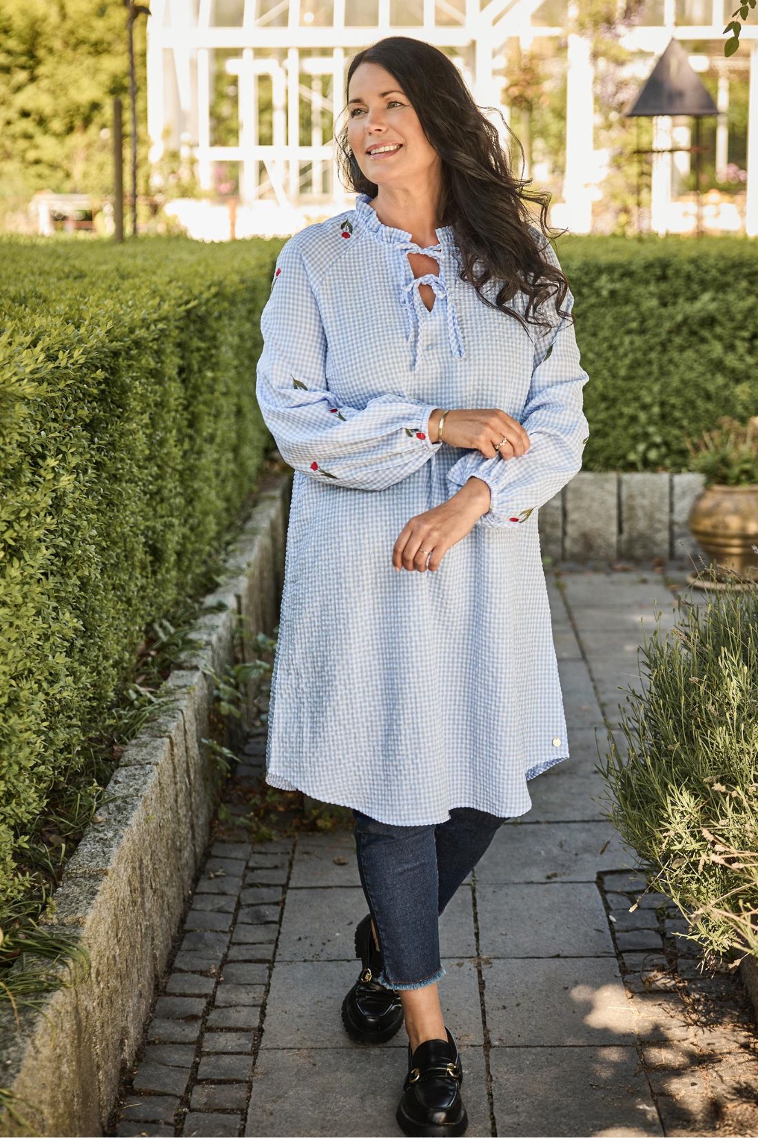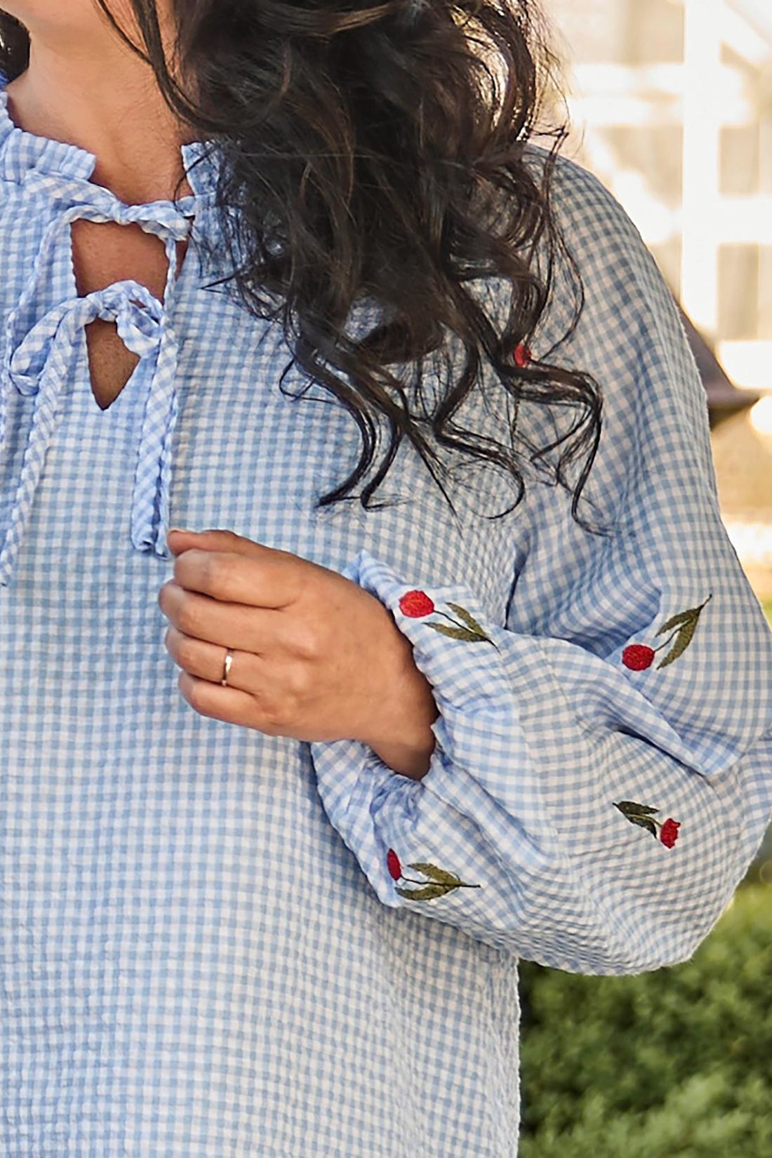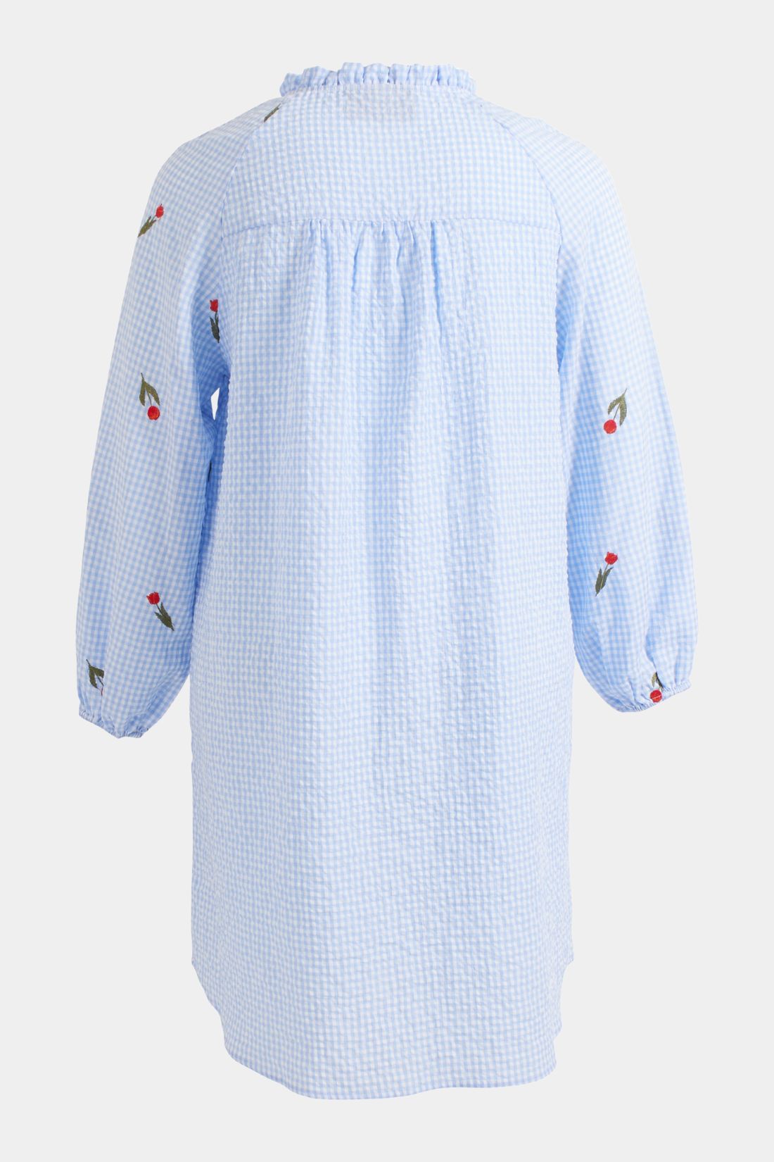 Smuk og feminin tunika fra Zoey i 100% bomuld med et let og sommerligt udtryk. Modellen er syet i en fin lyseblå gingham-ternet kvalitet med små broderede kirsebær, der tilfører et charmerende og legende touch.