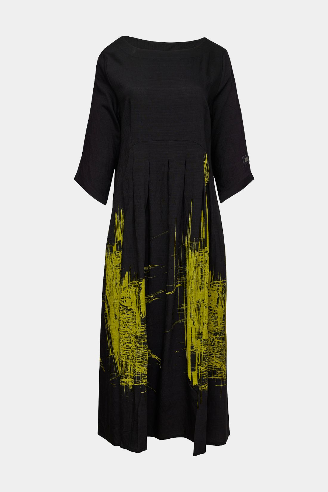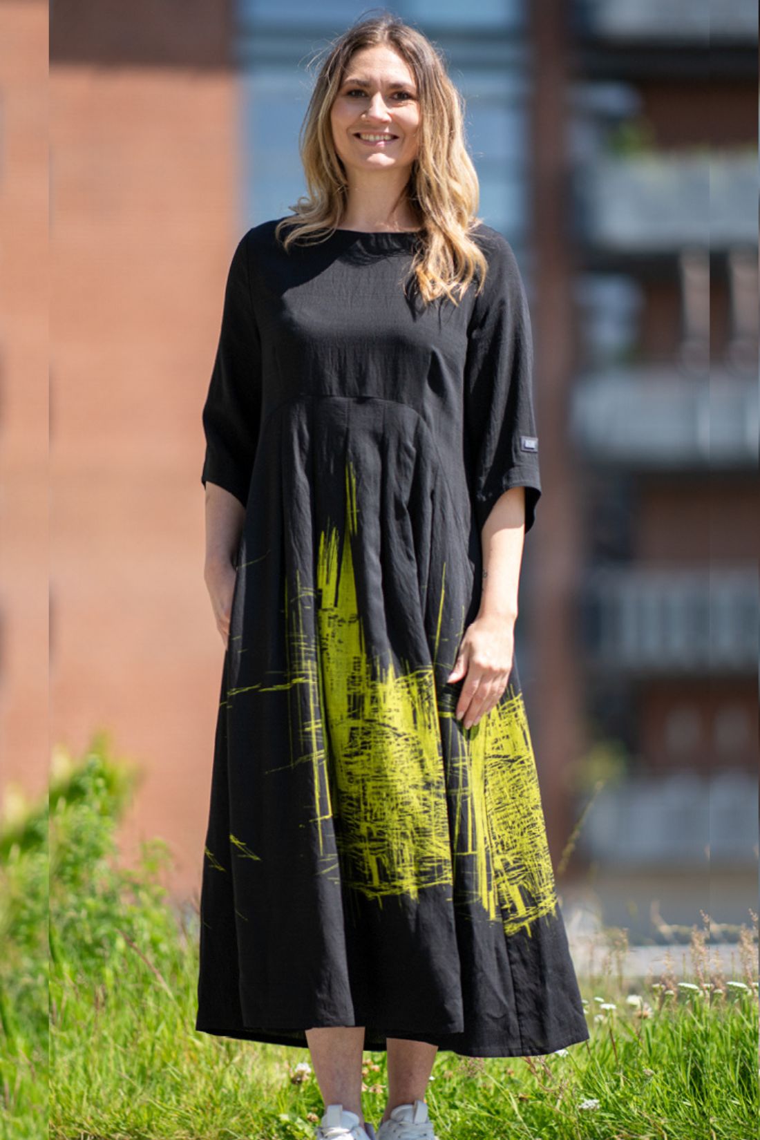 Kjole fra E Avantgarde i et stilfuldt og kunstnerisk design, hvor den sorte base kombineres med et markant gult print, der giver et moderne og iøjnefaldende udtryk. Den lette viskosekvalitet falder flot og gør kjolen behagelig at have på, mens det elegante snit skaber en flot silhuet.