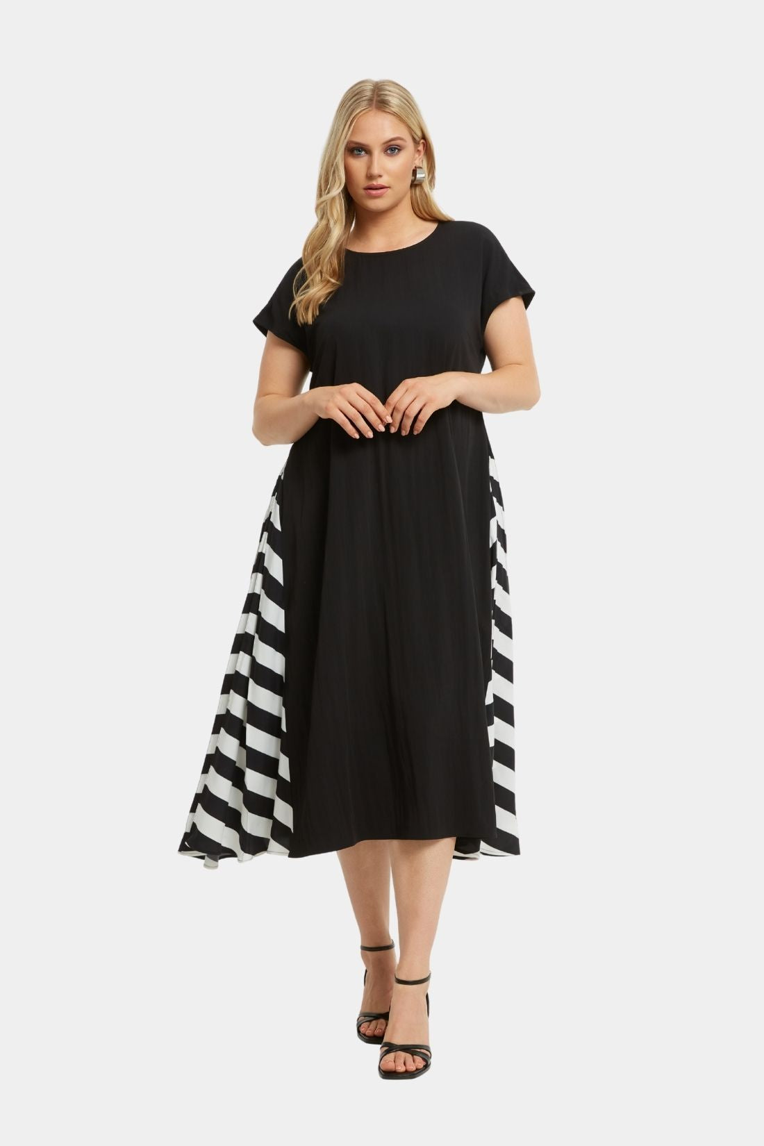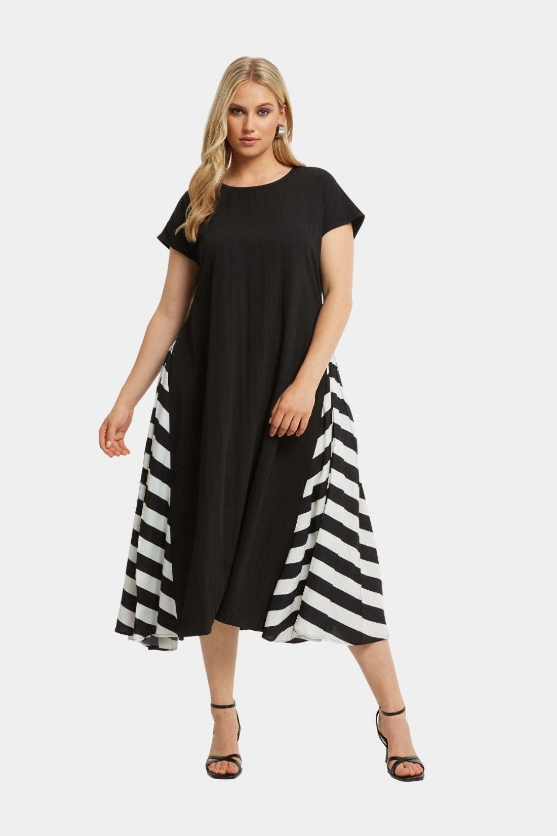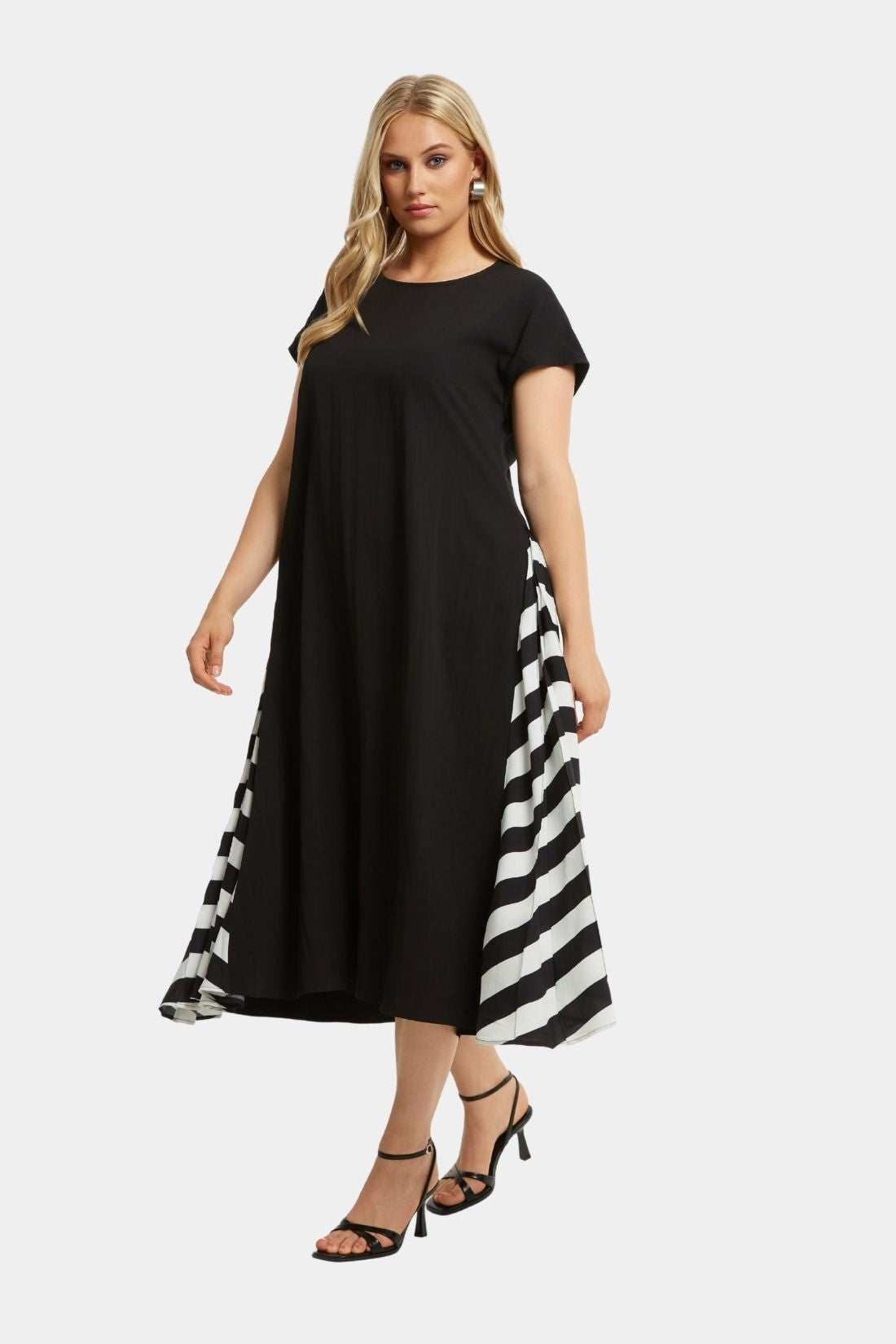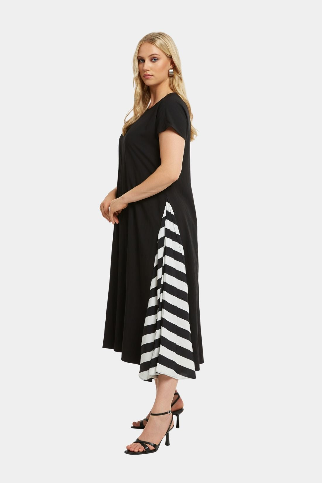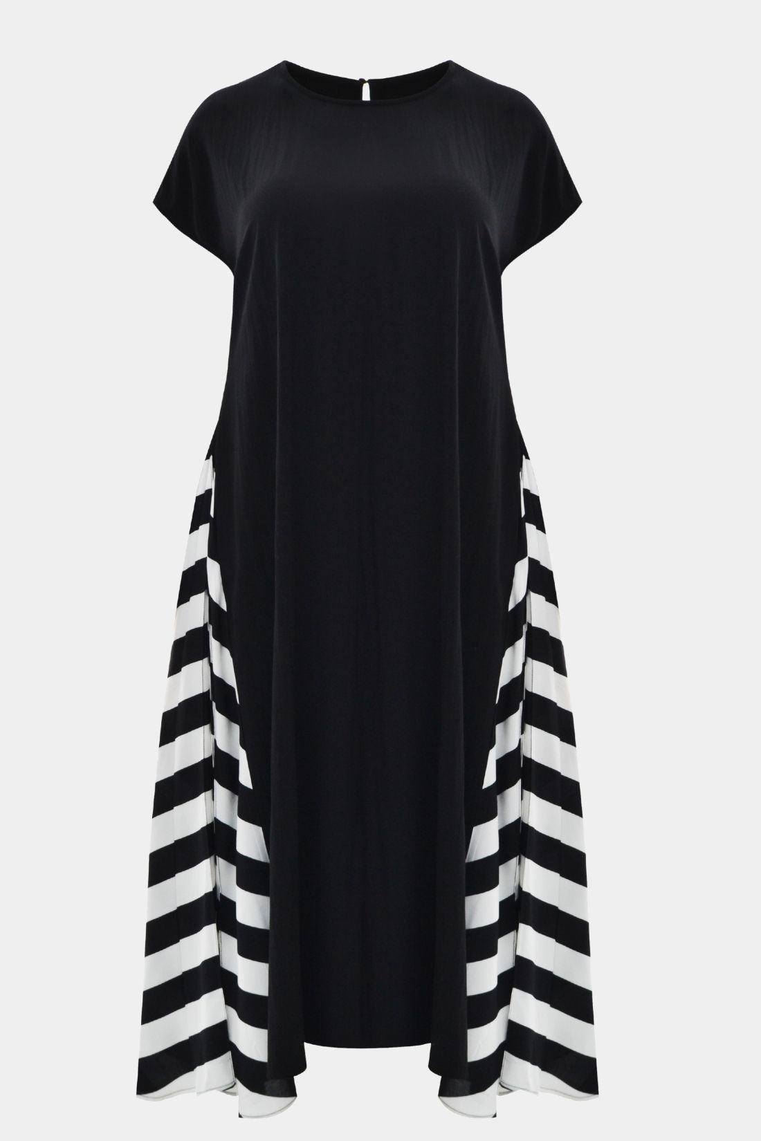 Denne kjole fra Mat Fashion har en markant og moderne silhuet med sin meget A-formede pasform. Det enkle sorte udtryk kombineres flot med kontrastdetaljer i siderne, som giver kjolen et grafisk og stilfuldt look. Den lette kvalitet og den rummelige facon gør den behagelig at have på og nem at style til både hverdag og særlige anledninger.