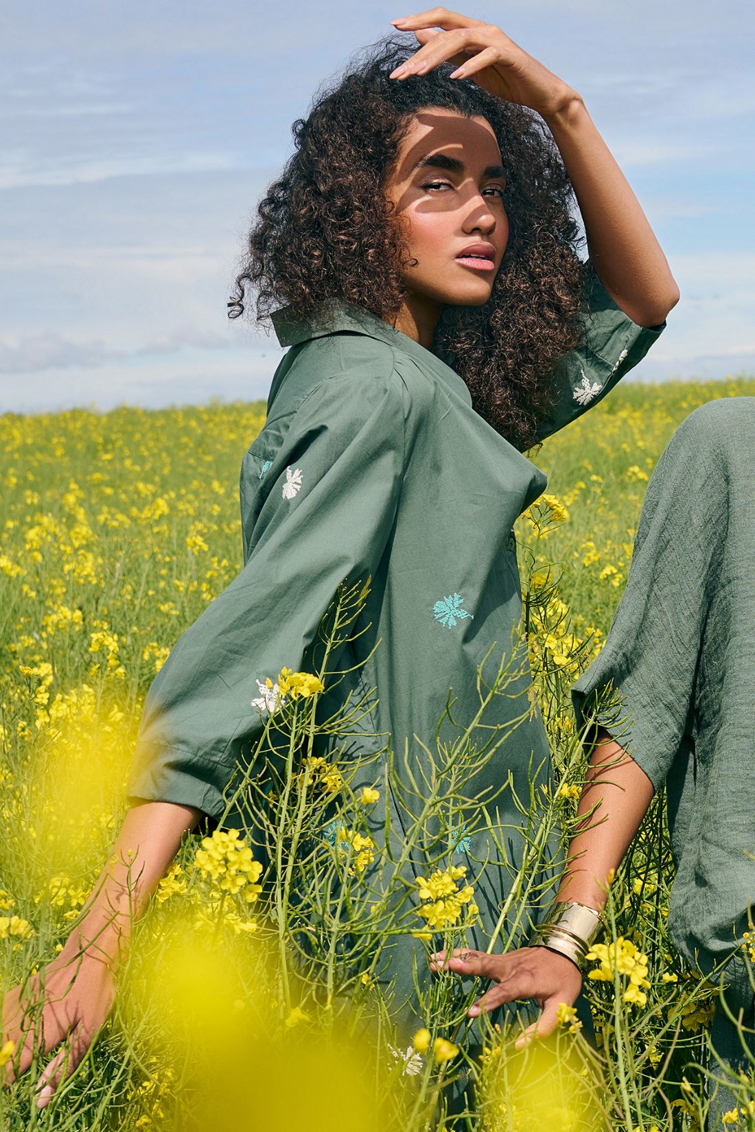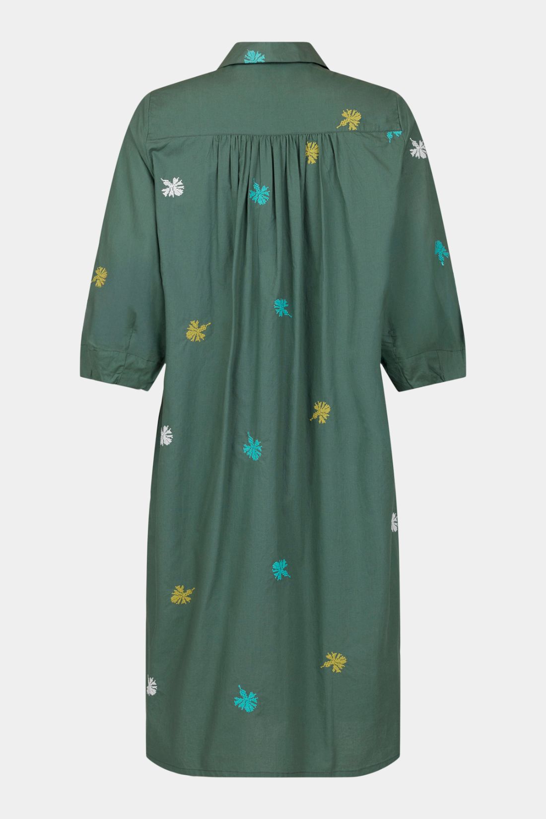 Kjolen har en klassisk skjortekrave og gennemgående knaplukning, som giver et stilrent og tidløst look. De små broderede motiver tilfører et diskret farvespil og gør kjolen helt unik. Den løse pasform og lette bomuldskvalitet gør den behagelig at have på hele dagen.