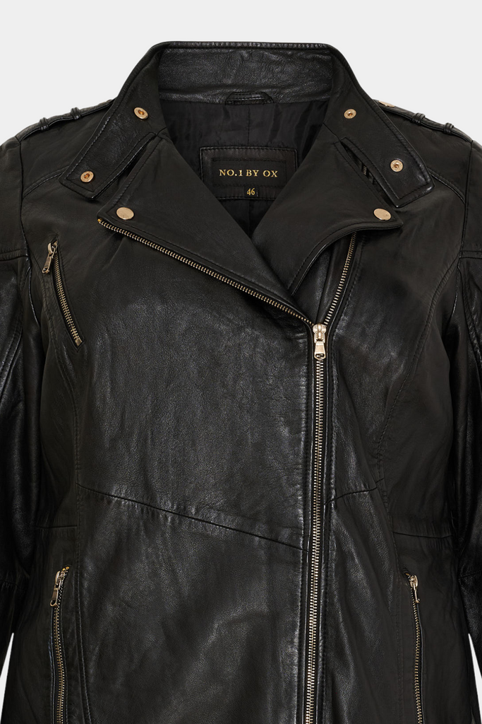 Lang bikerjakke i lammeskind fra No. 1 by Ox i sort med guld detaljer