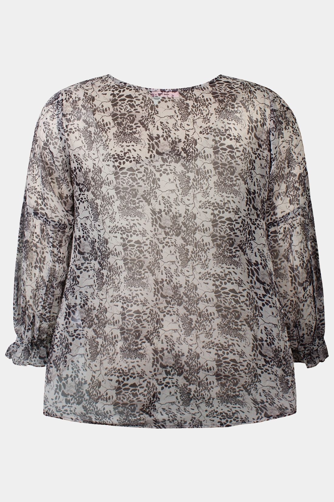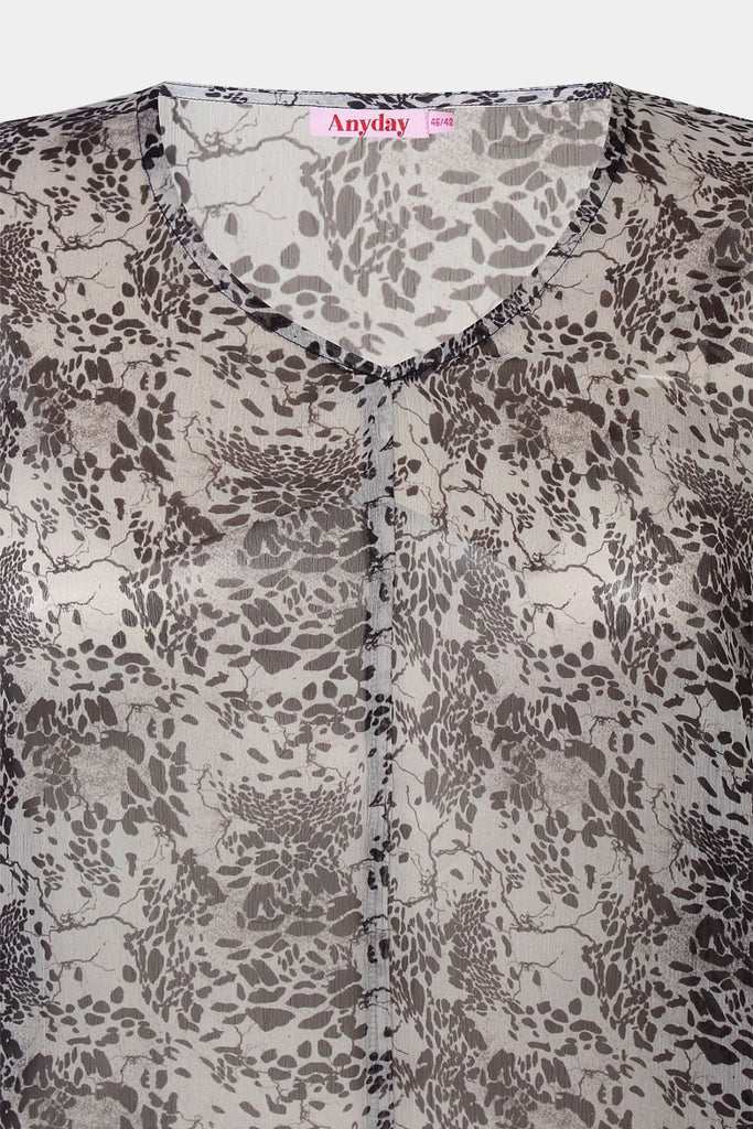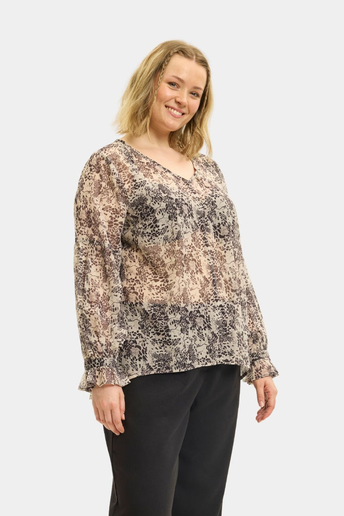 En let og elegant chiffonbluse fra Anyday, syet i en smuk beige chiffon med sort print. Modellen har en blød V-hals og en let A-facon, som giver et feminint og luftigt fald. De lange ærmer har god vidde og afsluttes med elastik og en fin flæsekant ved håndleddet, der tilføjer et romantisk touch til det enkle design.