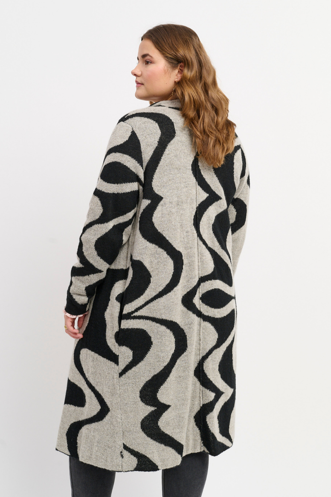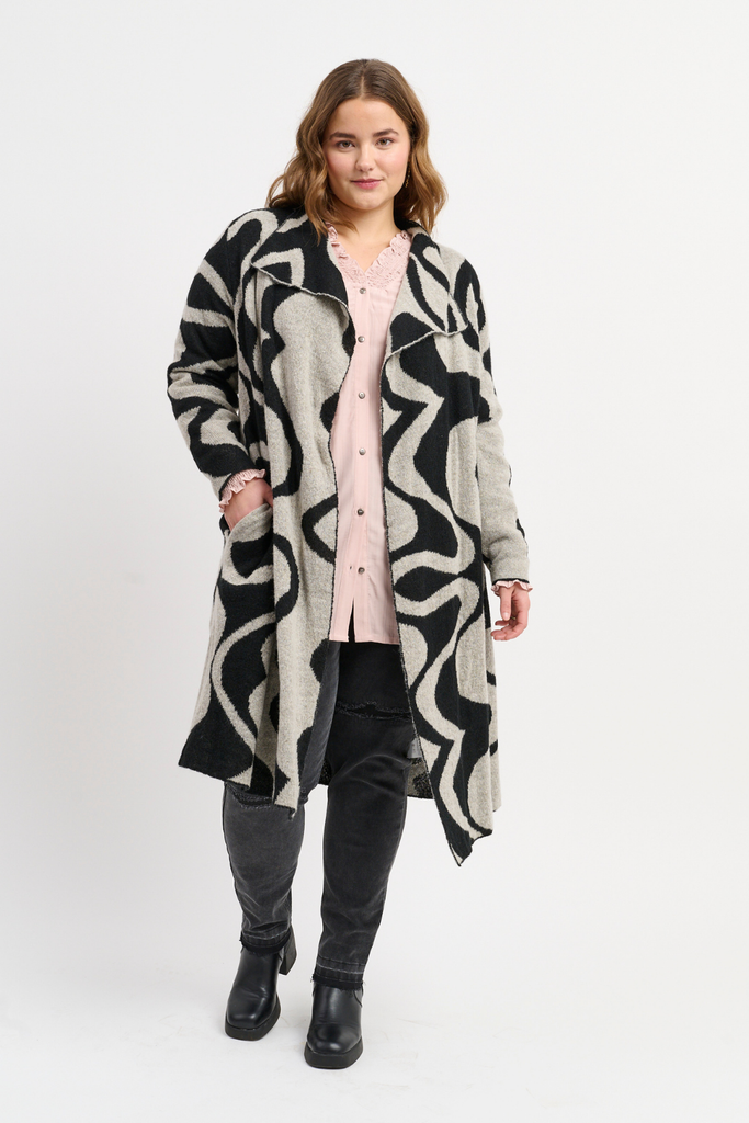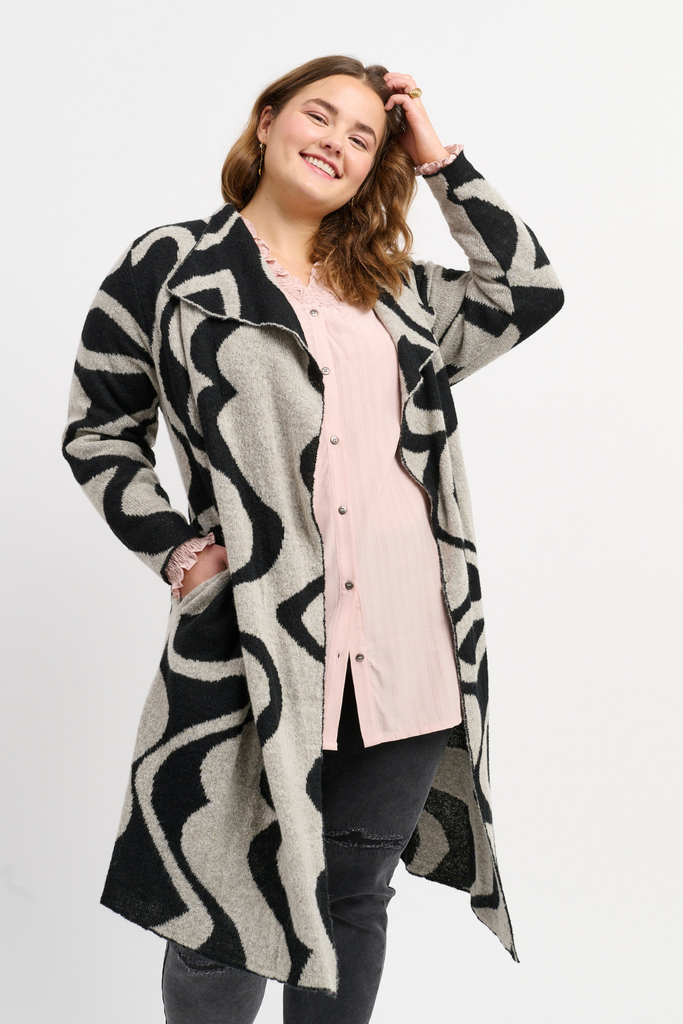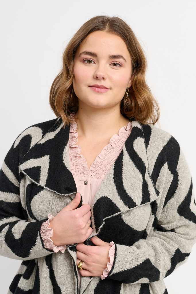 En smuk og iøjnefaldende strikcardigan fra Adia i en afslappet, oversized pasform. Designet med et markant grafisk mønster, der tilføjer et livligt og moderne udtryk, giver den kraftige strik en hyggelig og varm fornemmelse.