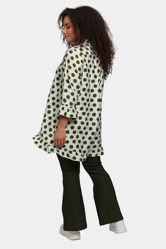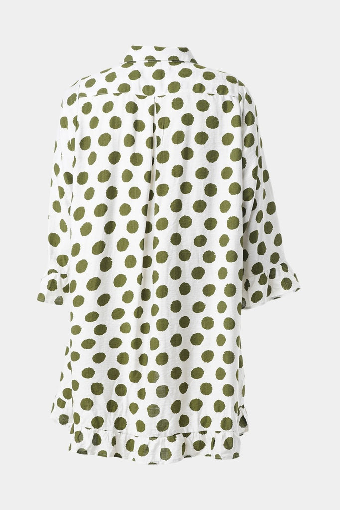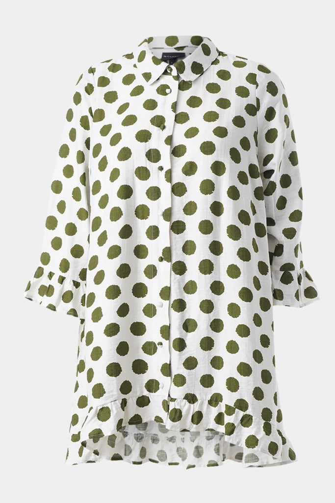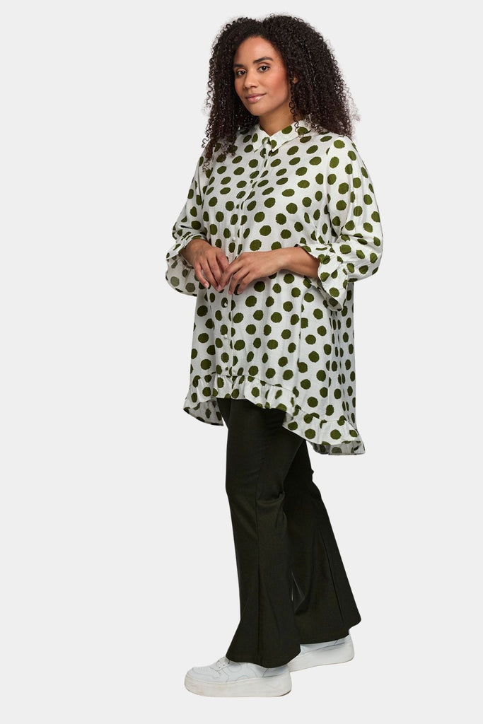 Denne feminine tunika fra Studio er fremstillet i 100 % blød, vævet viskose i frisk hvid med grønne prikker. Tunikaen har en løs, behagelig pasform og en klassisk skjortekrave, som giver et stilrent og afslappet udtryk.
