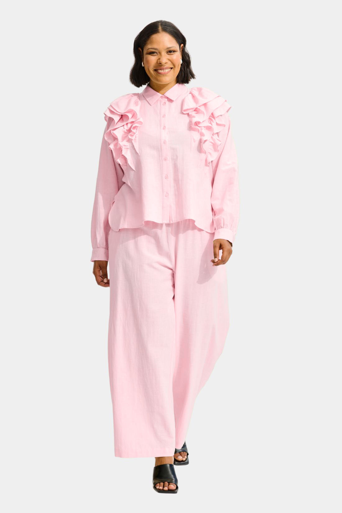 Skjorte fra Anyday i en smuk lyserød nuance, der giver et feminint og elegant udtryk. Den lette kvalitet i viskose og hør gør skjorten behagelig at have på og giver et flot, naturligt fald. De dekorative flæser foran tilfører et stilfuldt og karakterfuldt look, som gør skjorten velegnet til både hverdag og mere festlige anledninger.
