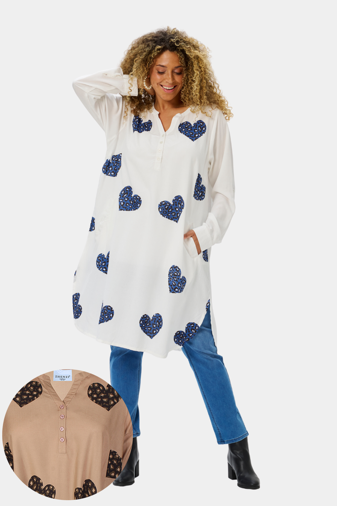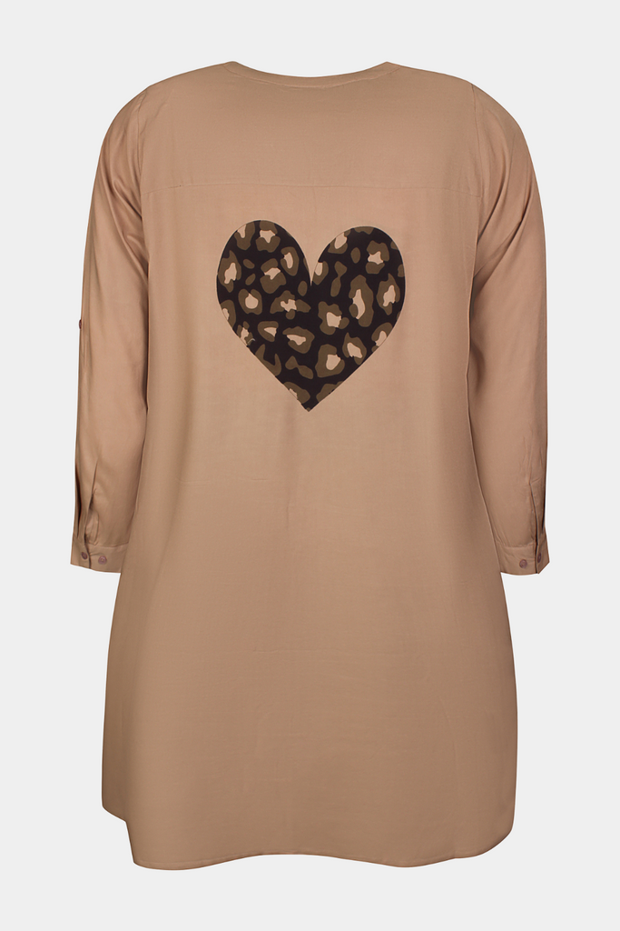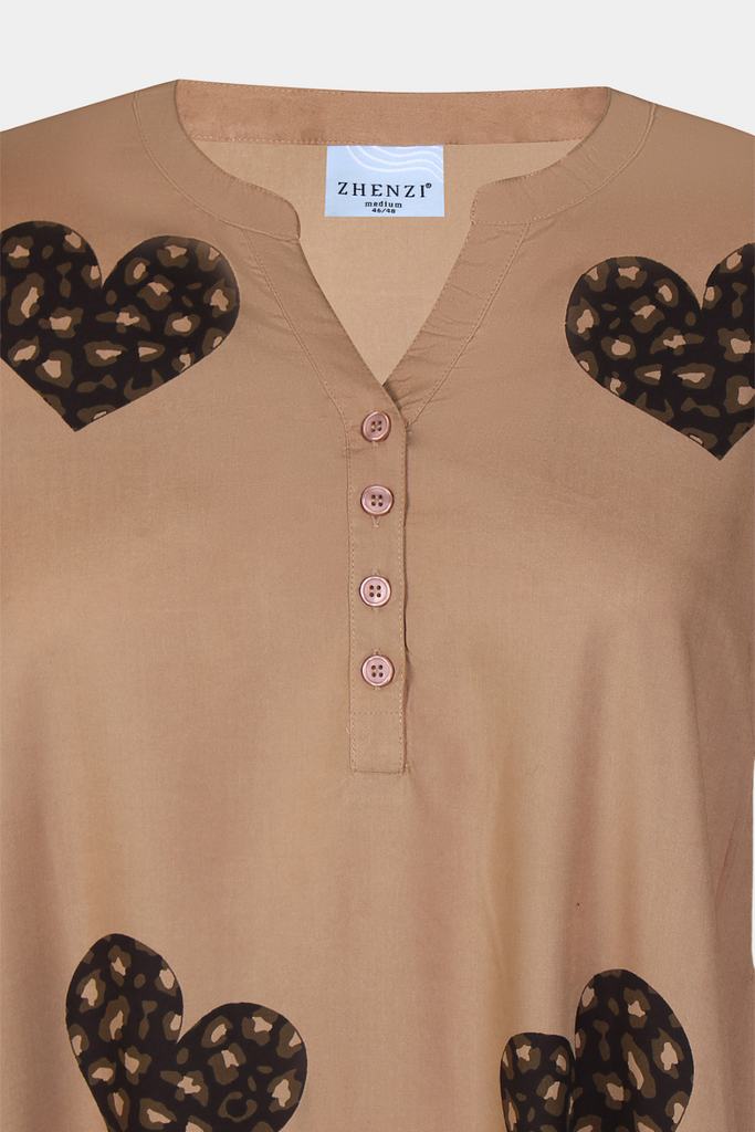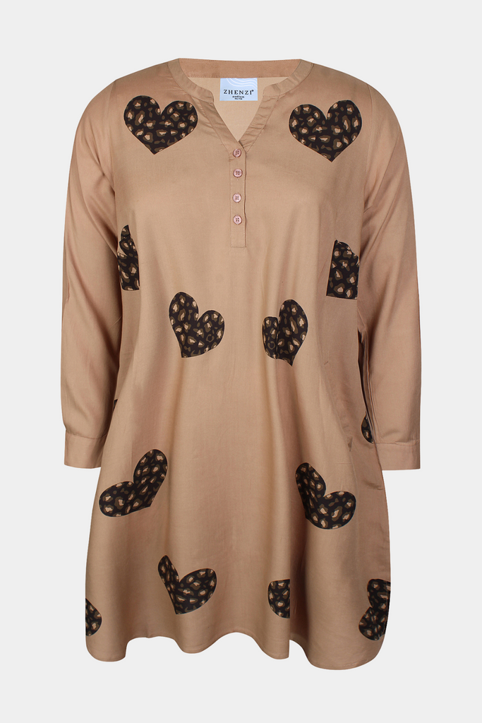 Smuk kjole fra Zhenzi i det fineste kamelbrun viskose med dyreprints hjerter
