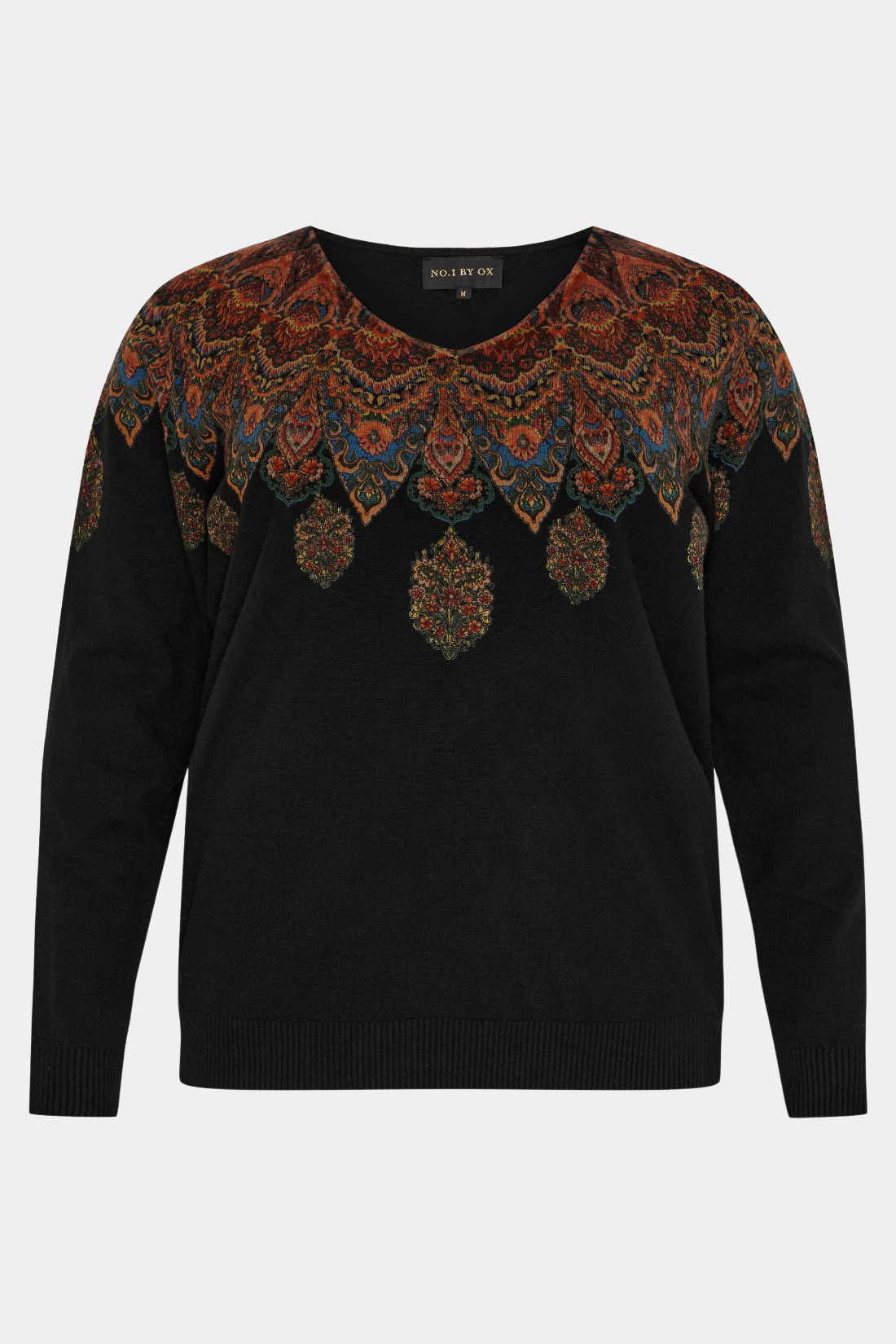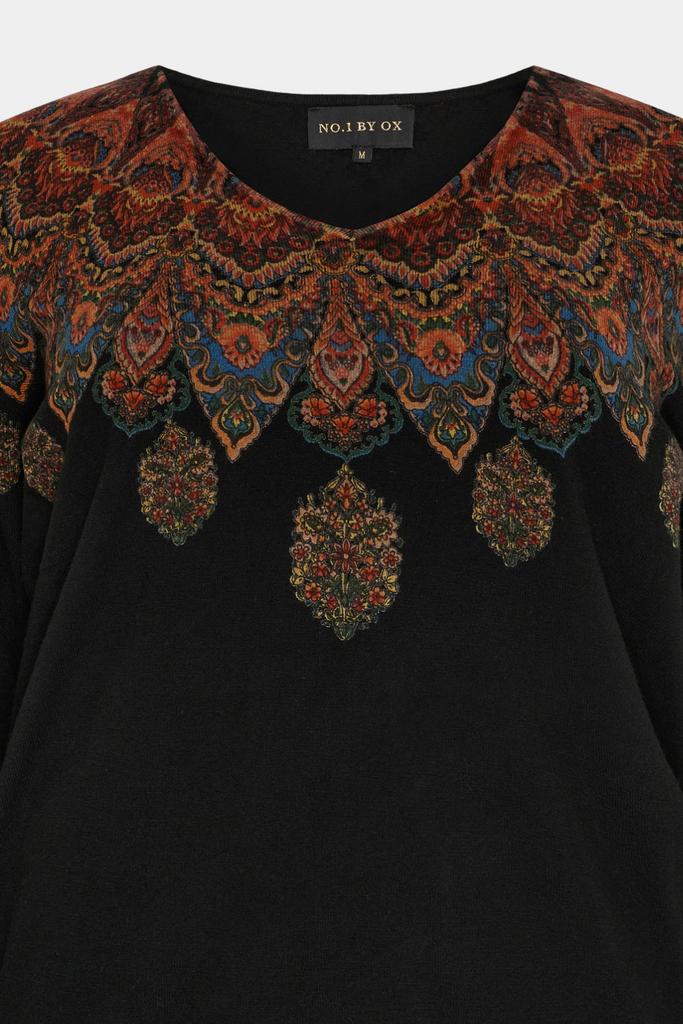Strikbluse fra No. 1 by Ox med elegant V-udskæring. Den har et smukt mønster hen over bryst, skuldre og ryg, der tilføjer farve og liv til det klassiske design.