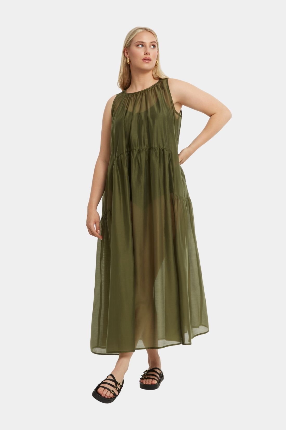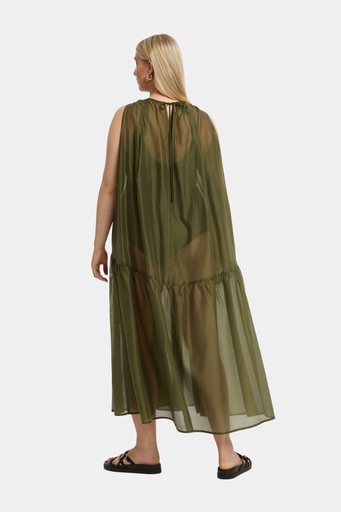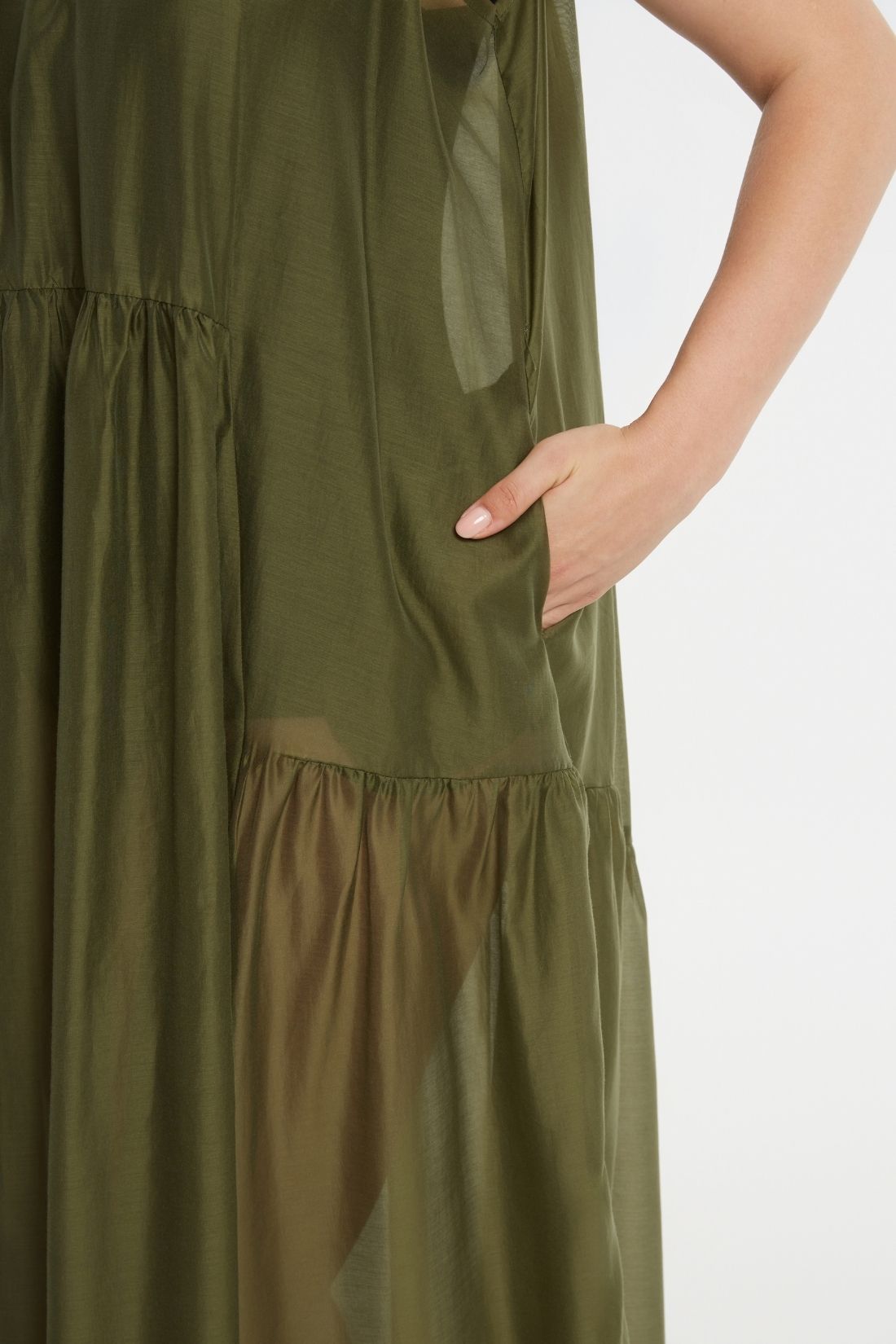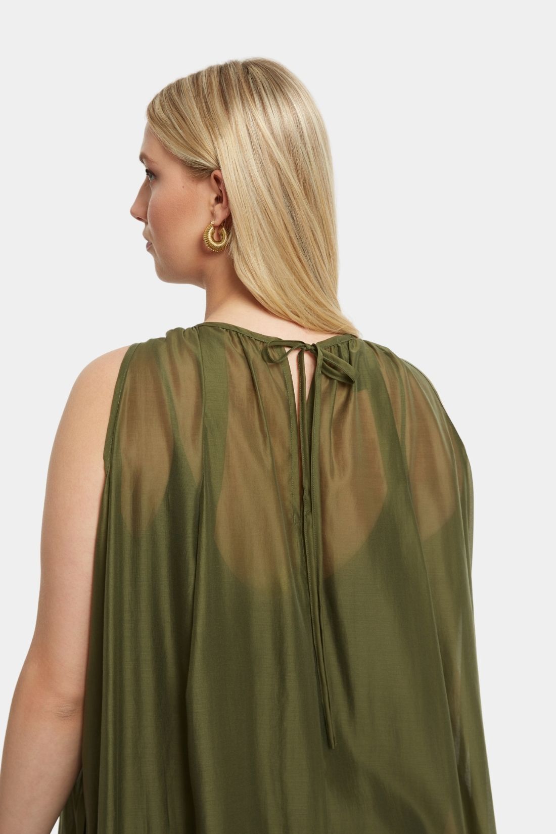 Denne kjole fra Mat Fashion er et let og elegant valg med et smukt, luftigt chiffon-look. Den transparente kvalitet giver et feminint og eksklusivt udtryk, mens den løse pasform sikrer høj komfort. Den dybe grønne farve tilfører et sofistikeret præg, og kjolen er ideel både alene med underkjole eller stylet med lag under.