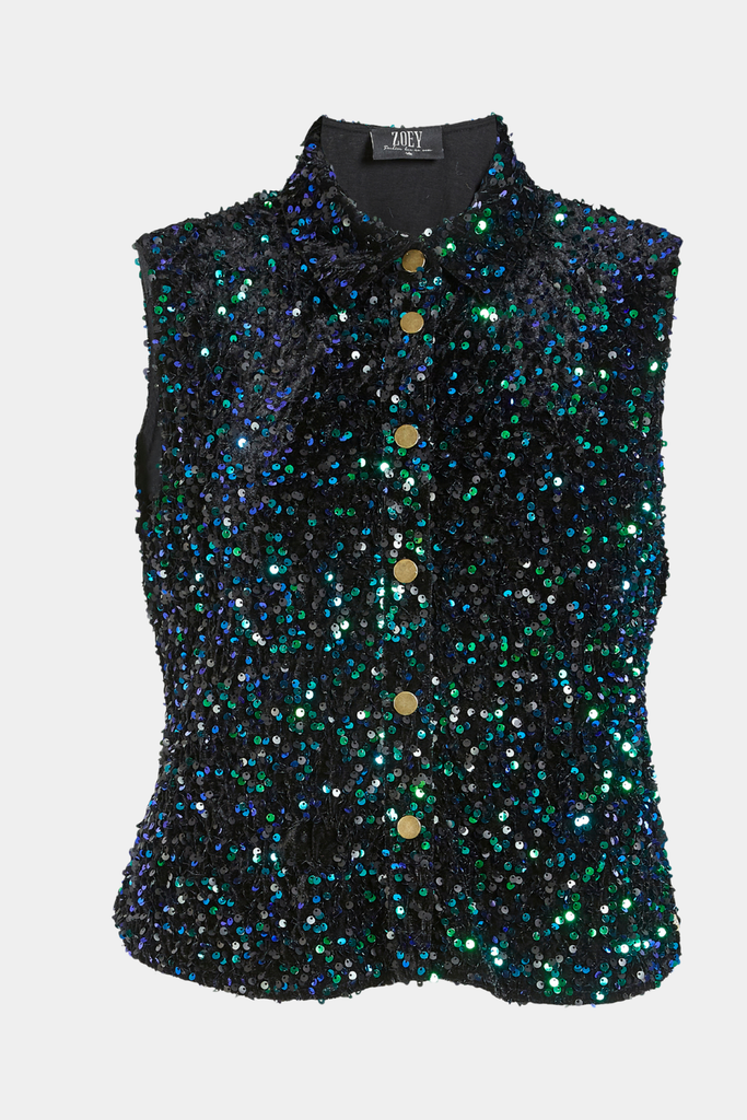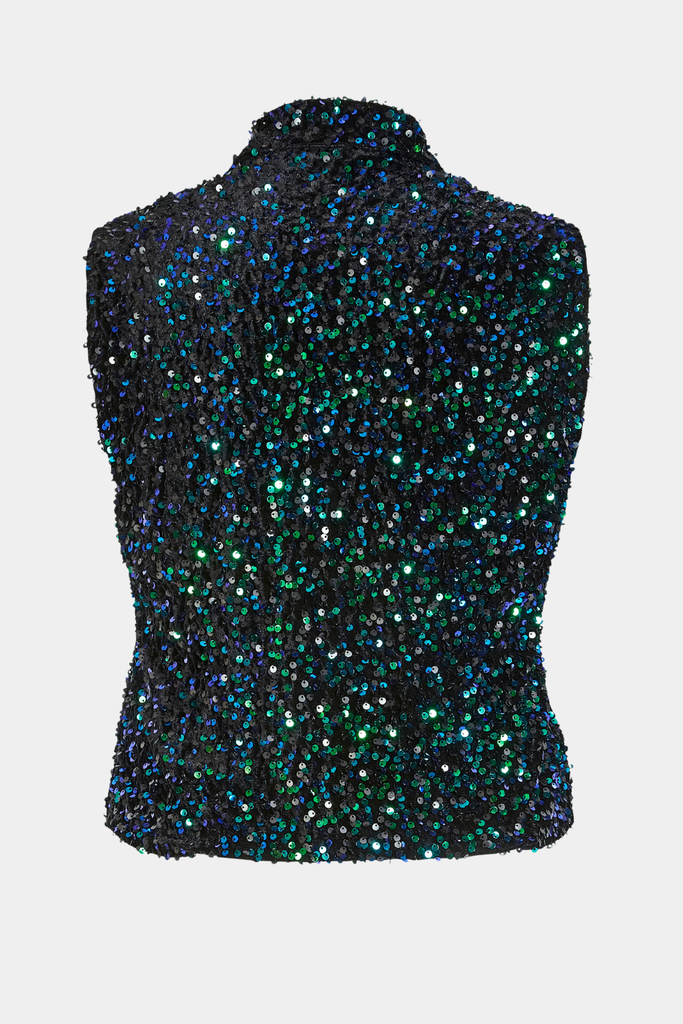 Vesten er har en traditionel krave, trykknapper foran og er dekoreret med pailletter, som giver et elegant glimt. Syet i sort velør med for i viskosejersey.