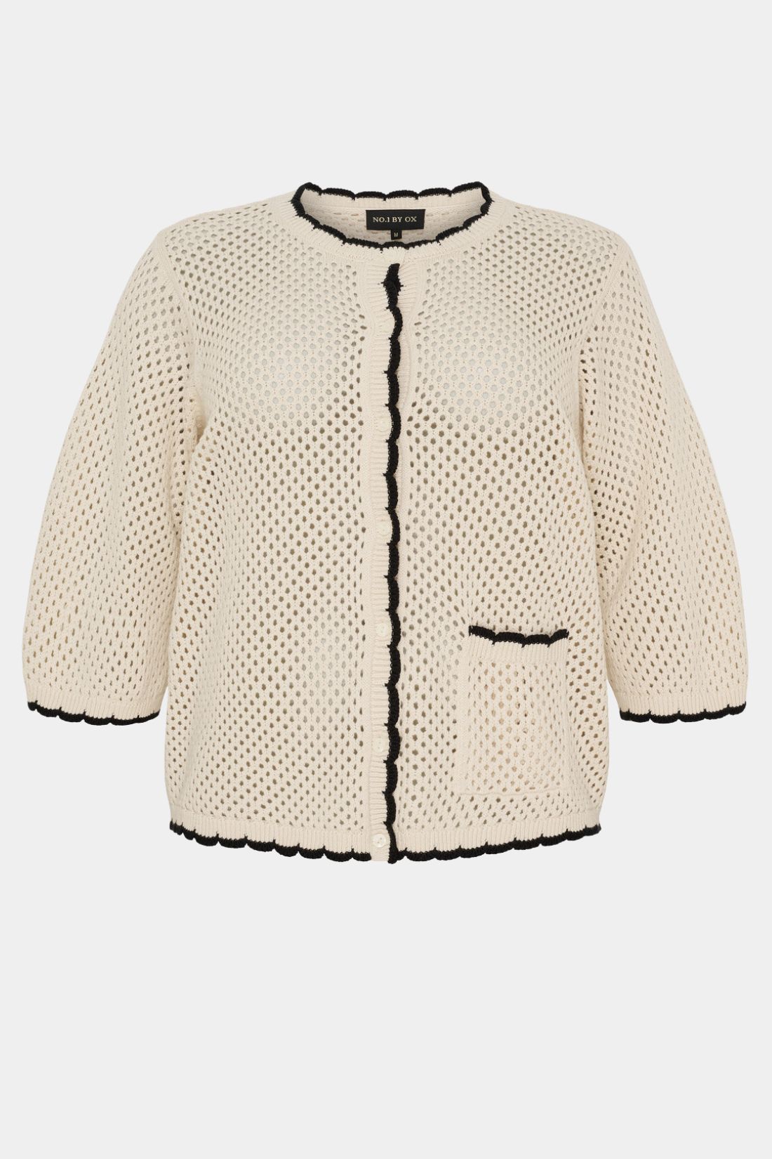 En feminin og elegant cardigan fra No. 1 by Ox i et smukt, let gennembrudt strikmønster. De fine kontrastkanter giver et sofistikeret udtryk, mens den bløde bomuldskvalitet sikrer høj komfort. Perfekt som et let lag over kjoler, toppe eller sammen med den matchende nederdel.