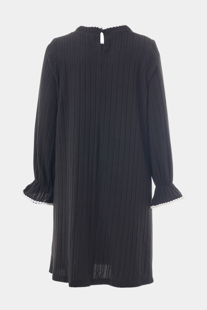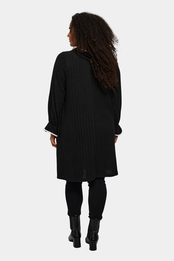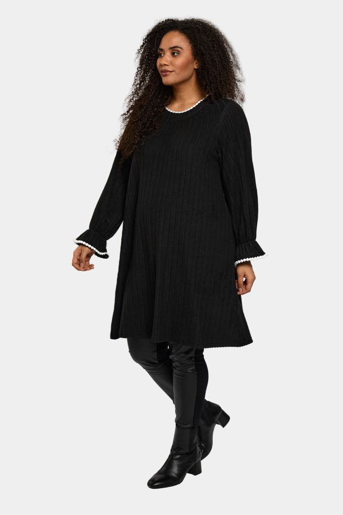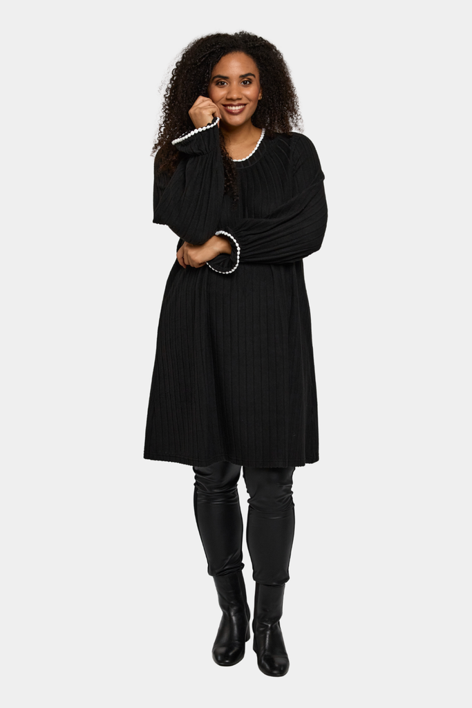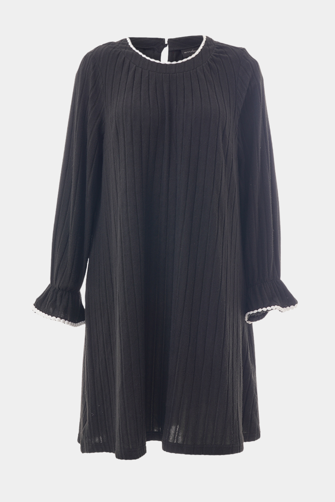 En kjole fra Studio i sort med små detaljer i hvid eller sort. Farvespillet giver et markant og moderne udtryk, der kan styles både til hverdagsbrug og særlige lejligheder.