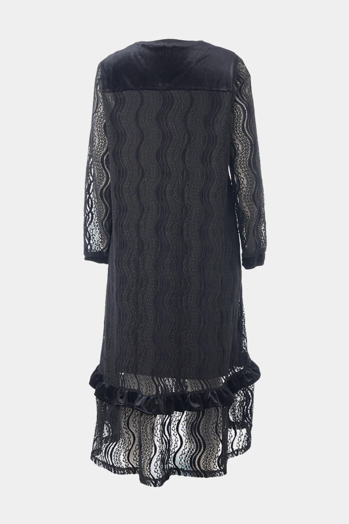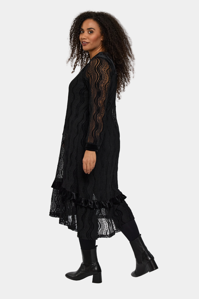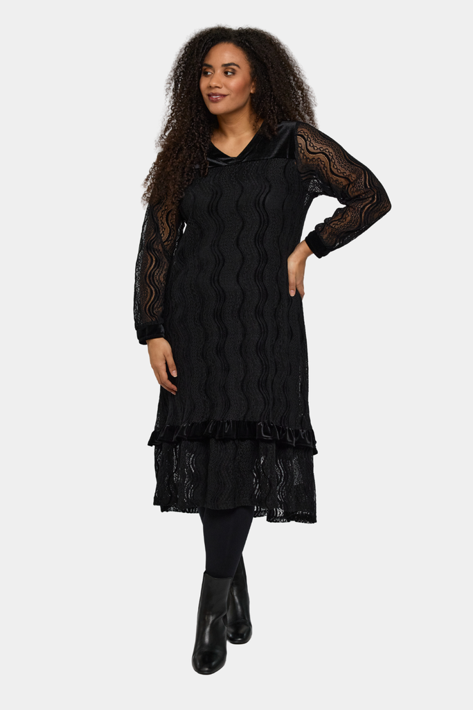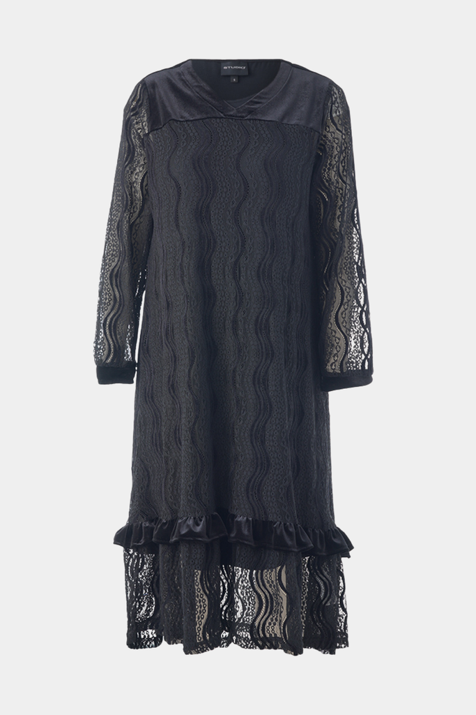 Smuk og elegant kjole fra Studio i det fineste blonde stof. Flotte detaljer på kjolen såsom velør over skuldre og på en flæse.