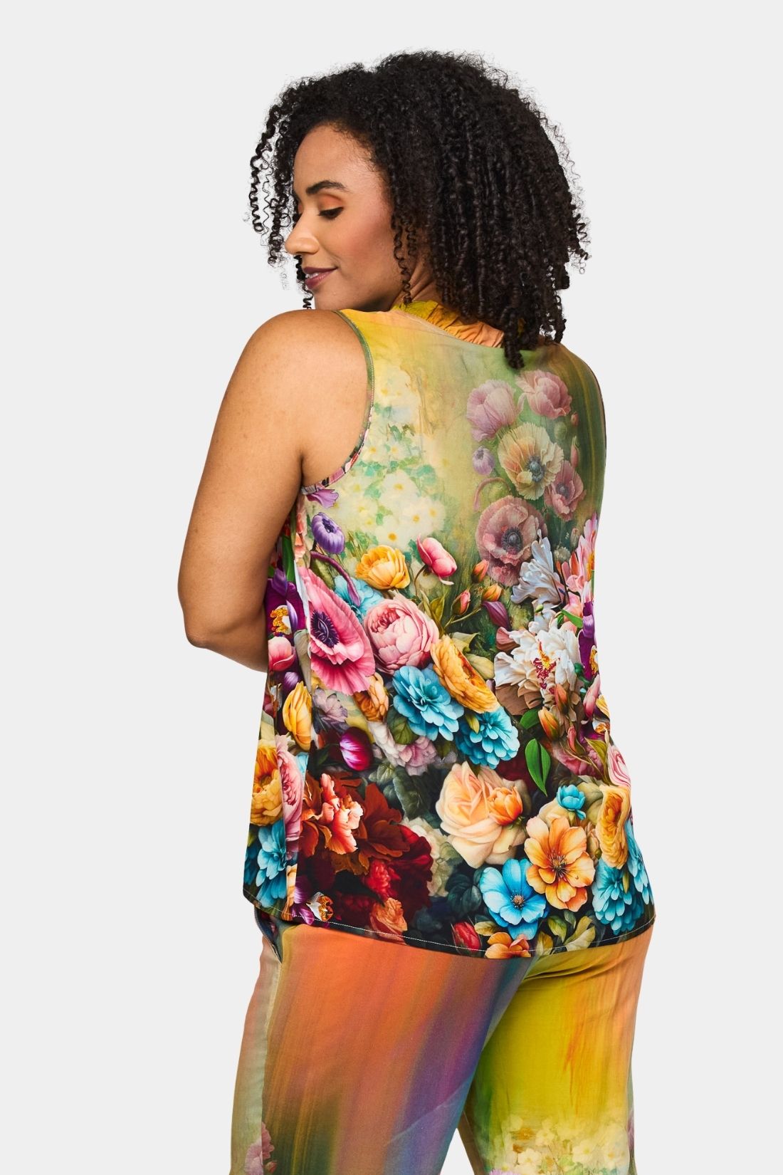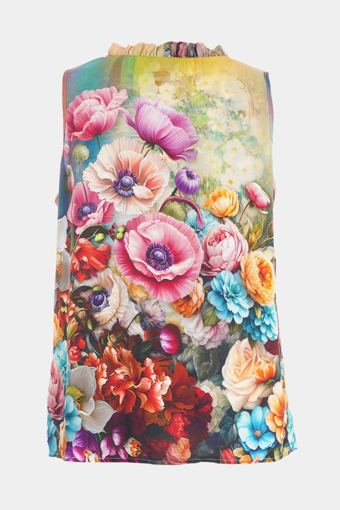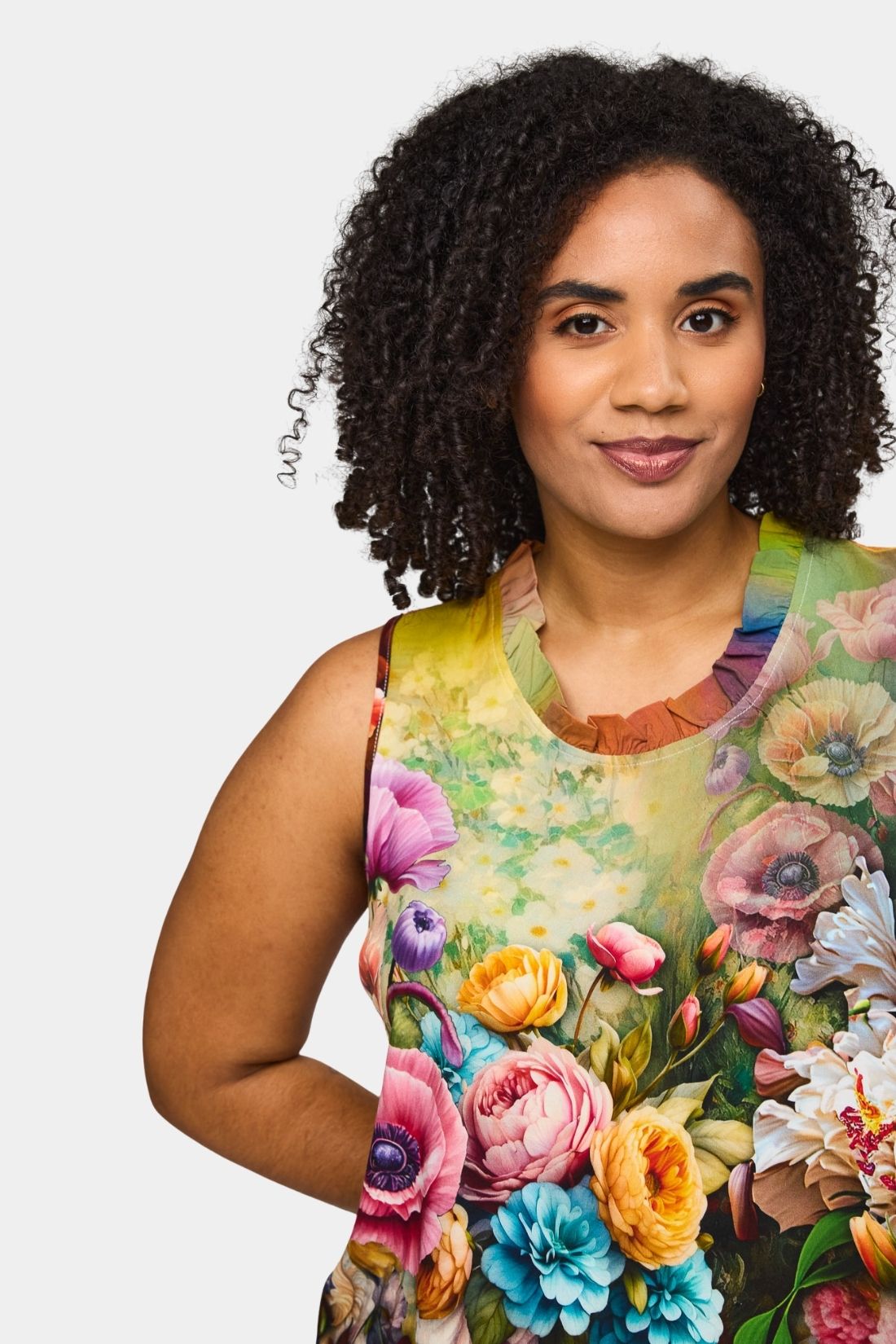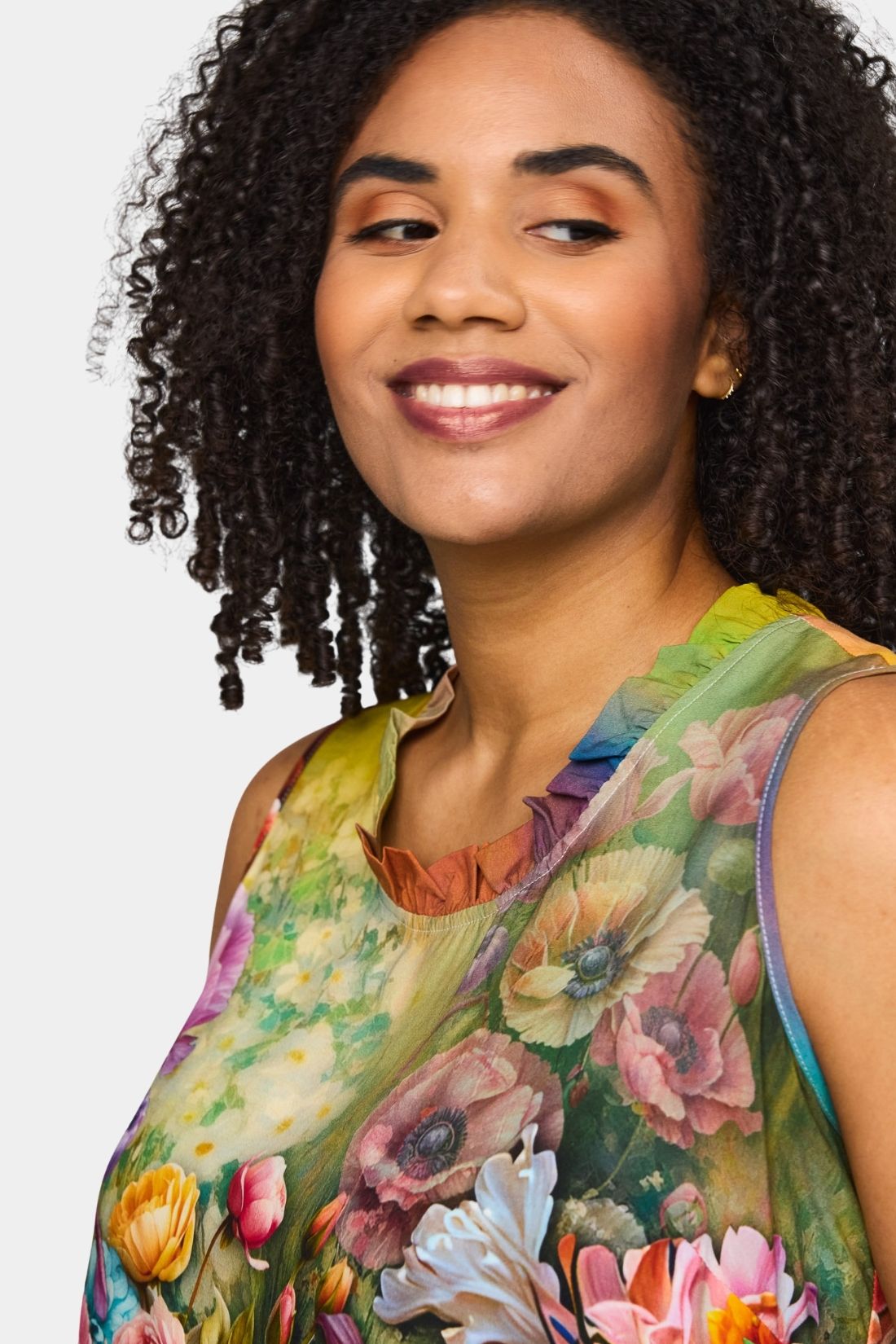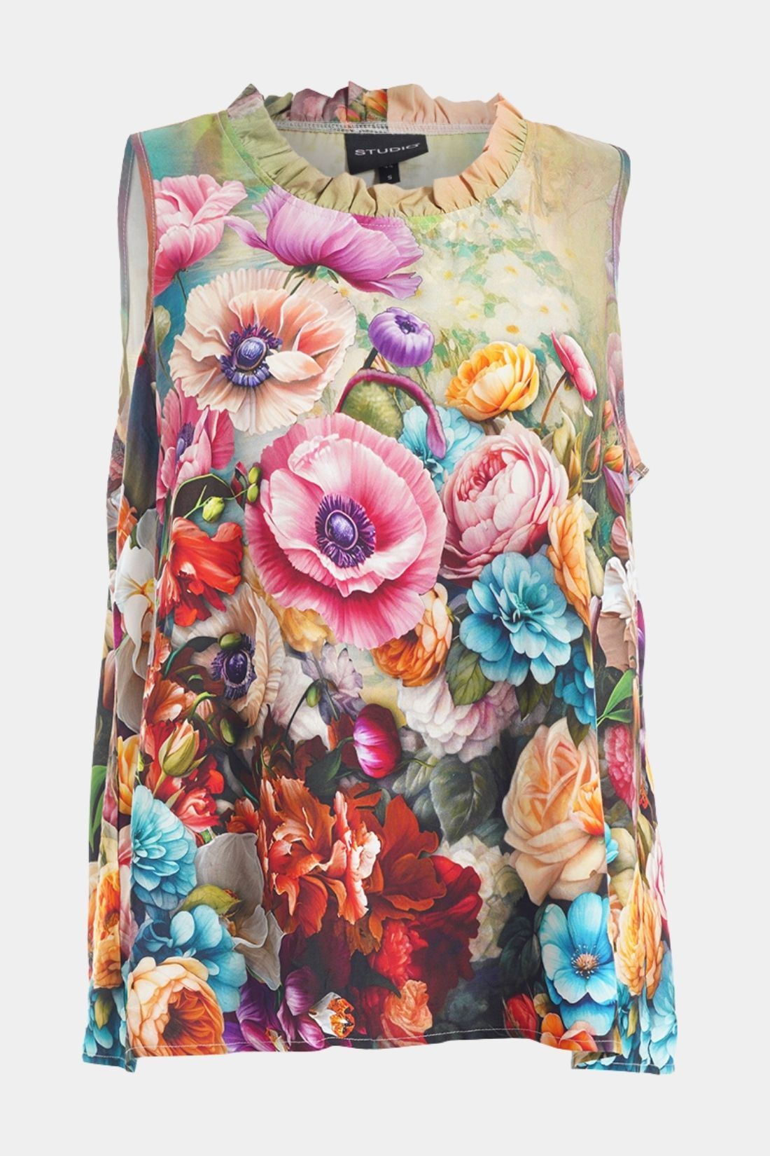 En farverig og kunstnerisk top fra Studio, der kombinerer et overdådigt blomsterprint med bløde farveovergange. Den lette viskose falder smukt og giver et luftigt og feminint udtryk, mens de fine detaljer ved halsen tilfører et elegant touch. En iøjnefaldende model, der nemt kan styles med både ensfarvede bukser og nederdele.