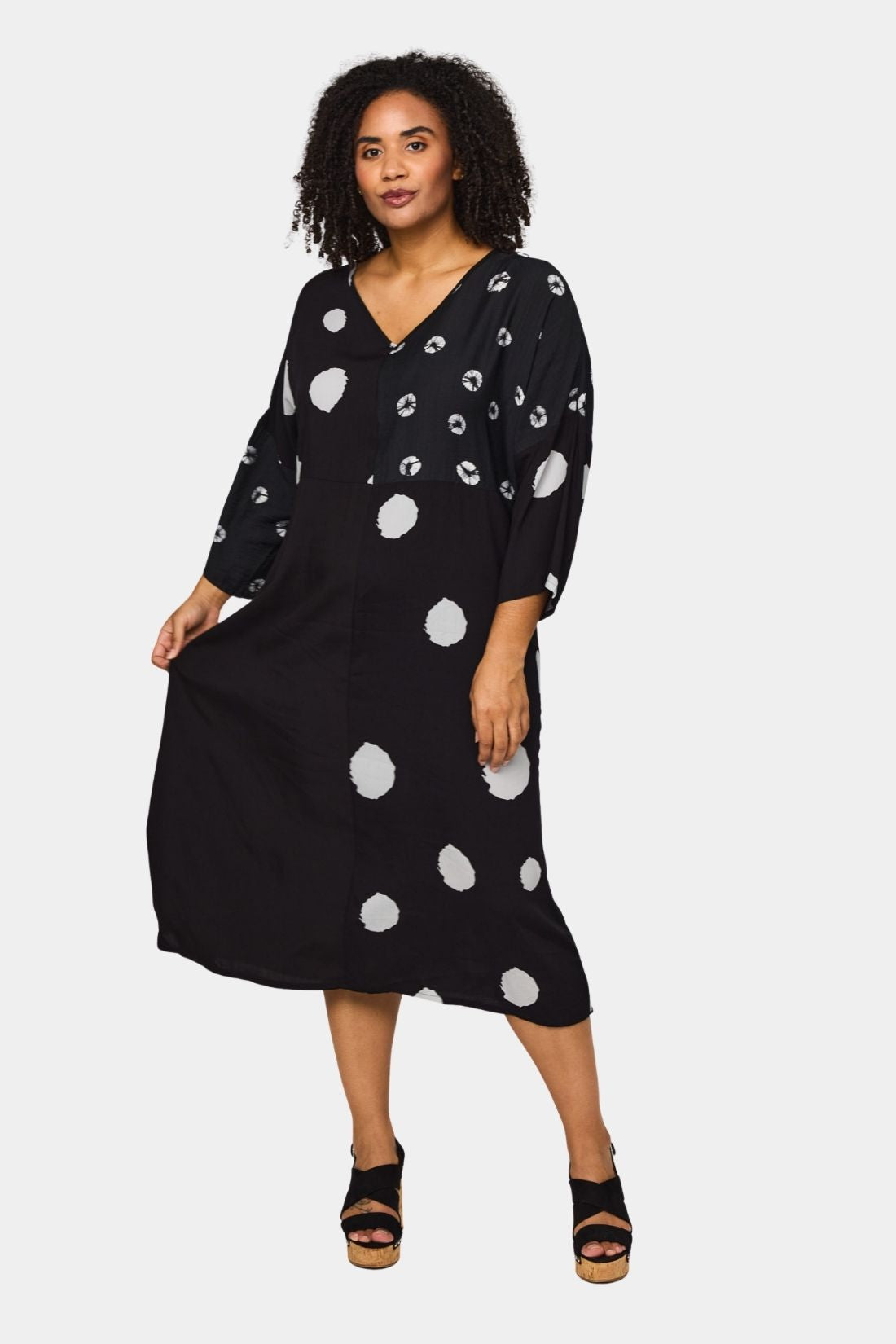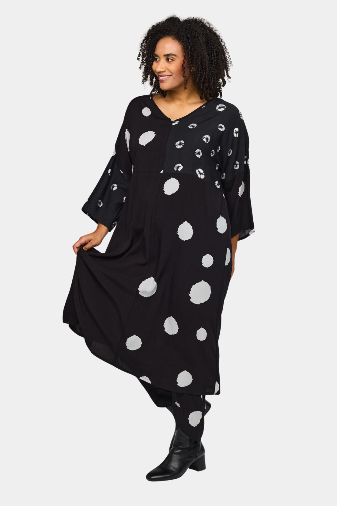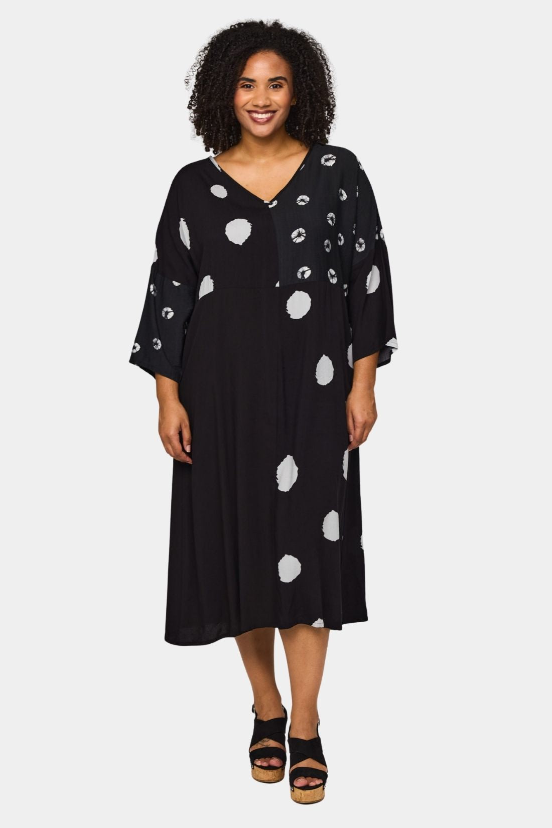 En smuk og alsidig kjole fra Studio med et afslappet og grafisk udtryk der er nem at bruge i hverdagen. Den løse A formede silhuet falder blødt omkring kroppen og giver en rummelig og behagelig pasform, mens sammensætningen af forskellige print skaber et flot og levende udtryk.