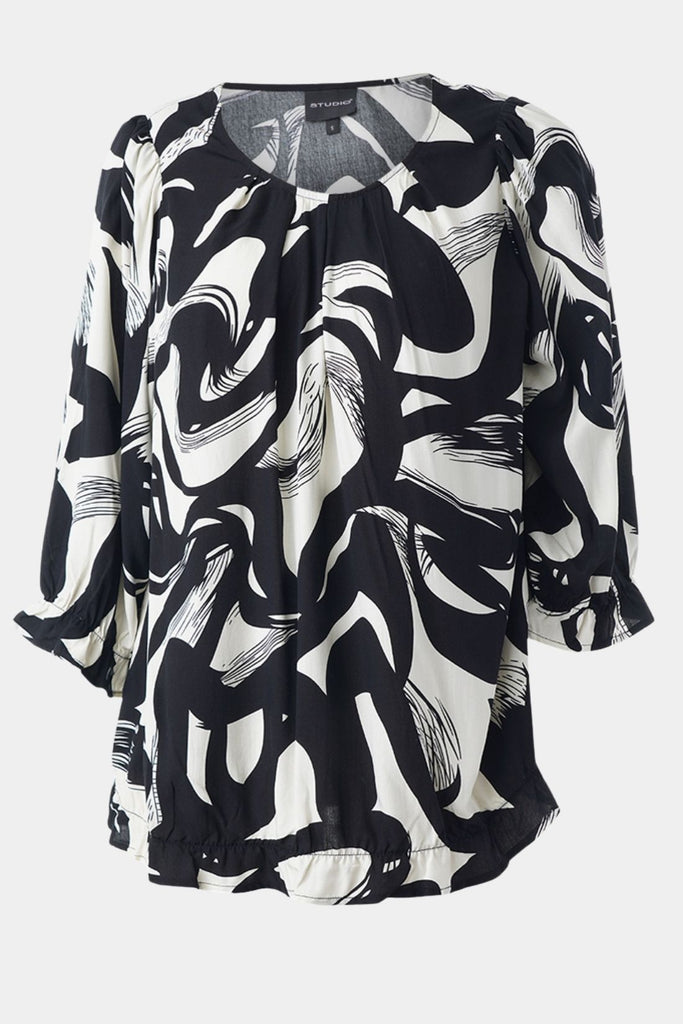 En let og behagelig bluse fra Studio, fremstillet i 100 % vævet viskose med et moderne grafisk print. Blusen er designet i en løs og komfortabel pasform med rund halsudskæring og 3/4-ærmer, som giver et let, feminint og afslappet udtryk. Det glatte materiale falder flot og fremhæver printets karakter på elegant vis.