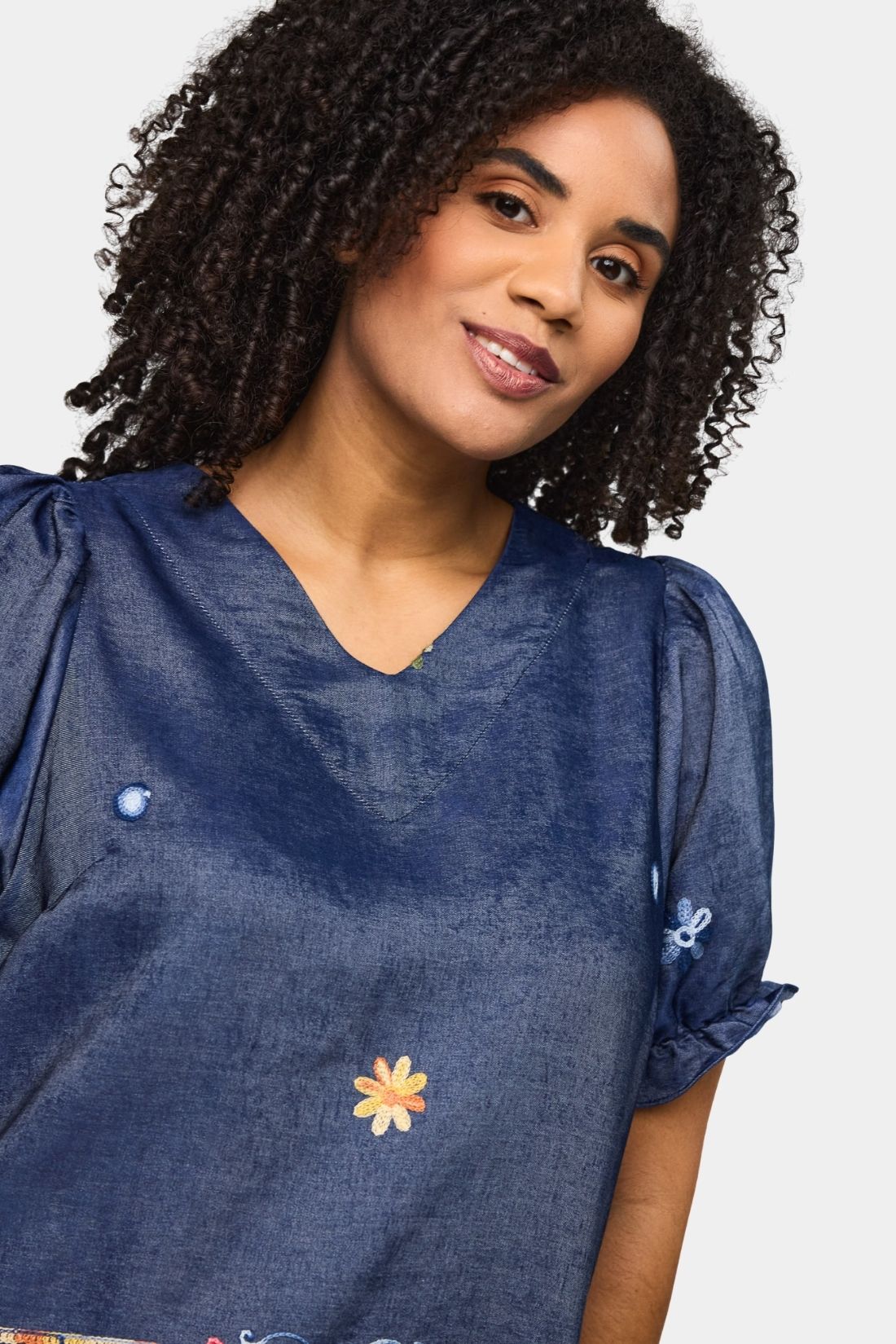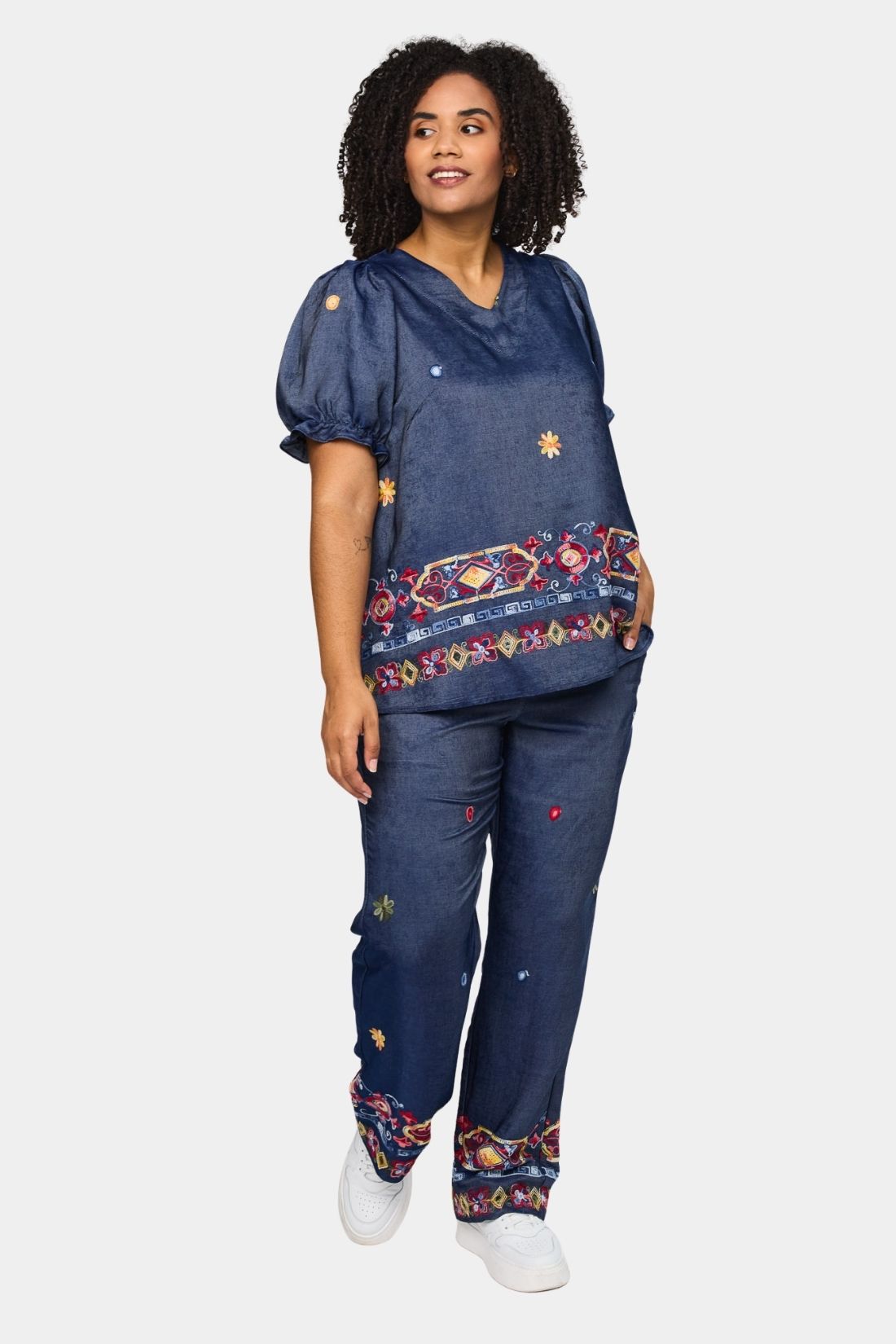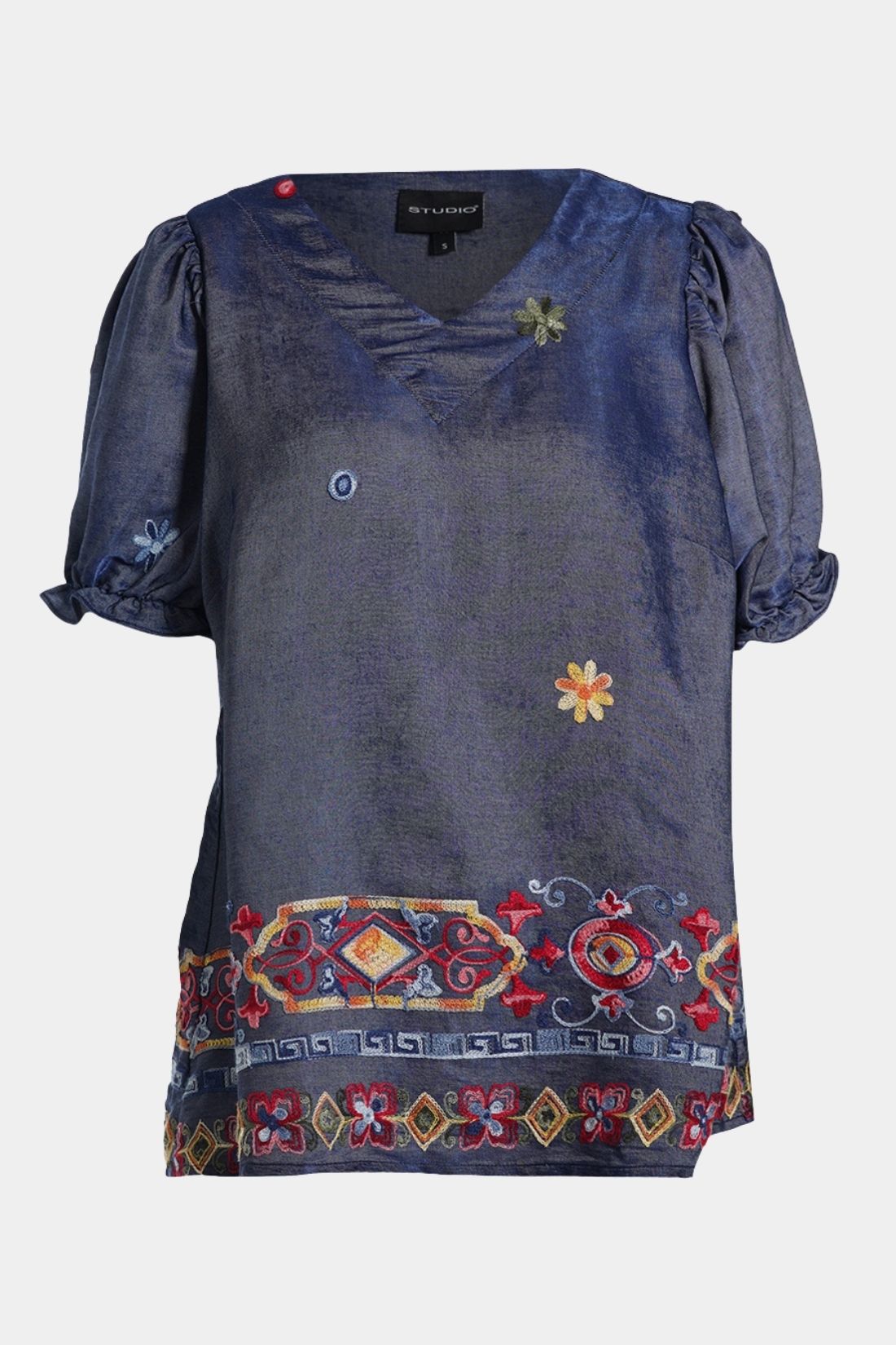En feminin og karakterfuld bluse fra Studio i en smuk denimblå nuance med farverige broderidetaljer. Den lette kvalitet falder blødt og giver et elegant udtryk, mens de dekorative mønstre forneden tilfører personlighed og et kunstnerisk twist. En stilfuld bluse, der nemt kan matches med både jeans og ensfarvede bukser.