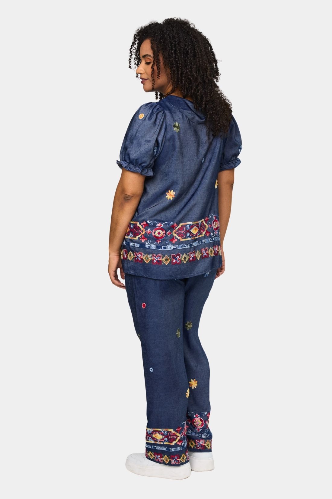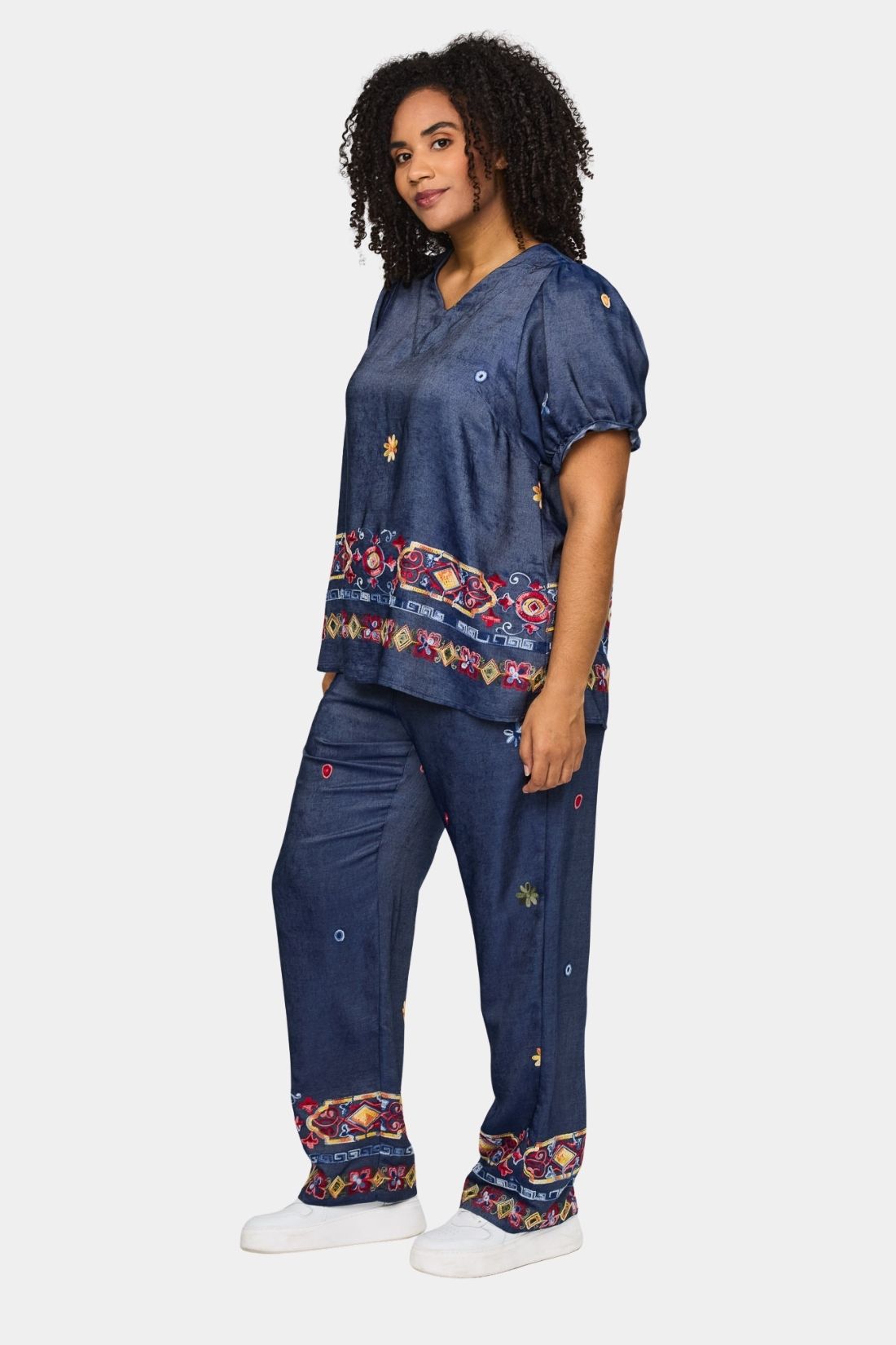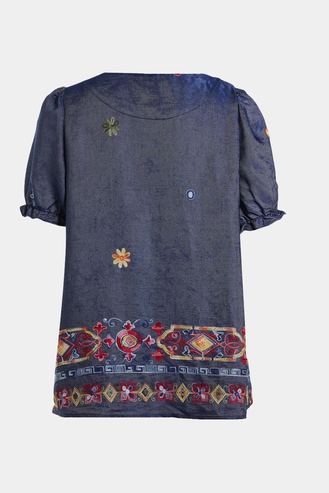 En feminin og karakterfuld bluse fra Studio i en smuk denimblå nuance med farverige broderidetaljer. Den lette kvalitet falder blødt og giver et elegant udtryk, mens de dekorative mønstre forneden tilfører personlighed og et kunstnerisk twist. En stilfuld bluse, der nemt kan matches med både jeans og ensfarvede bukser.