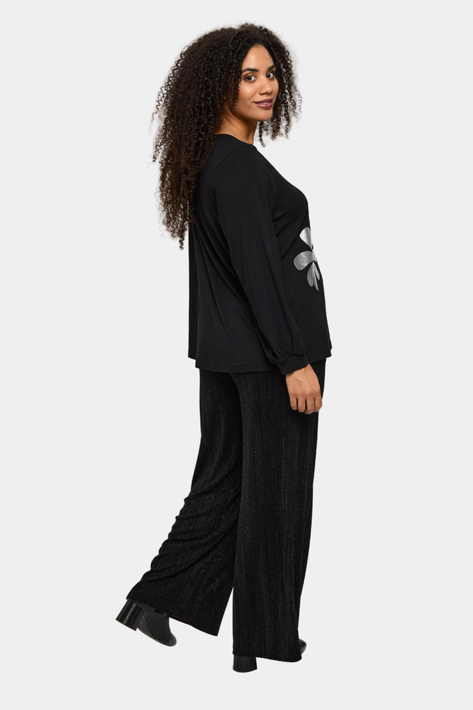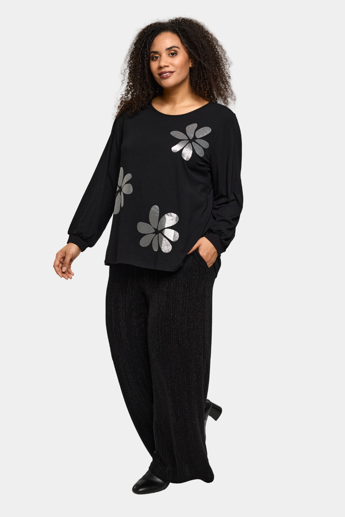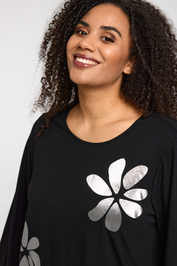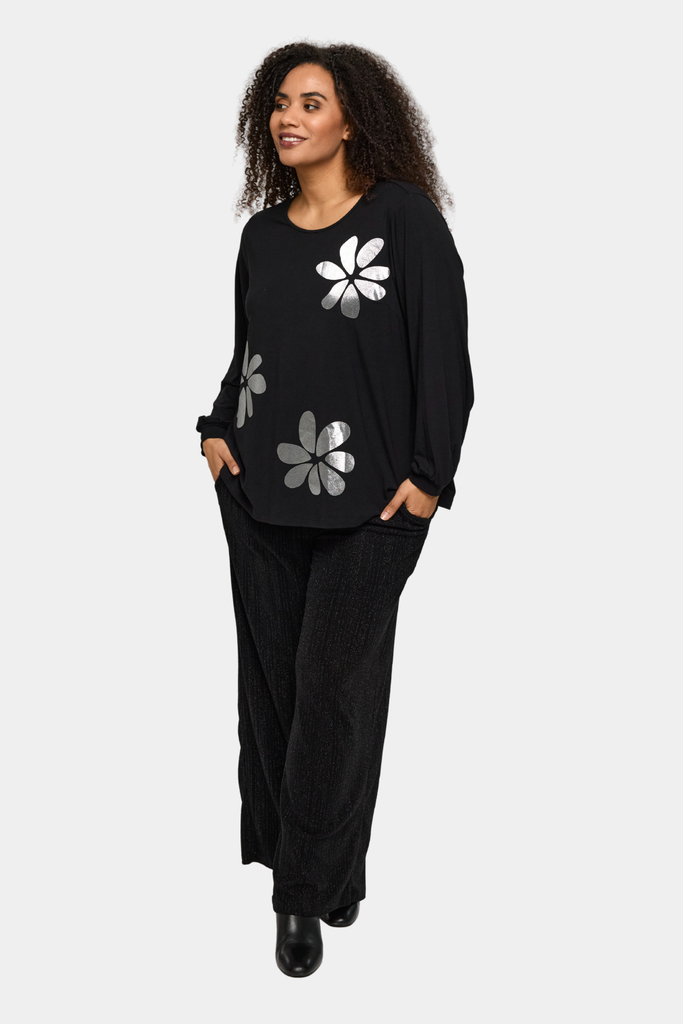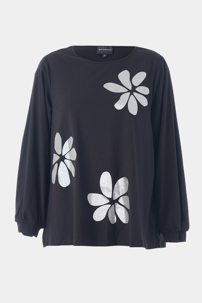Smuk bluse fra Studio syet i viskosejersey med sølv blomst på forsiden