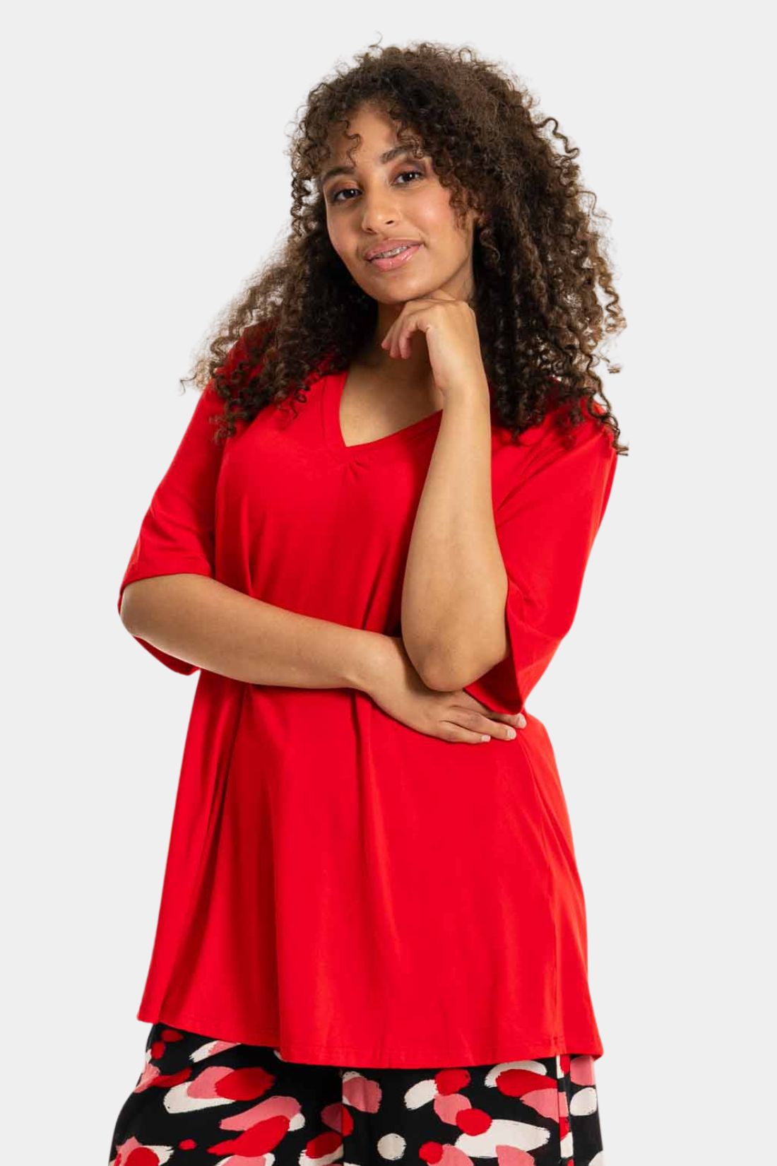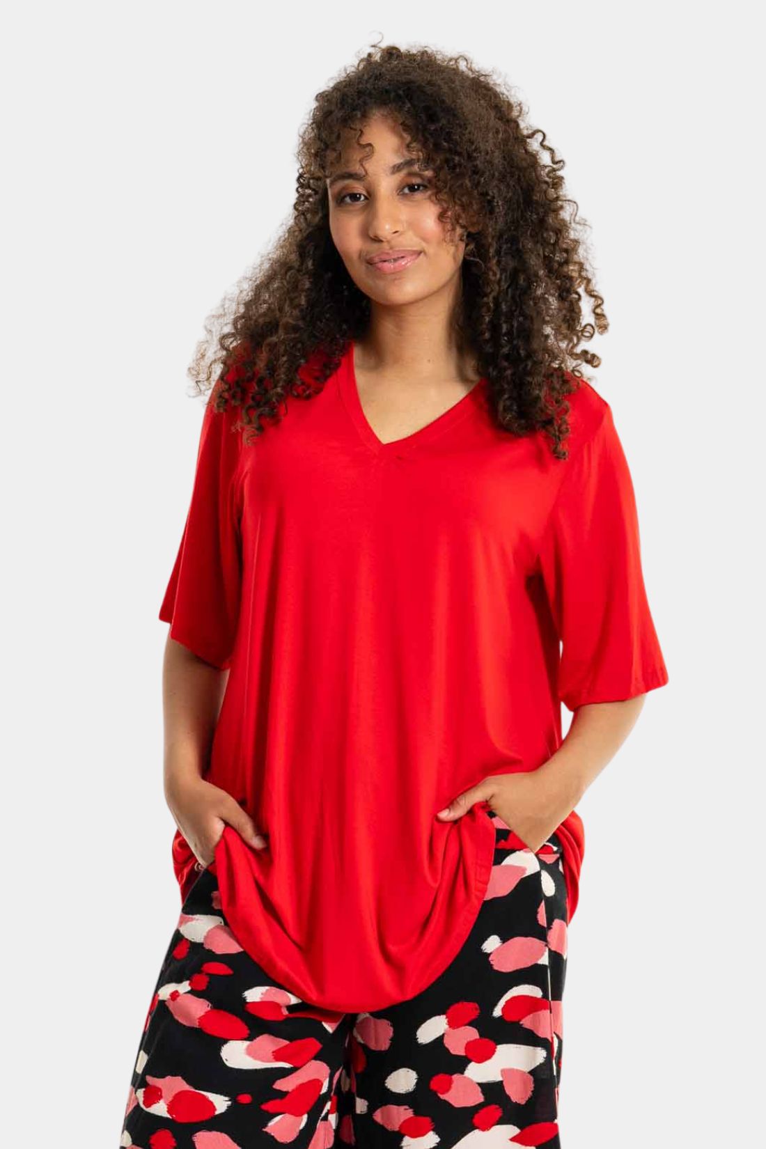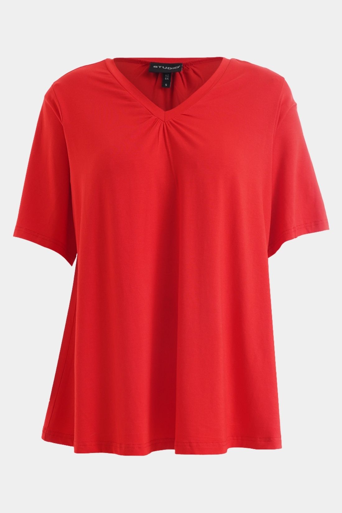En virkelig dejlig og behagelig T-shirt fra Studio, syet i en kvalitetsrig viskosejersey med et blødt og fleksibelt fald. Modellen har en feminin V-udskæring, påsyede ærmer og en god A-facon, der giver en flatterende og komfortabel pasform.