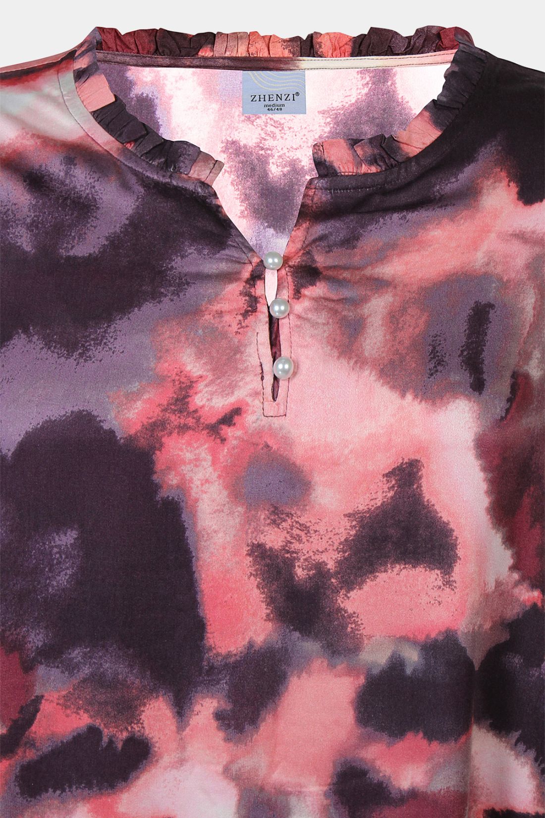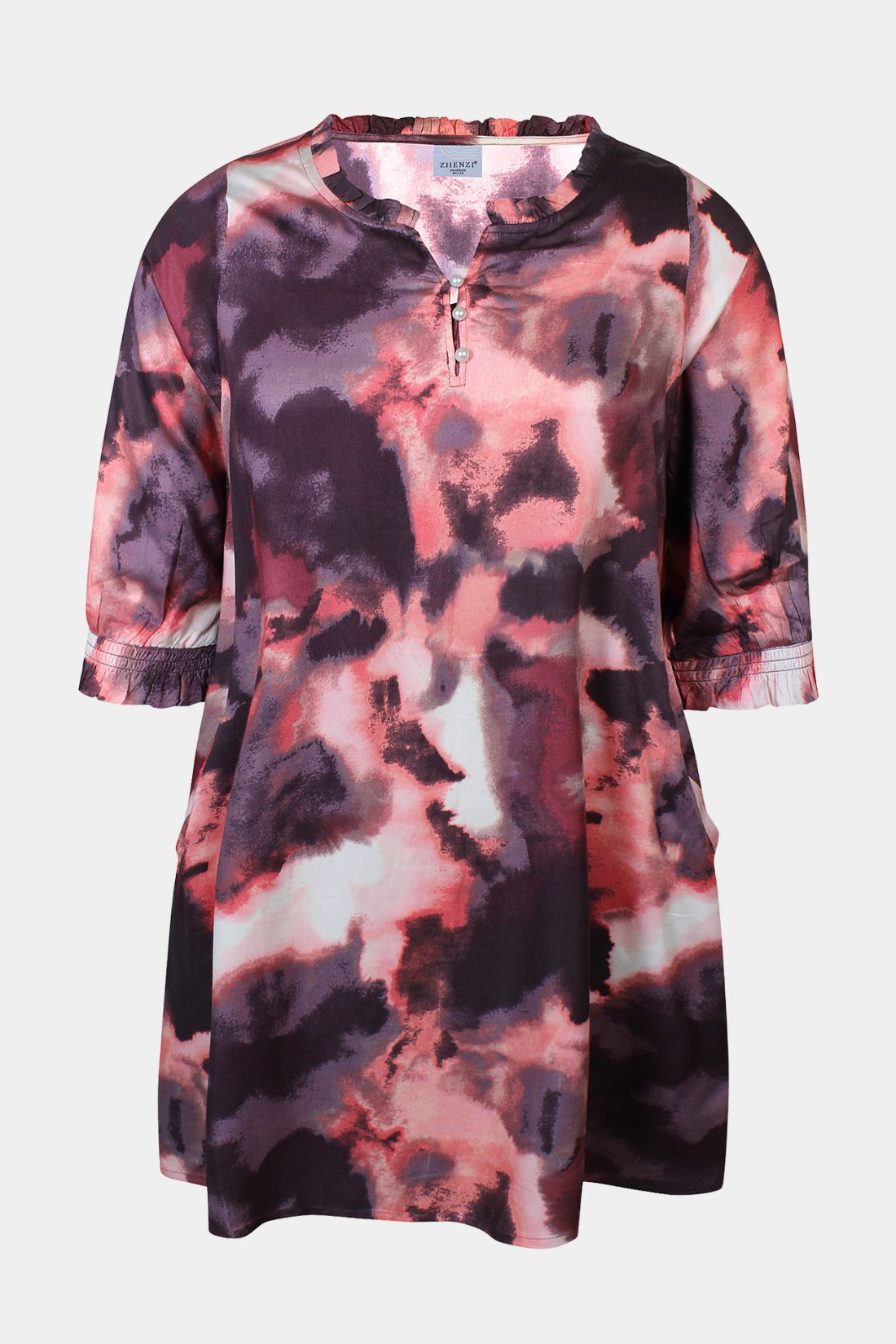ANIKA er en stilfuld og komfortabel tunika fra Zhenzi, designet i 100 % viskose med et drømmende all-over print i bløde nuancer. Modellen har en feminin V-udskæring med elegante perleknapper, som tilfører et fint og eksklusivt touch til det afslappede design.