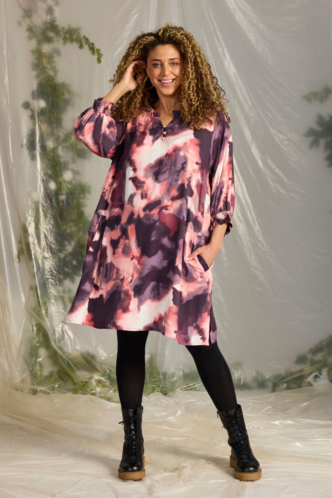 Tunikaen er udstyret med 3/4-lange ærmer med smockkant, der giver både komfort og en flot silhuet. Praktiske sidelommer og et blødt fald gør den ideel til både hverdagsbrug og pænere lejligheder.