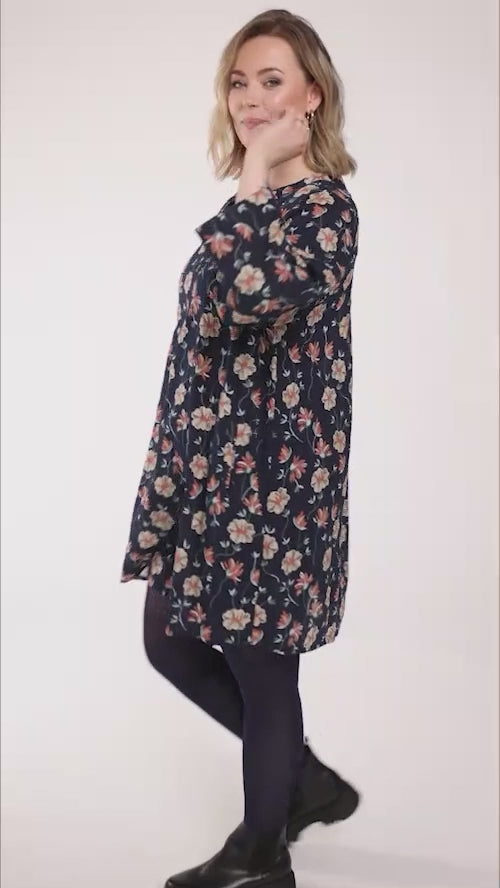 En let og behagelig tunika fra Gozzip, fremstillet i blød 100 % viskose med et smukt navyprint med lyse, organiske former. Modellen har rund hals med lille V-slids og et afslappet snit i en let A-form, som giver både god bevægelse og et elegant fald. Den mellemlange længde gør tunikaen alsidig – brug den som tunika over bukser eller som en kort kjole.
